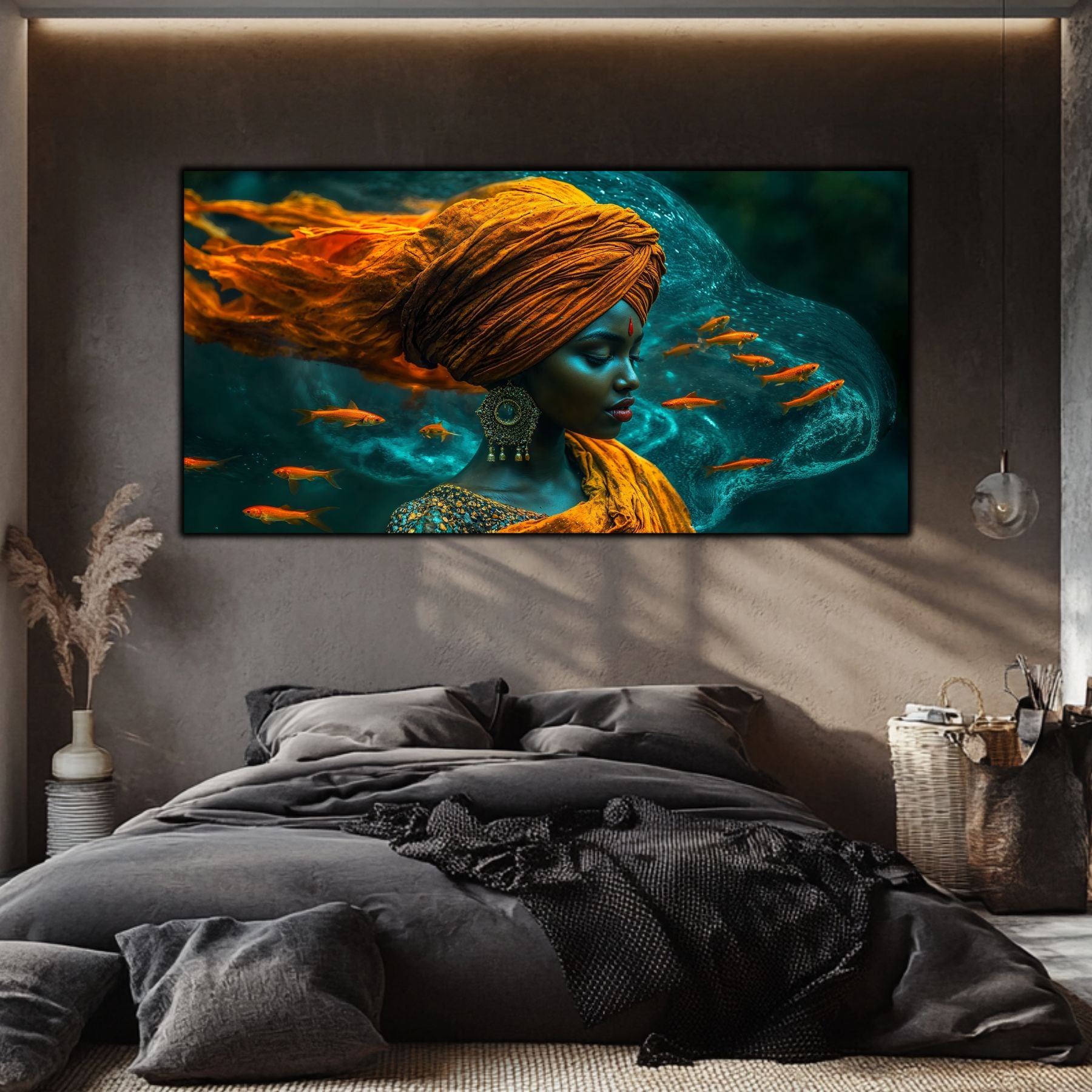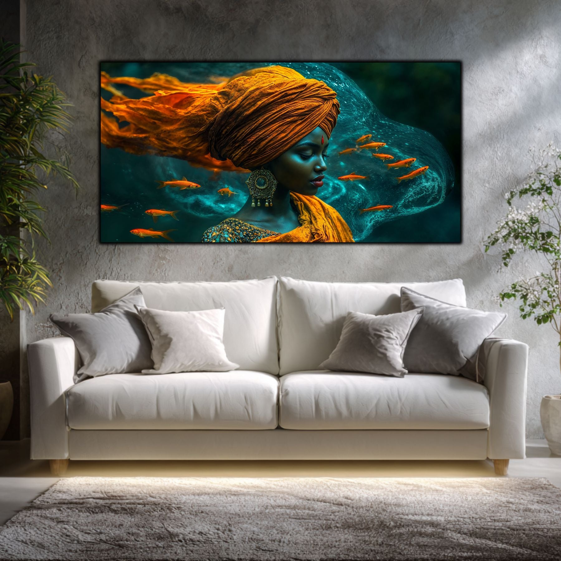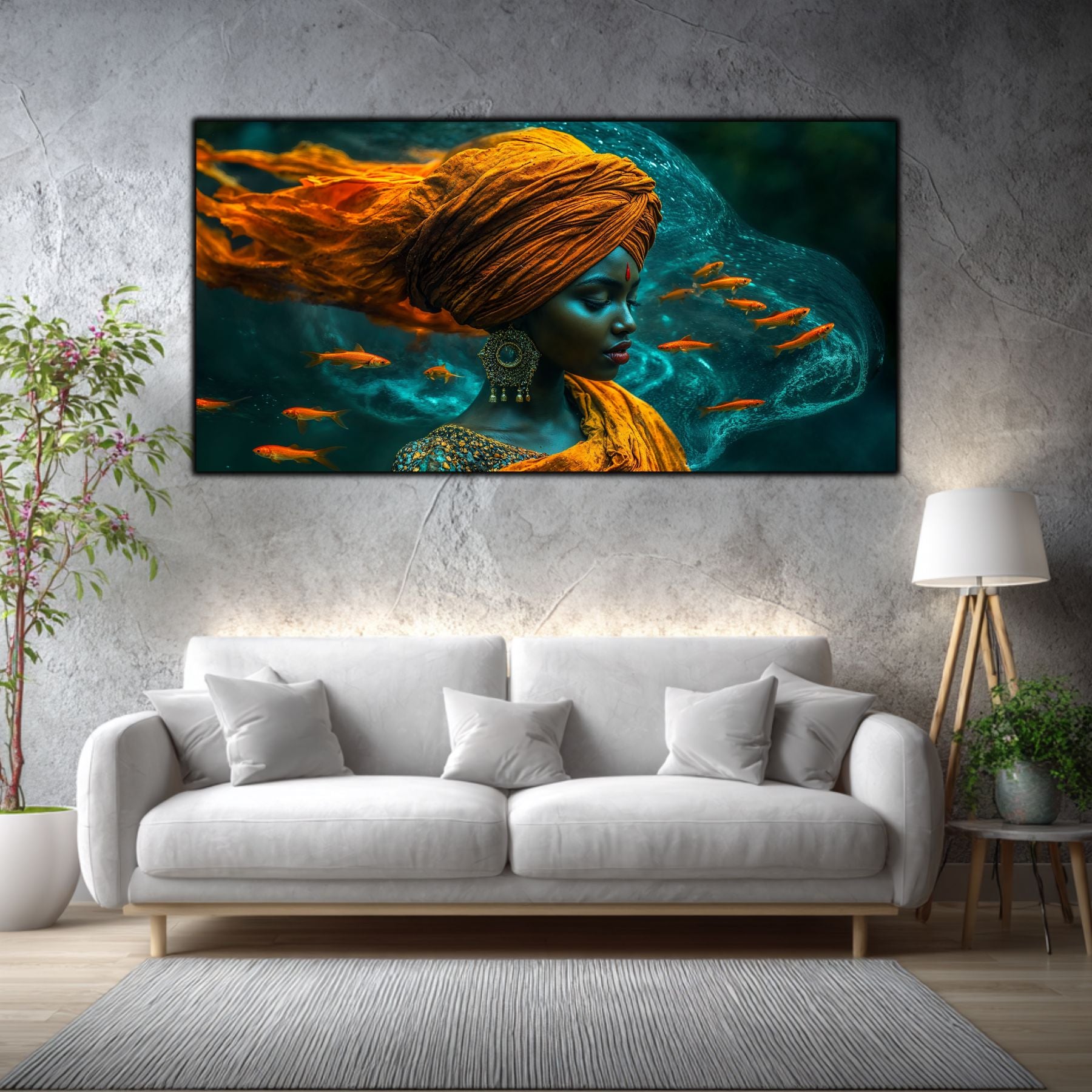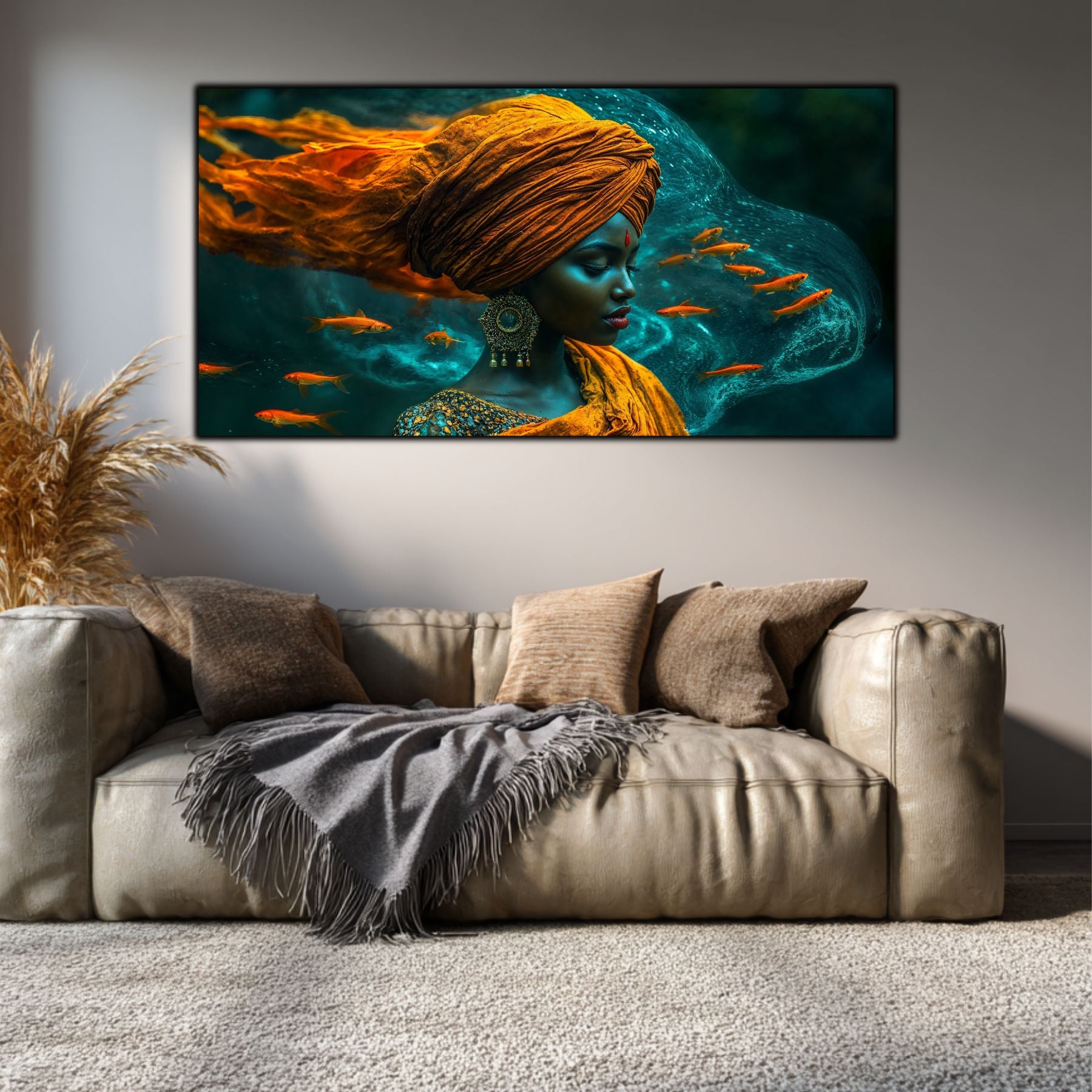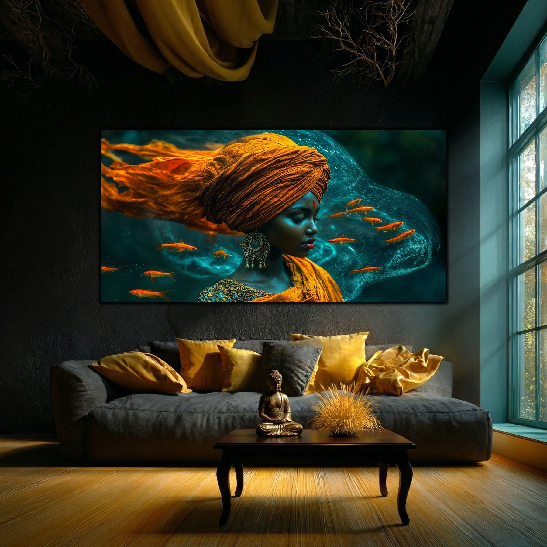 Cromatică și Textură: Nuanțele de albastru abisal, turcoaz și accentele de aur sunt puse în valoare de luciul sticlei. Apa pare să aibă o fluiditate reală, iar chipul meditativ devine o ancoră de calm în orice încăpere.