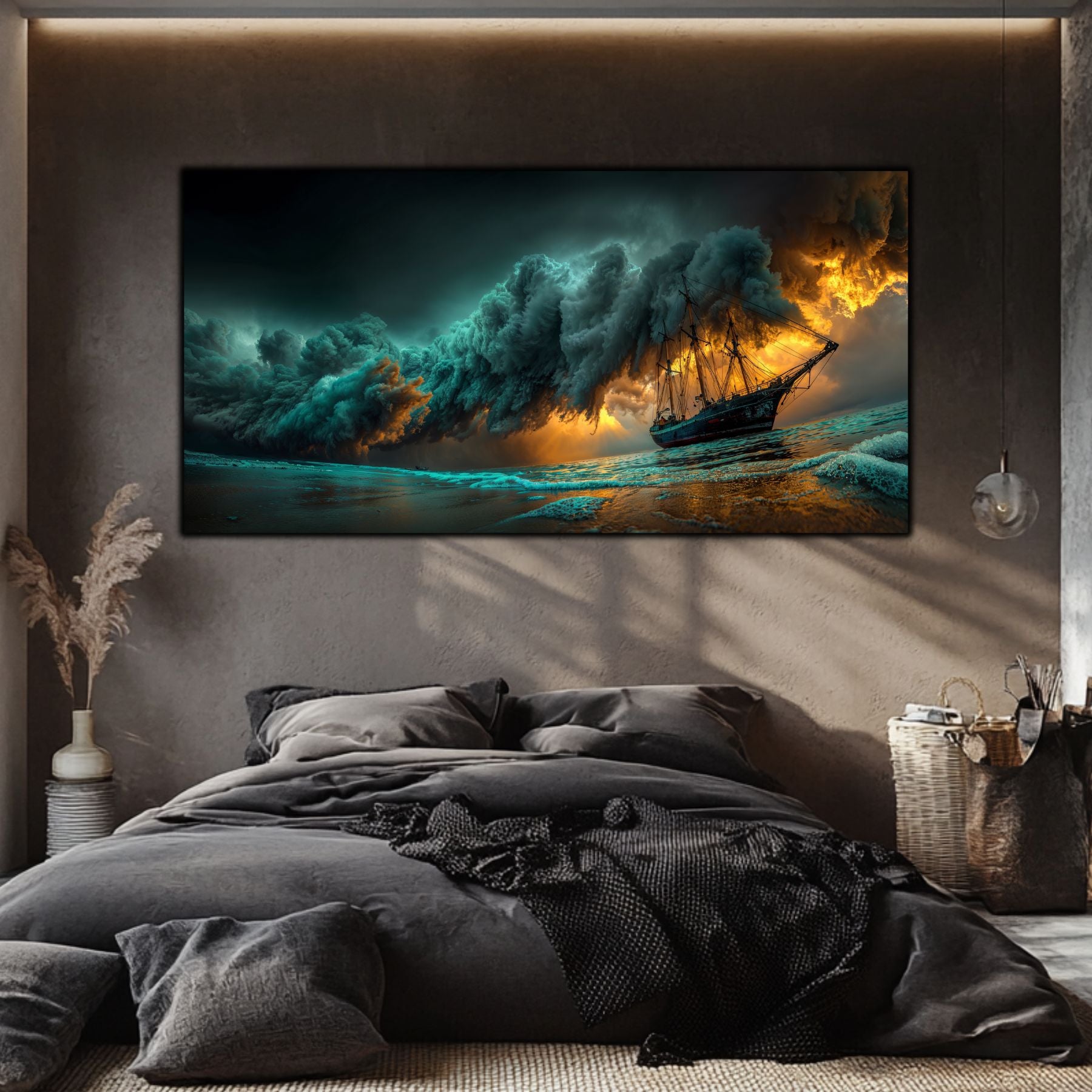 Descoperă o piesă de artă care capturează duelul etern dintre om și elementele naturii. "Îmbrățișarea Haosului" este un tablou pe sticlă securizată de 4 mm care transformă dramatismul unei furtuni pe mare într-o sursă de inspirație și echilibru. Este alegerea ideală pentru un decor interior care emană forță, caracter și rafinament modern.