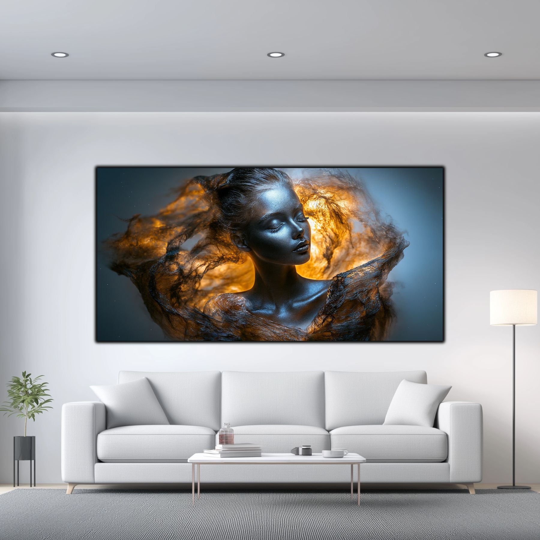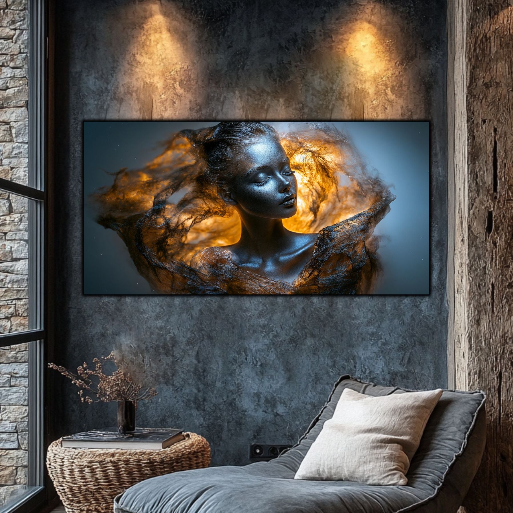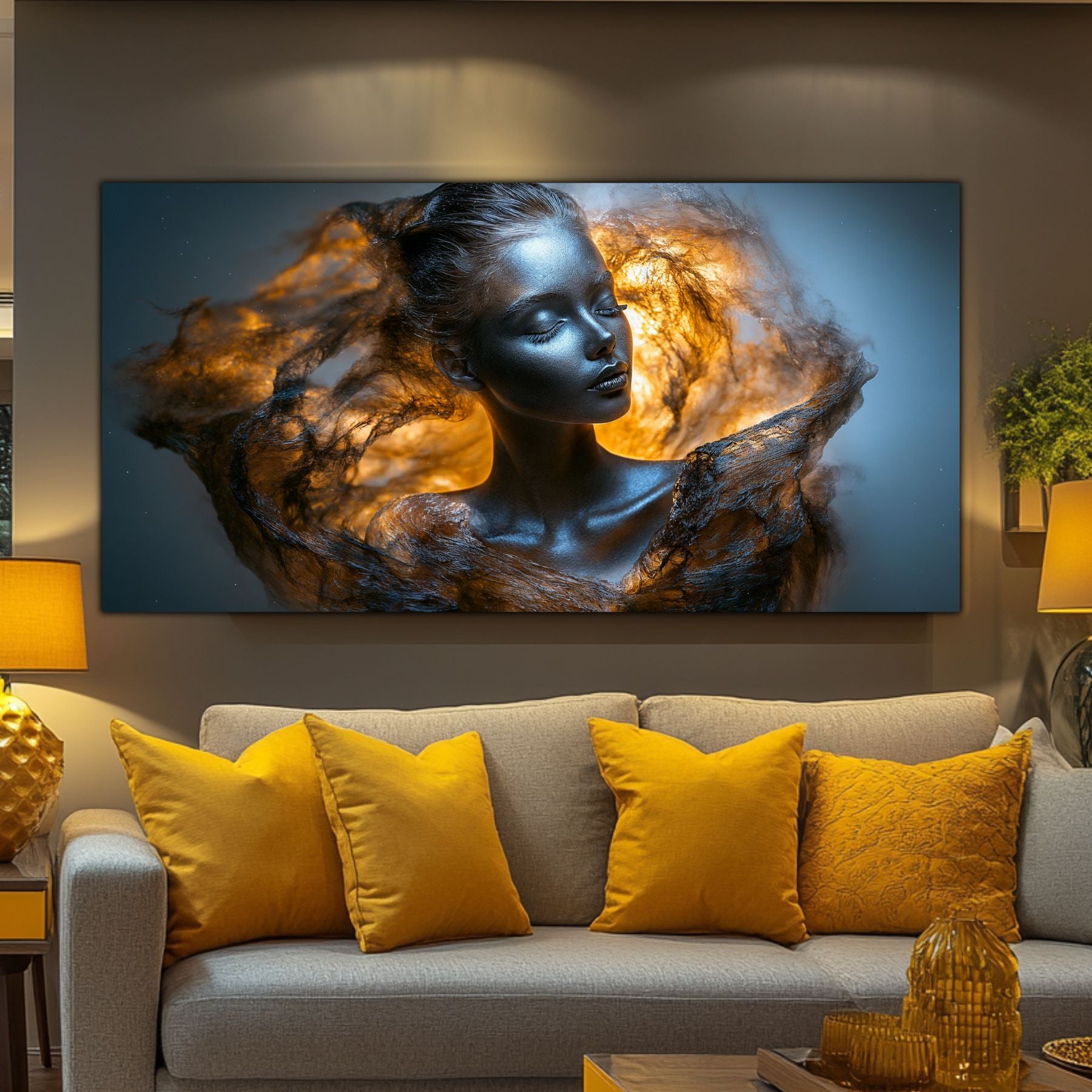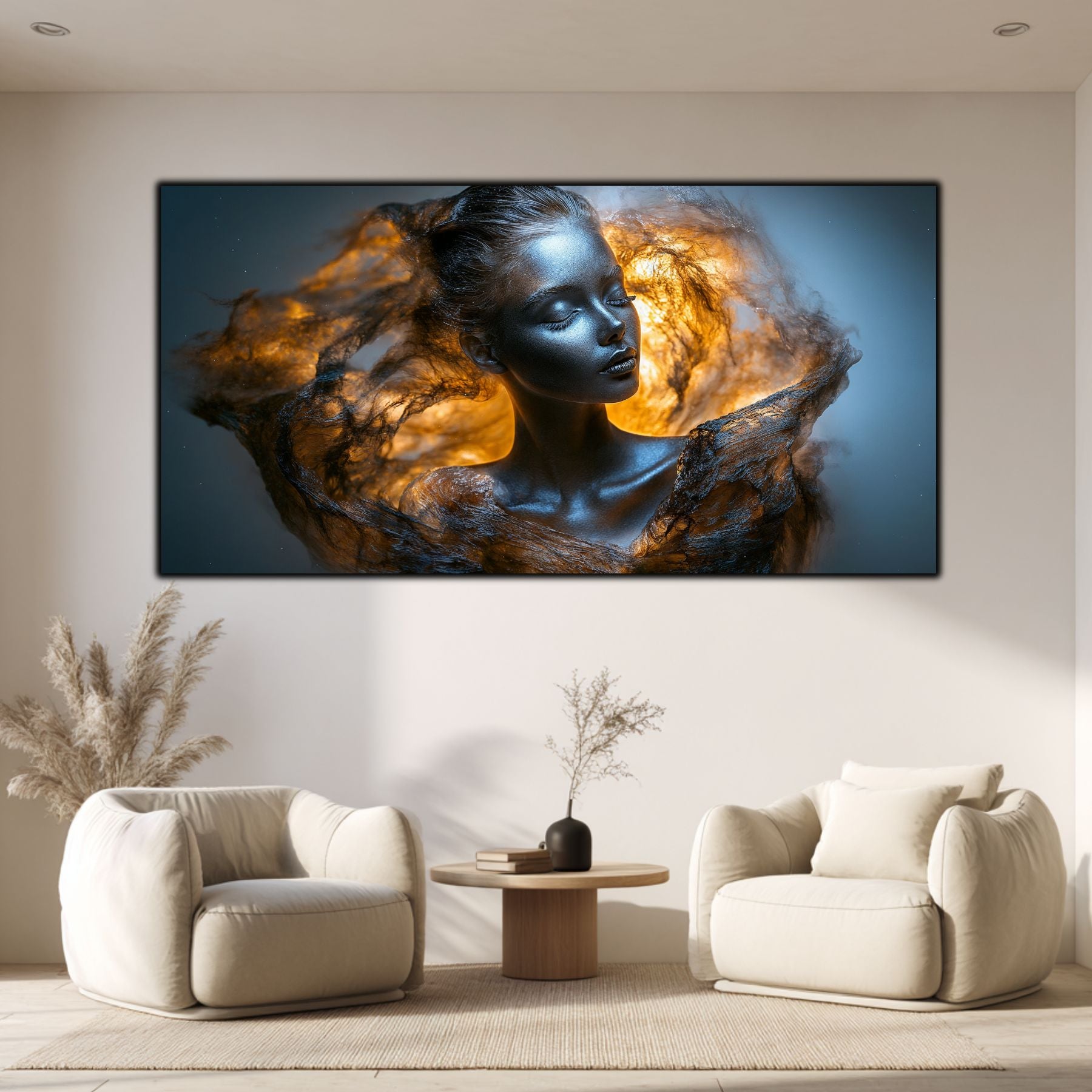 Imaginile prezentate sunt randari digitale realizate pentru a evidentia frumusetea tablourilor. Ele nu respecta proportiile reale in raport cu spatiul, fiind doar o interpretare artistica a modului in care acestea ar putea fi integrate intr-un decor. Va invit sa le „probati” mental pe peretii casei voastre si sa descoperiti cum isi gasesc locul in realitate.