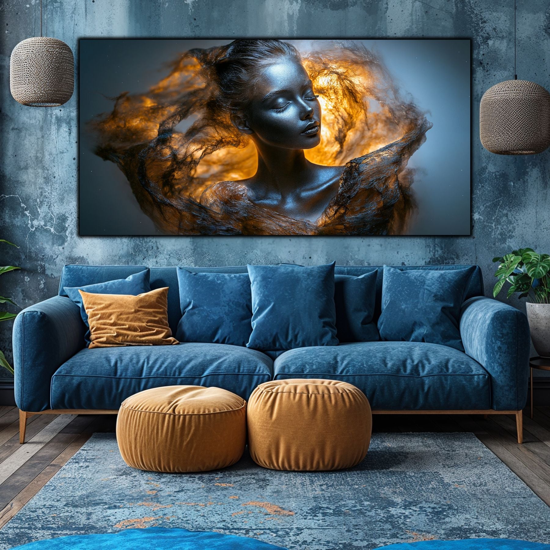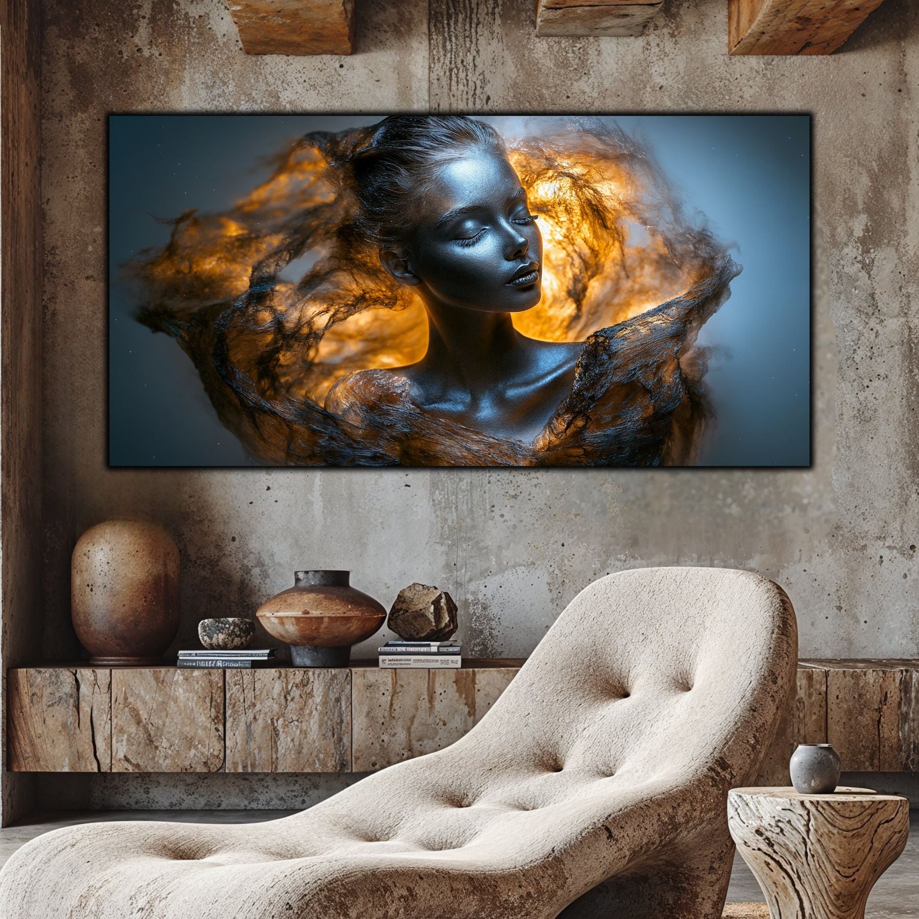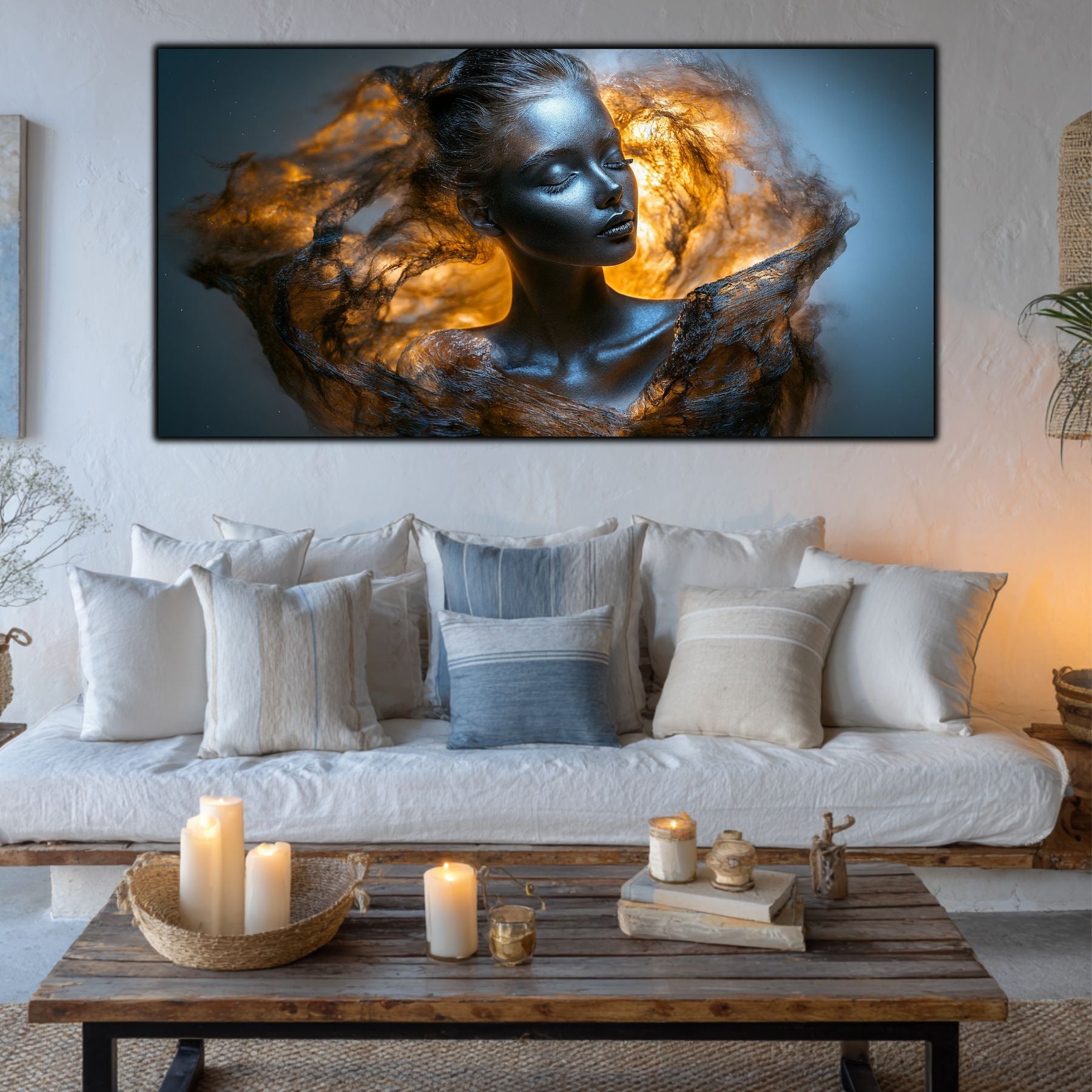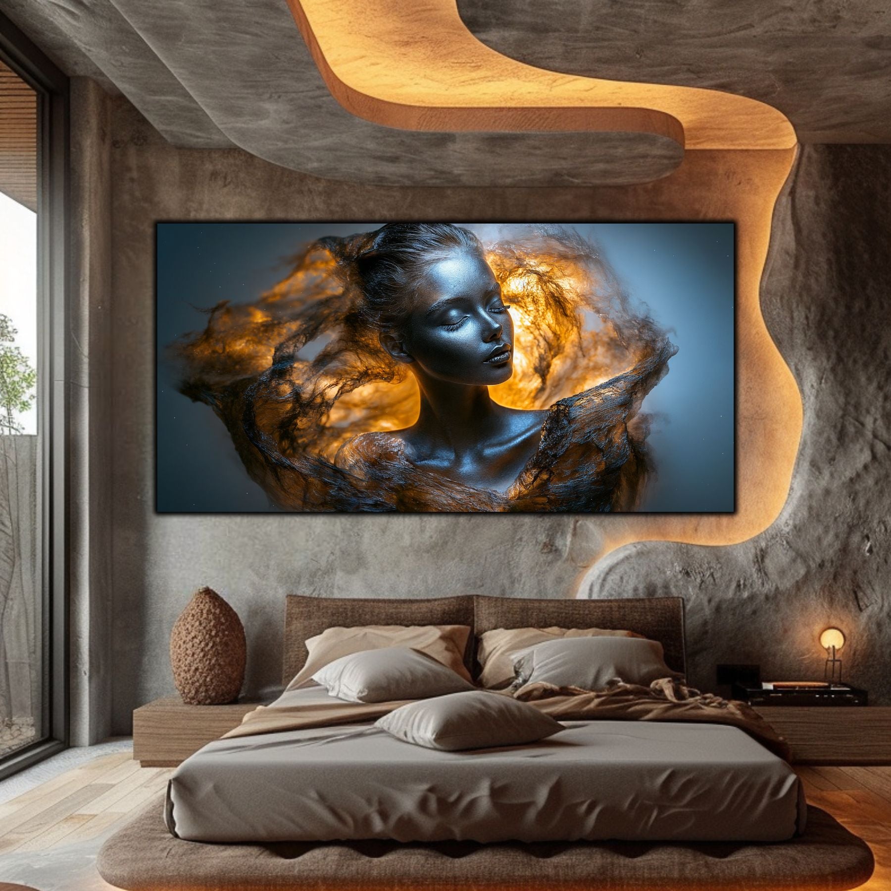 Imaginile prezentate sunt randari digitale realizate pentru a evidentia frumusetea tablourilor. Ele nu respecta proportiile reale in raport cu spatiul, fiind doar o interpretare artistica a modului in care acestea ar putea fi integrate intr-un decor. Va invit sa le „probati” mental pe peretii casei voastre si sa descoperiti cum isi gasesc locul in realitate.