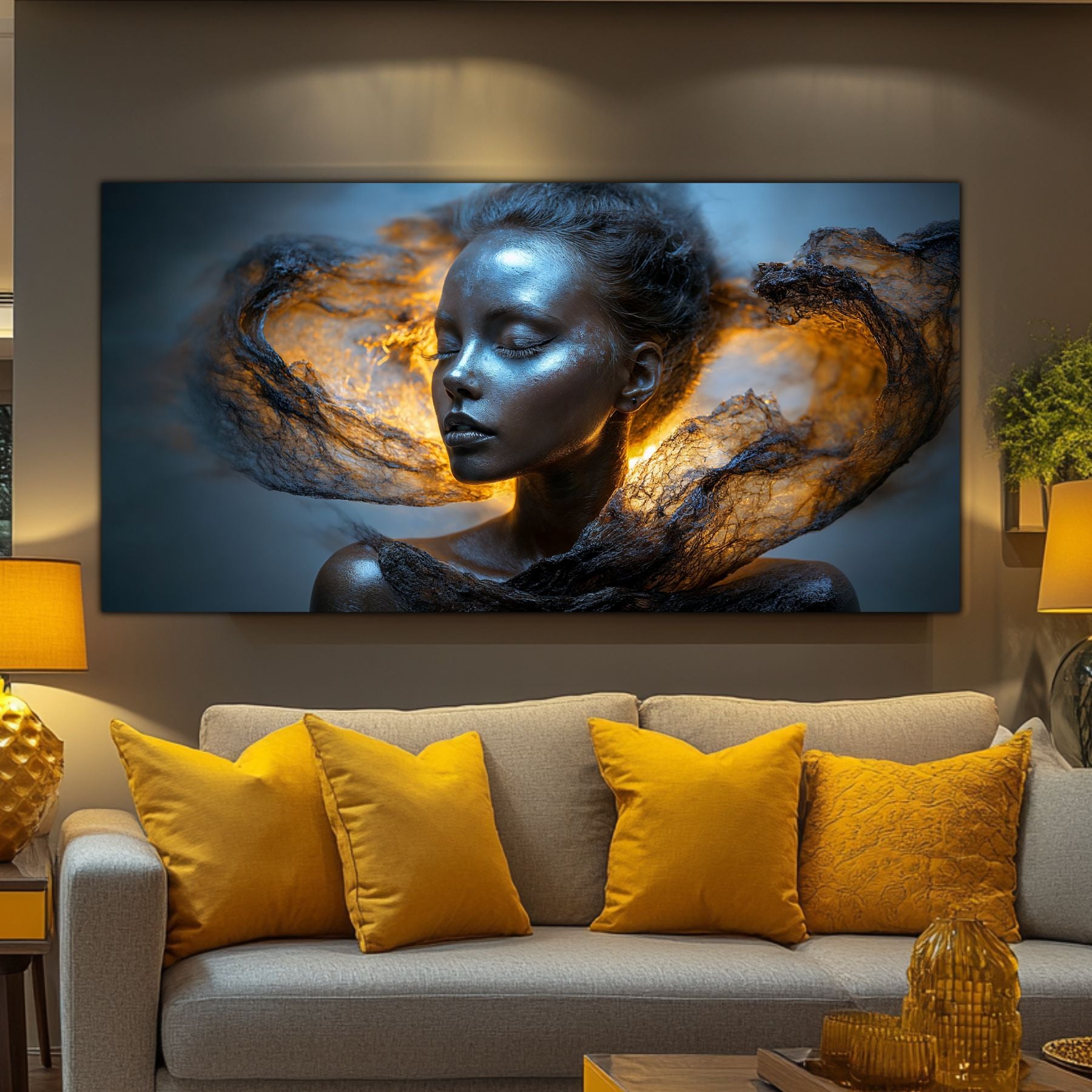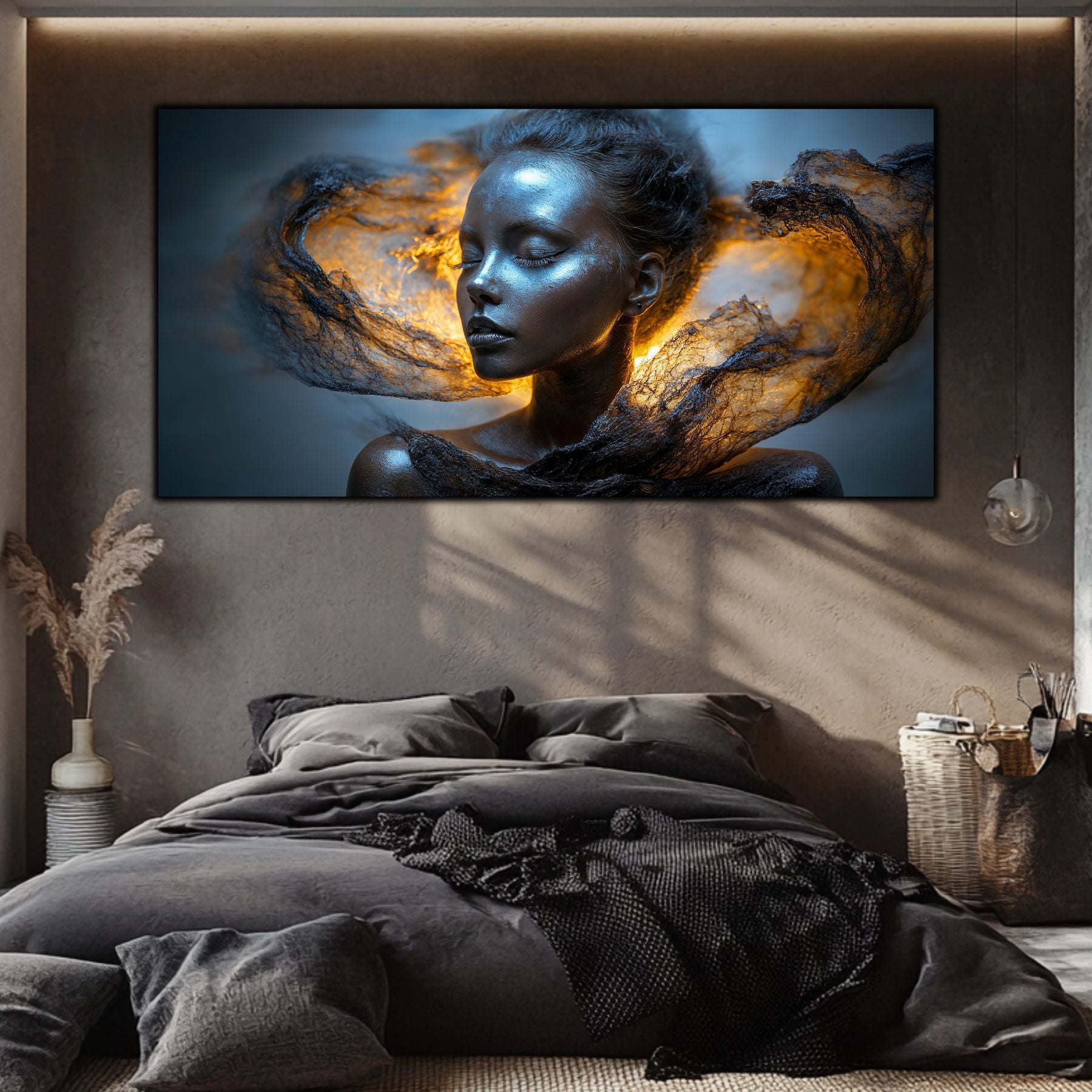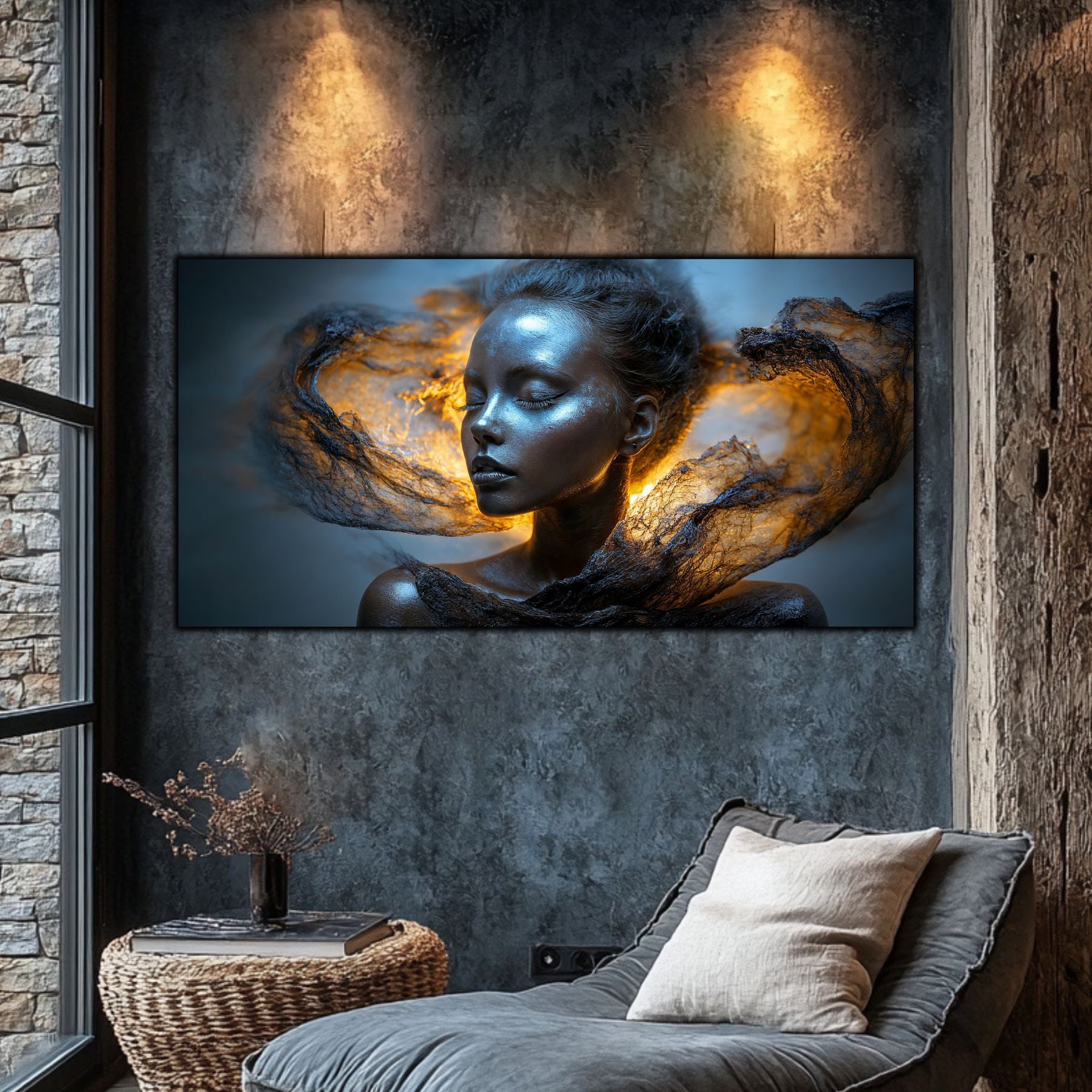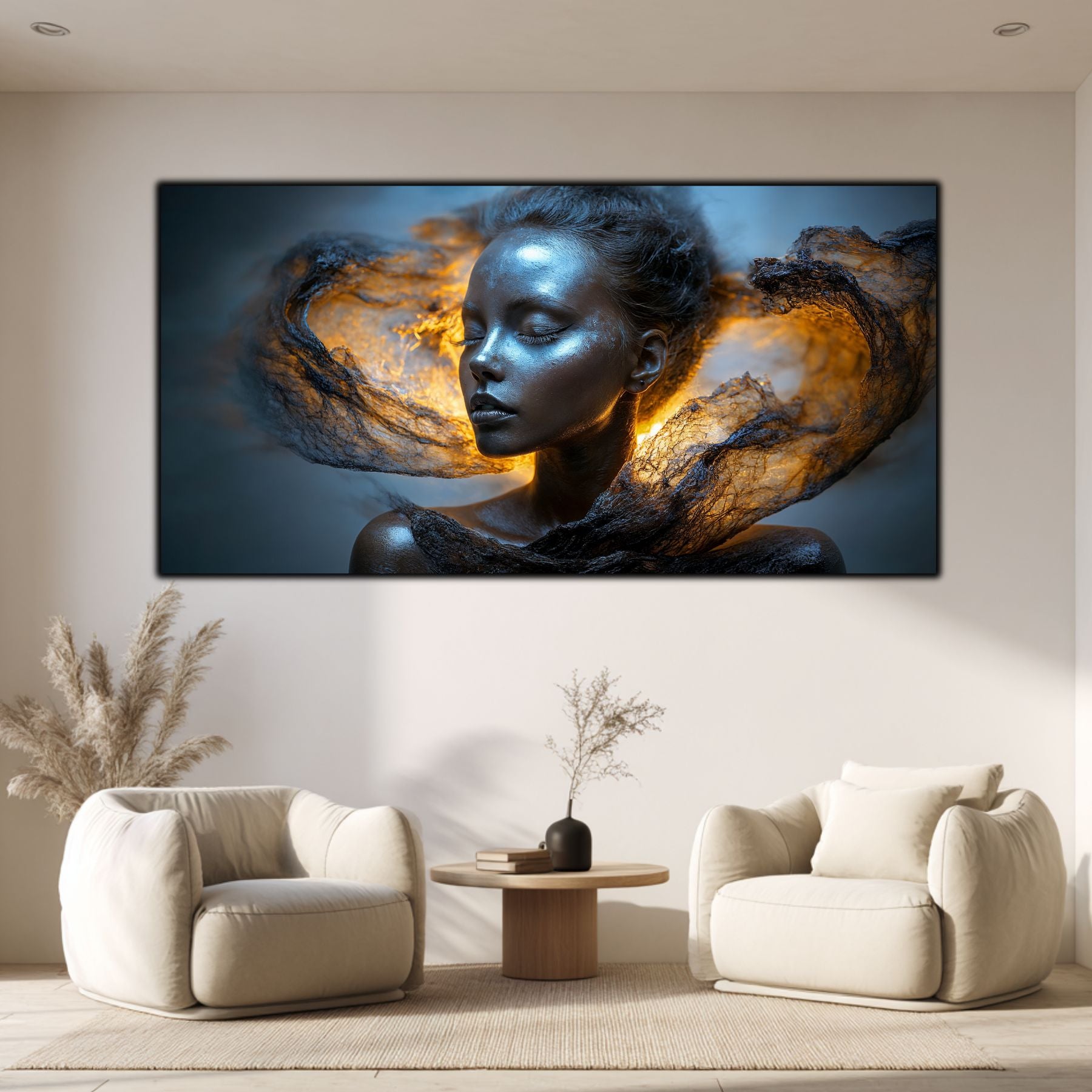 Imaginile prezentate sunt randari digitale realizate pentru a evidentia frumusetea tablourilor. Ele nu respecta proportiile reale in raport cu spatiul, fiind doar o interpretare artistica a modului in care acestea ar putea fi integrate intr-un decor. Va invit sa le „probati” mental pe peretii casei voastre si sa descoperiti cum isi gasesc locul in realitate.