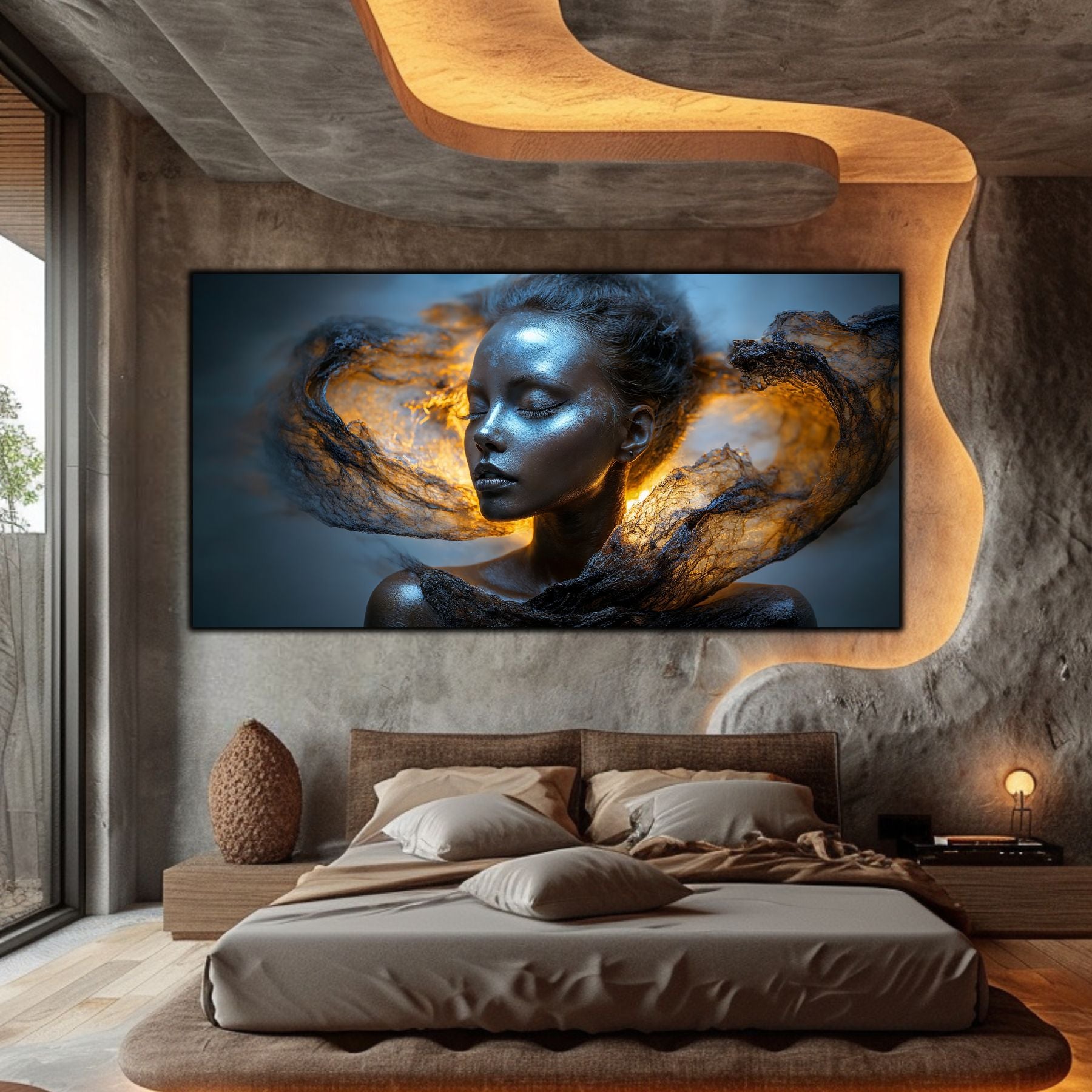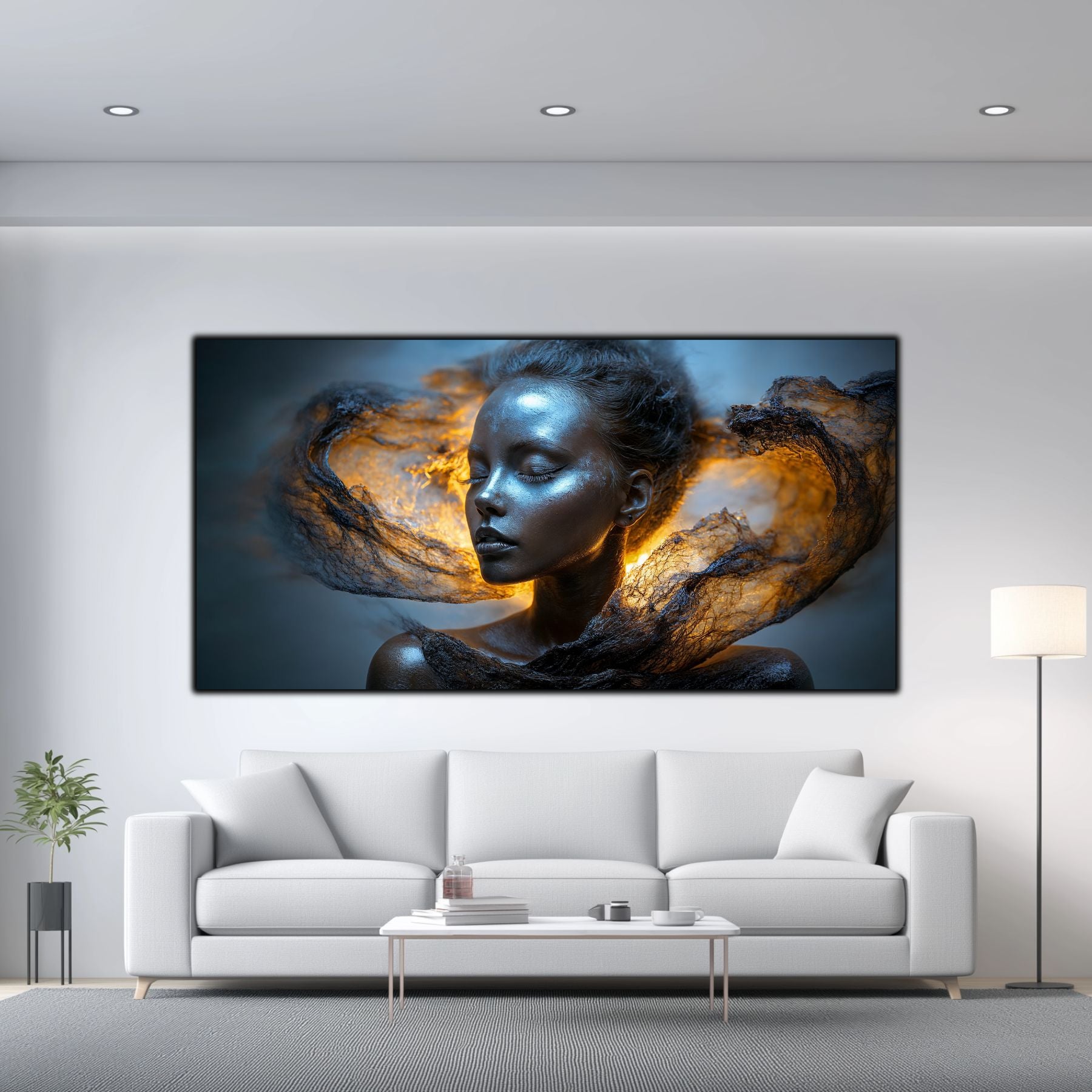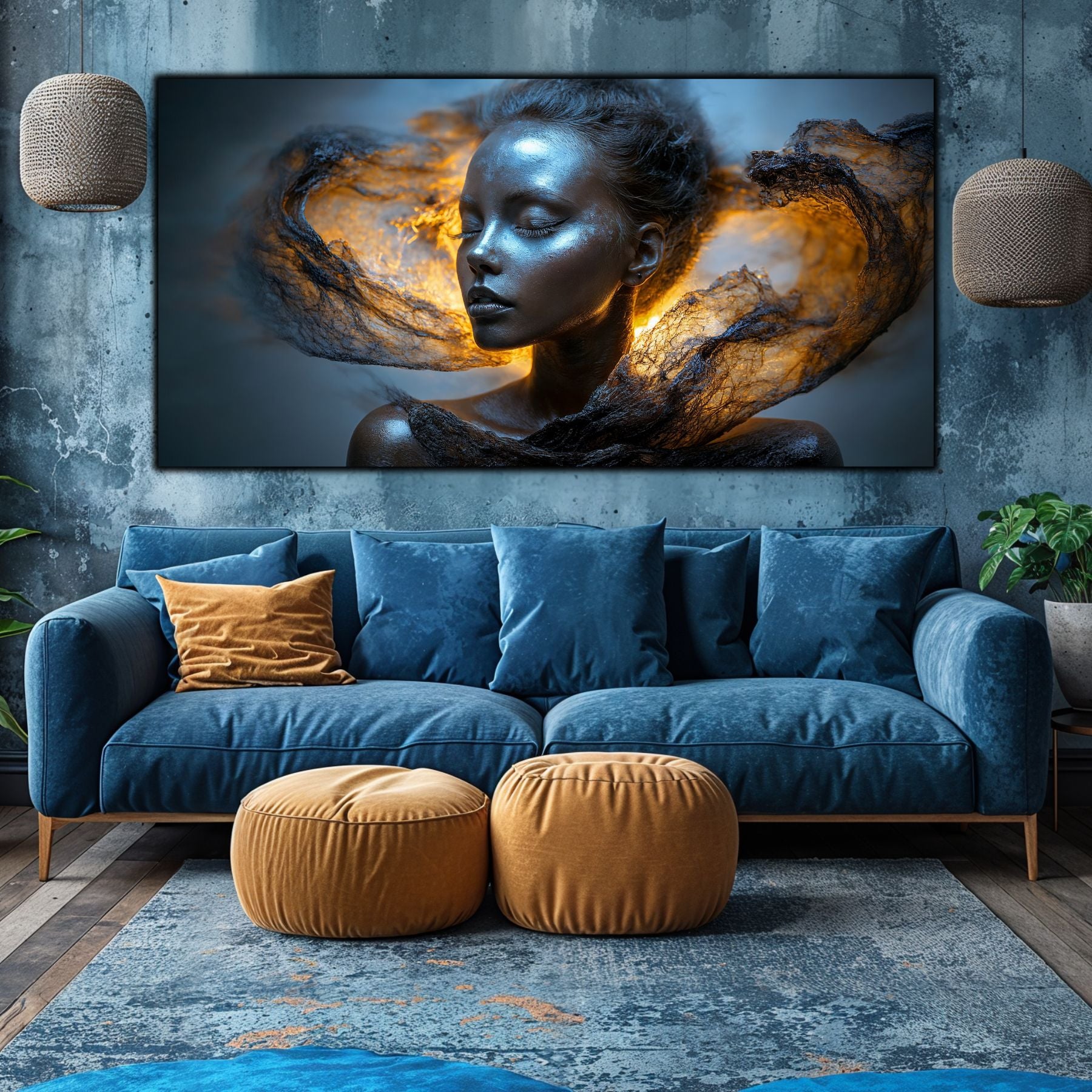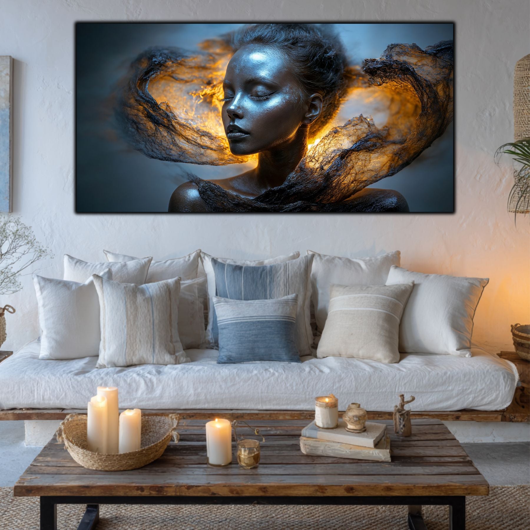 Imaginile prezentate sunt randari digitale realizate pentru a evidentia frumusetea tablourilor. Ele nu respecta proportiile reale in raport cu spatiul, fiind doar o interpretare artistica a modului in care acestea ar putea fi integrate intr-un decor. Va invit sa le „probati” mental pe peretii casei voastre si sa descoperiti cum isi gasesc locul in realitate.