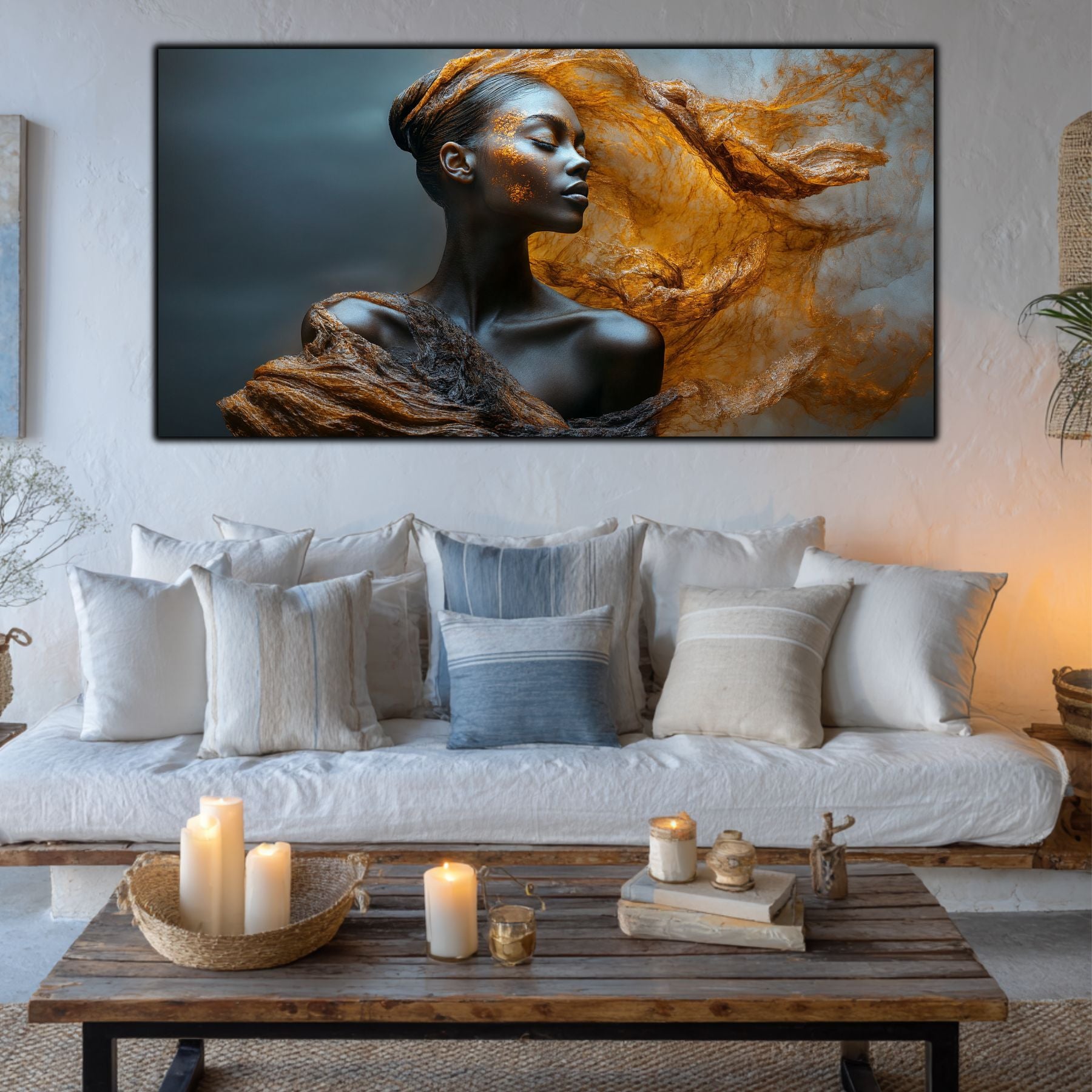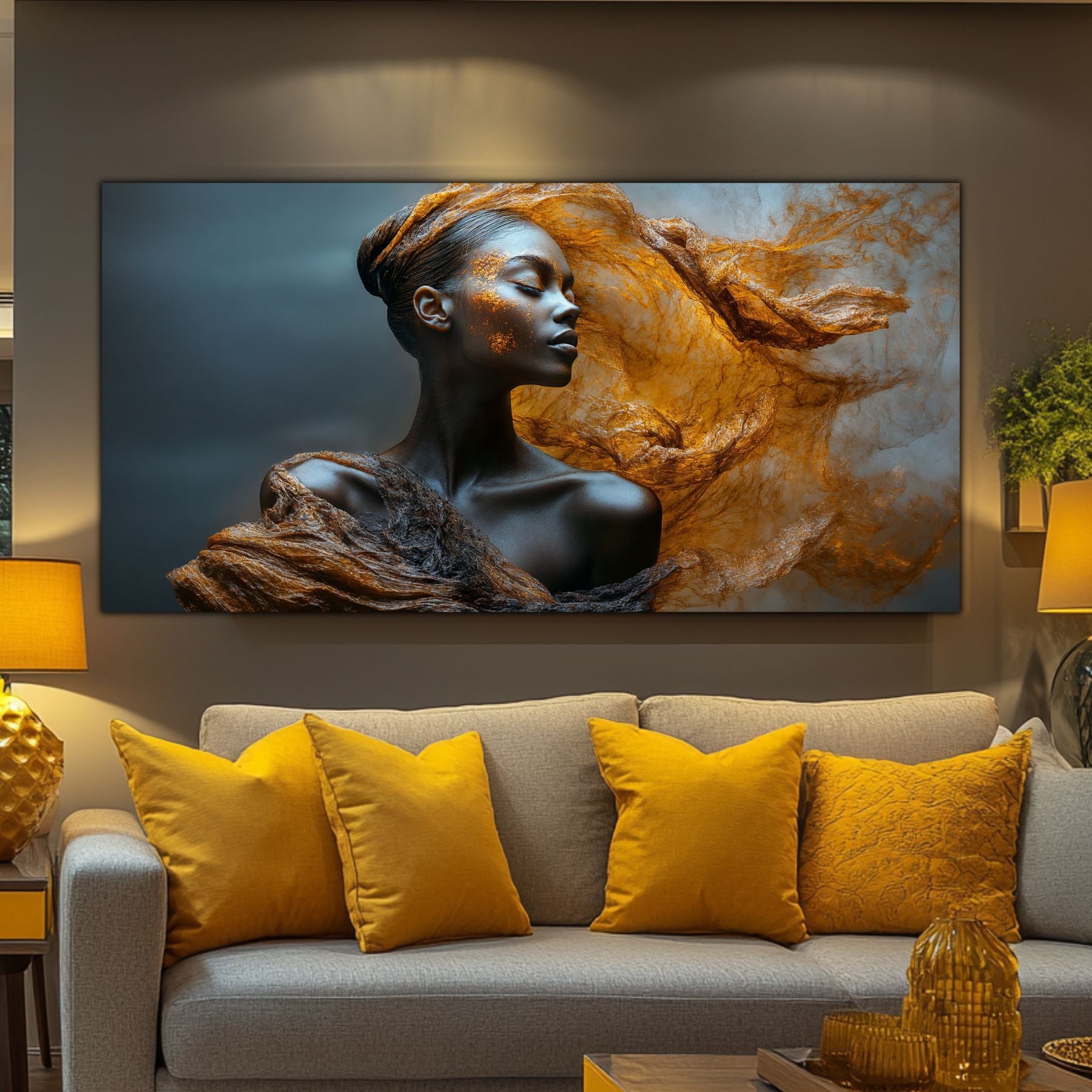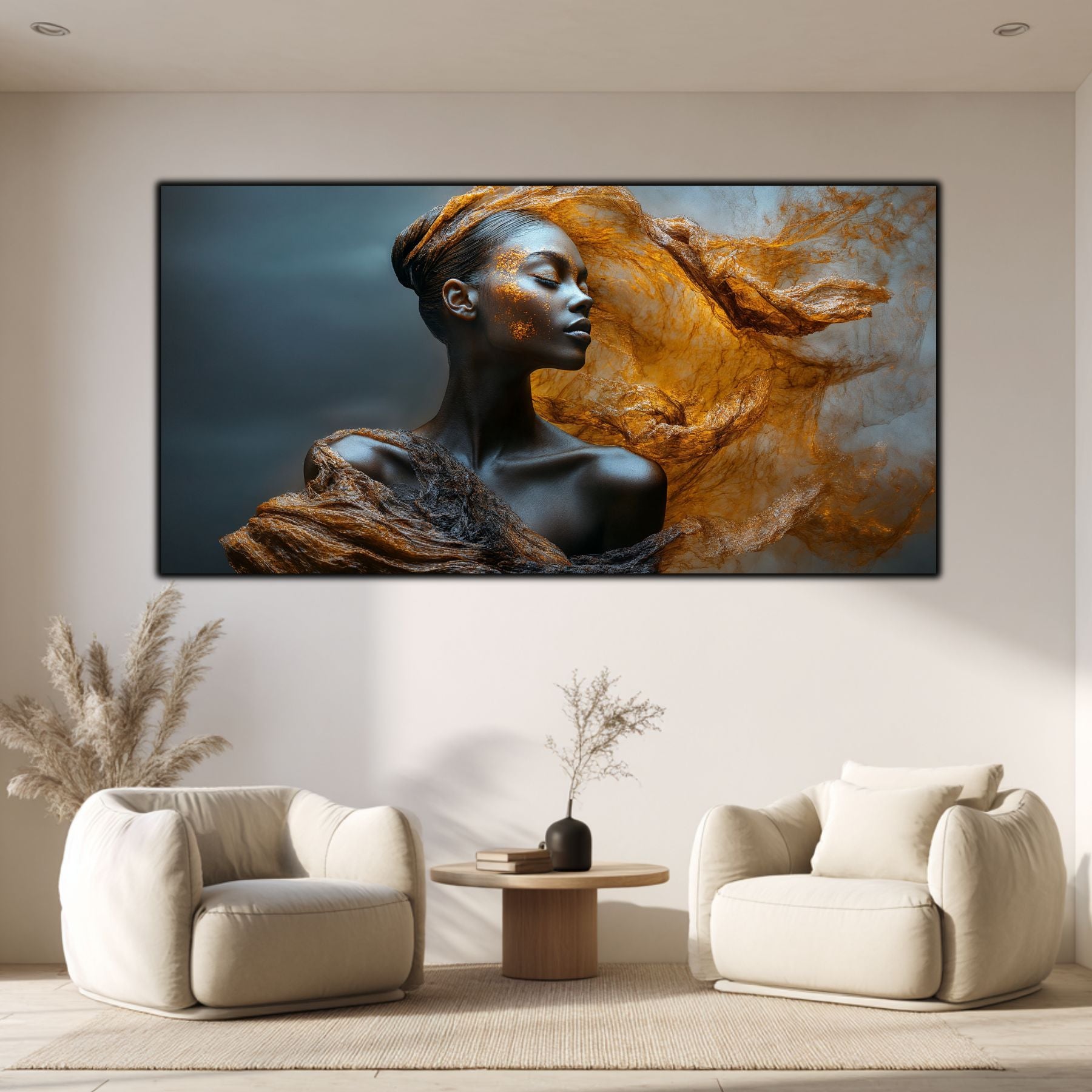 Imaginile prezentate sunt randari digitale realizate pentru a evidentia frumusetea tablourilor. Ele nu respecta proportiile reale in raport cu spatiul, fiind doar o interpretare artistica a modului in care acestea ar putea fi integrate intr-un decor. Va invit sa le „probati” mental pe peretii casei voastre si sa descoperiti cum isi gasesc locul in realitate.
