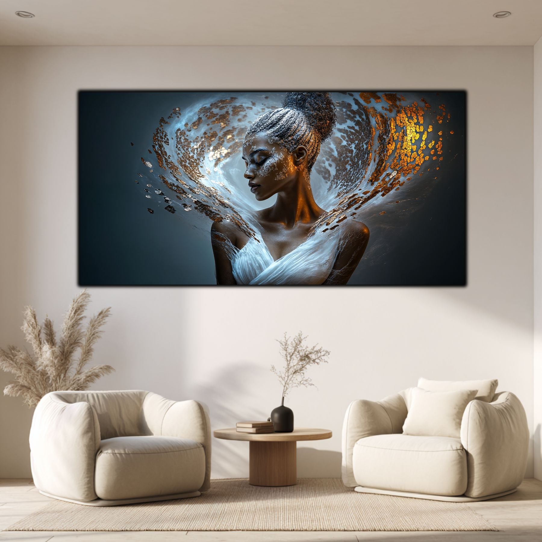 Imaginile prezentate sunt randari digitale realizate pentru a evidentia frumusetea tablourilor. Ele nu respecta proportiile reale in raport cu spatiul, fiind doar o interpretare artistica a modului in care acestea ar putea fi integrate intr-un decor. Va invit sa le „probati” mental pe peretii casei voastre si sa descoperiti cum isi gasesc locul in realitate.