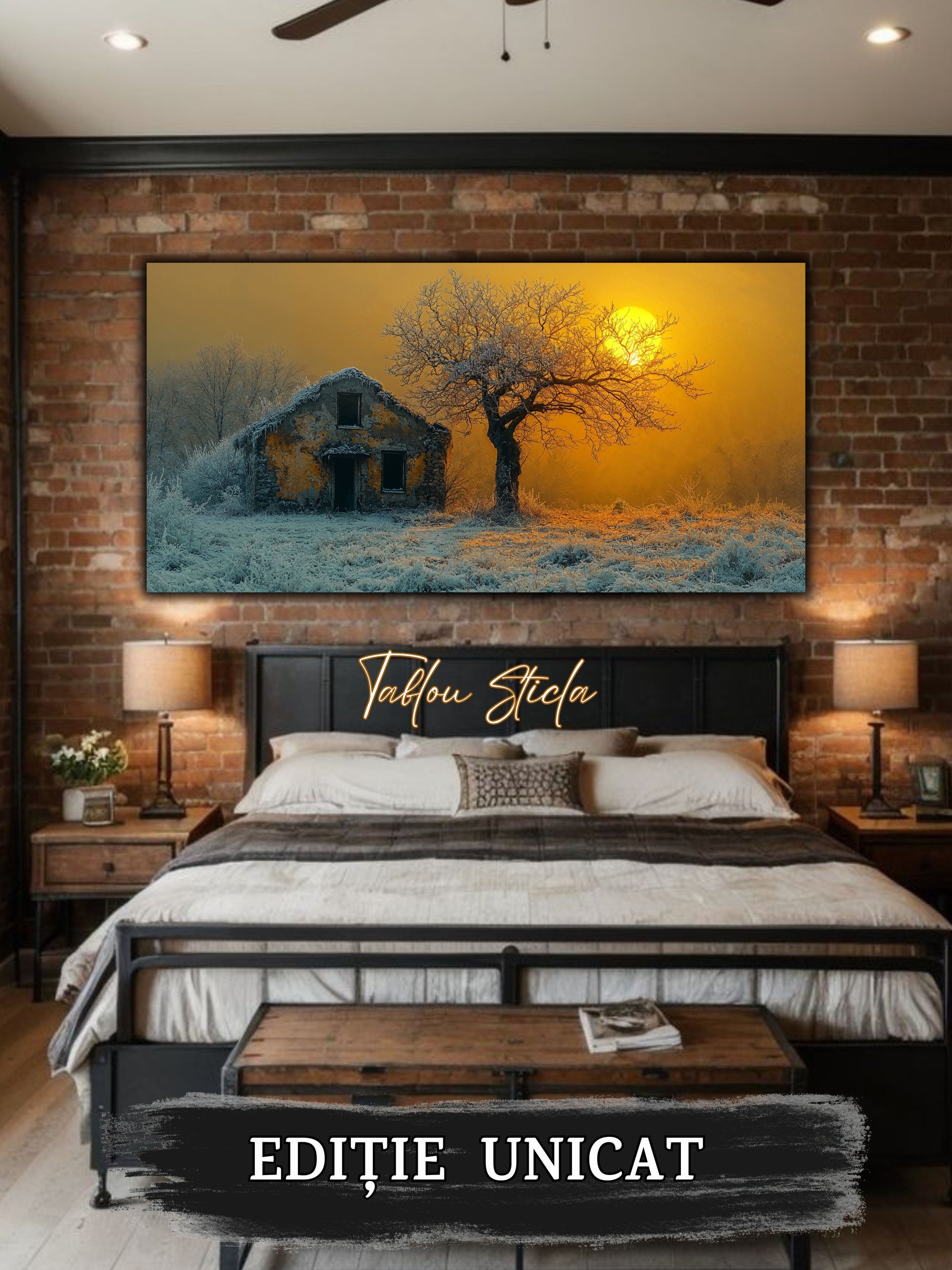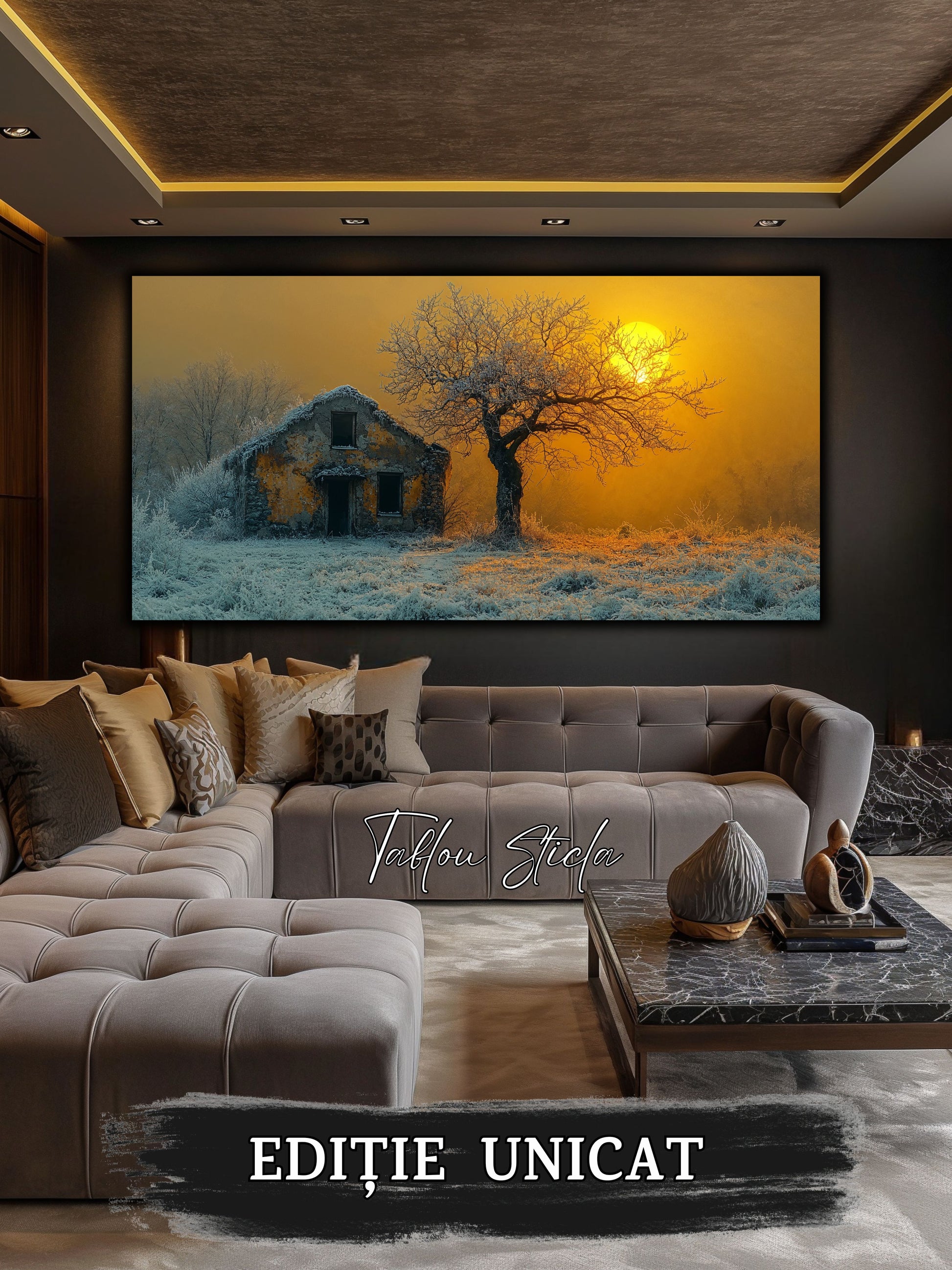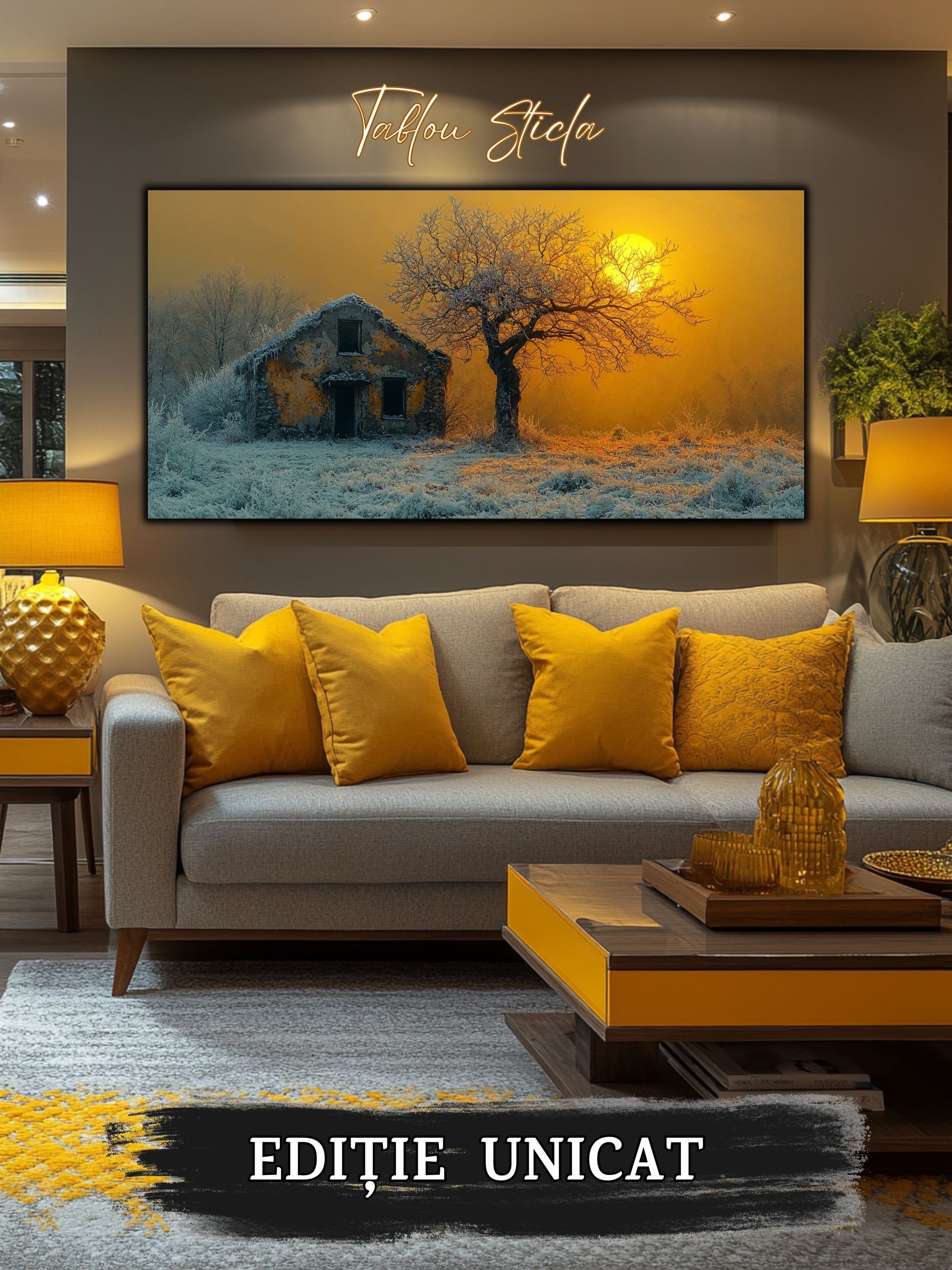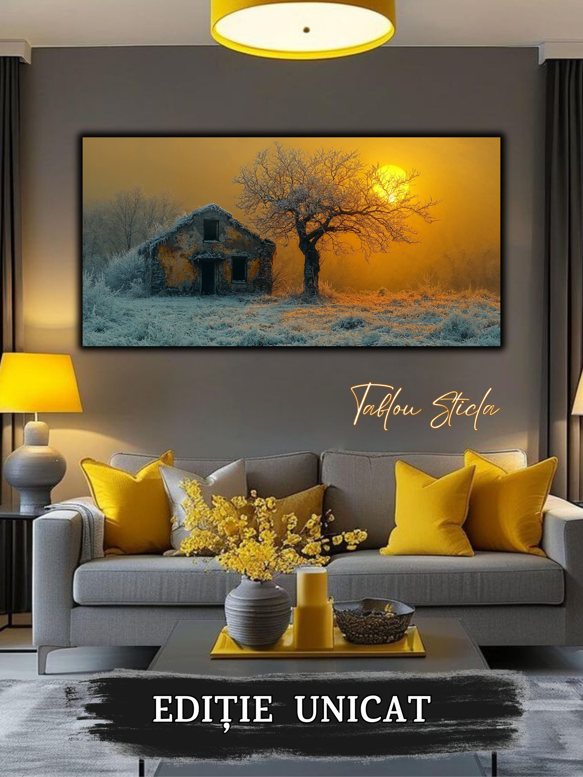 Imaginile prezentate sunt randari digitale realizate pentru a evidentia frumusetea tablourilor. Ele nu respecta proportiile reale in raport cu spatiul, fiind doar o interpretare artistica a modului in care acestea ar putea fi integrate intr-un decor. Va invit sa le „probati” mental pe peretii casei voastre si sa descoperiti cum isi gasesc locul in realitate.