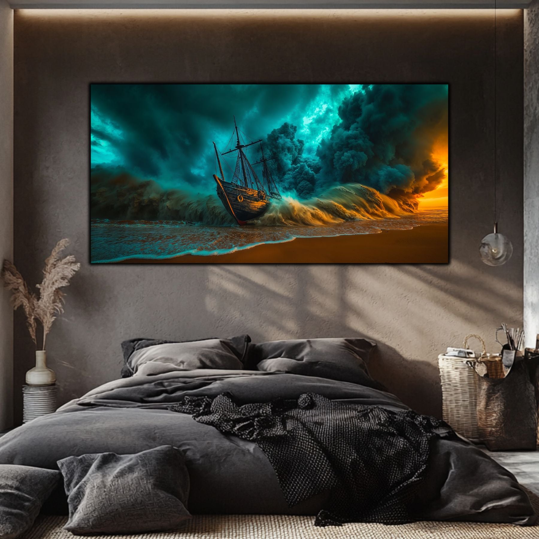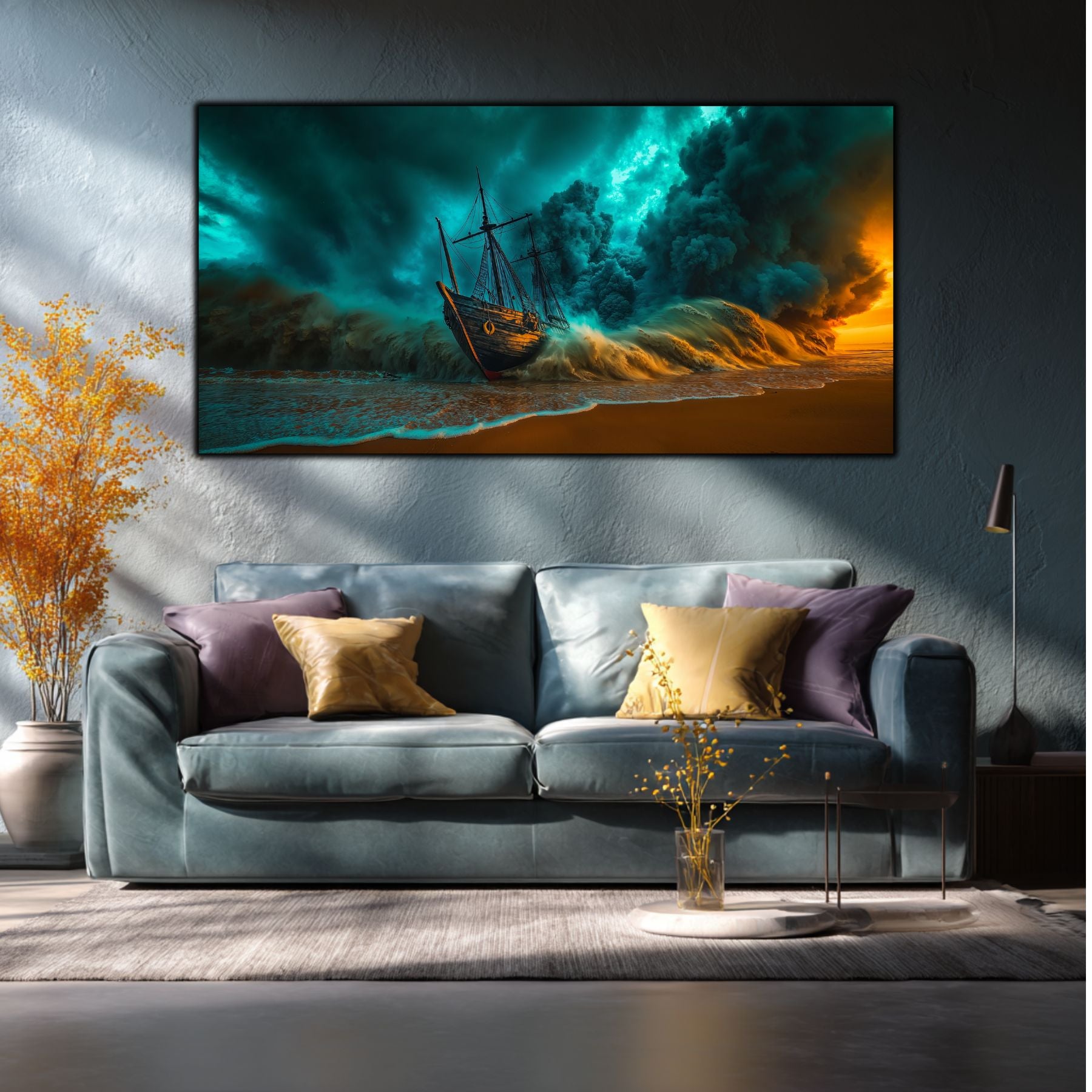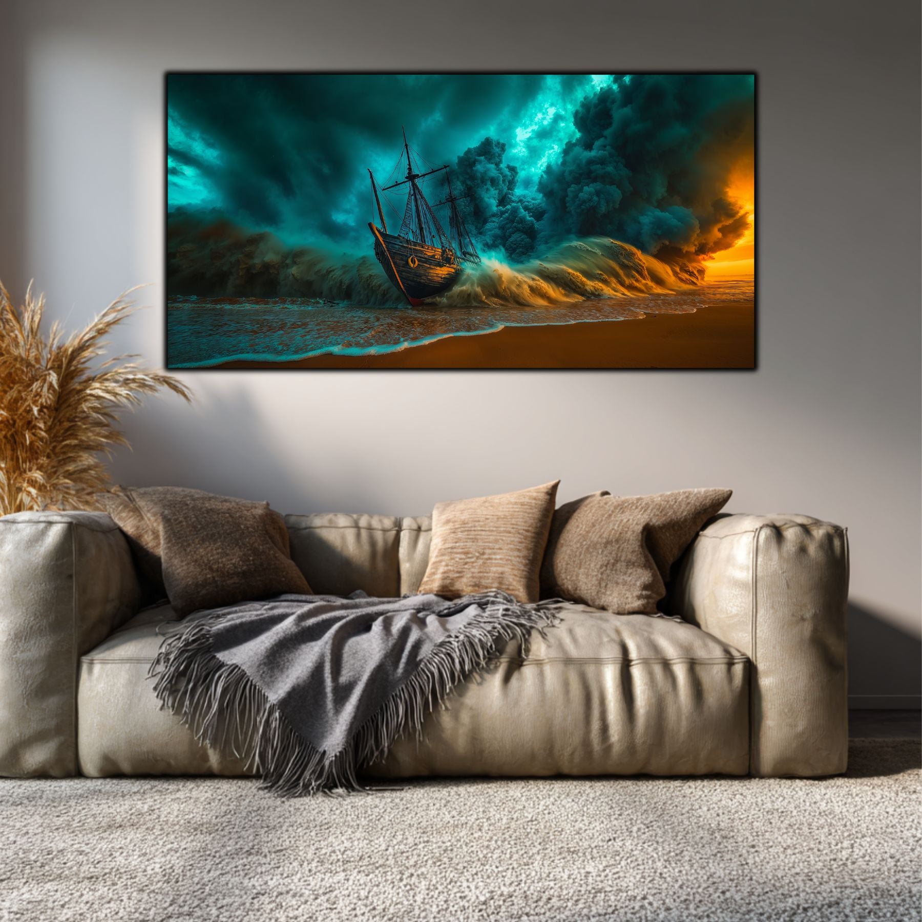 Cerul in Colaps si Vaporii de Aur: Masa colosala de nori turcoaz nu mai este doar un martor, ci forta care zdrobeste activ nava. Pe acest decor sticla premium, contrastul dintre albastrul rece si lumina portocalie, aproape arzatzaore, de la orizont, creeaza o tensiune care pare sa emane caldura.