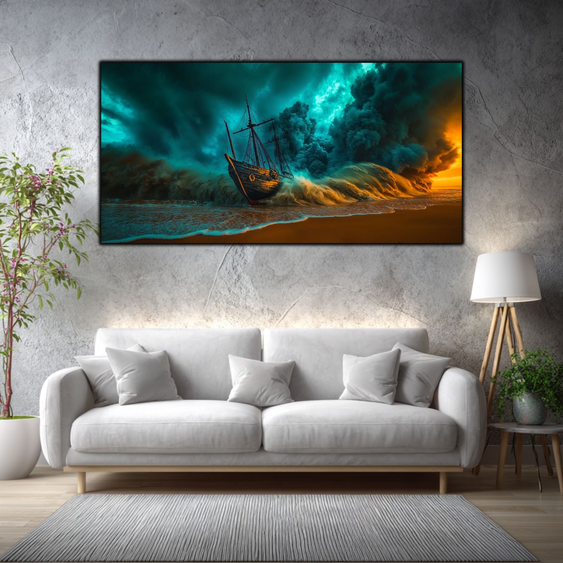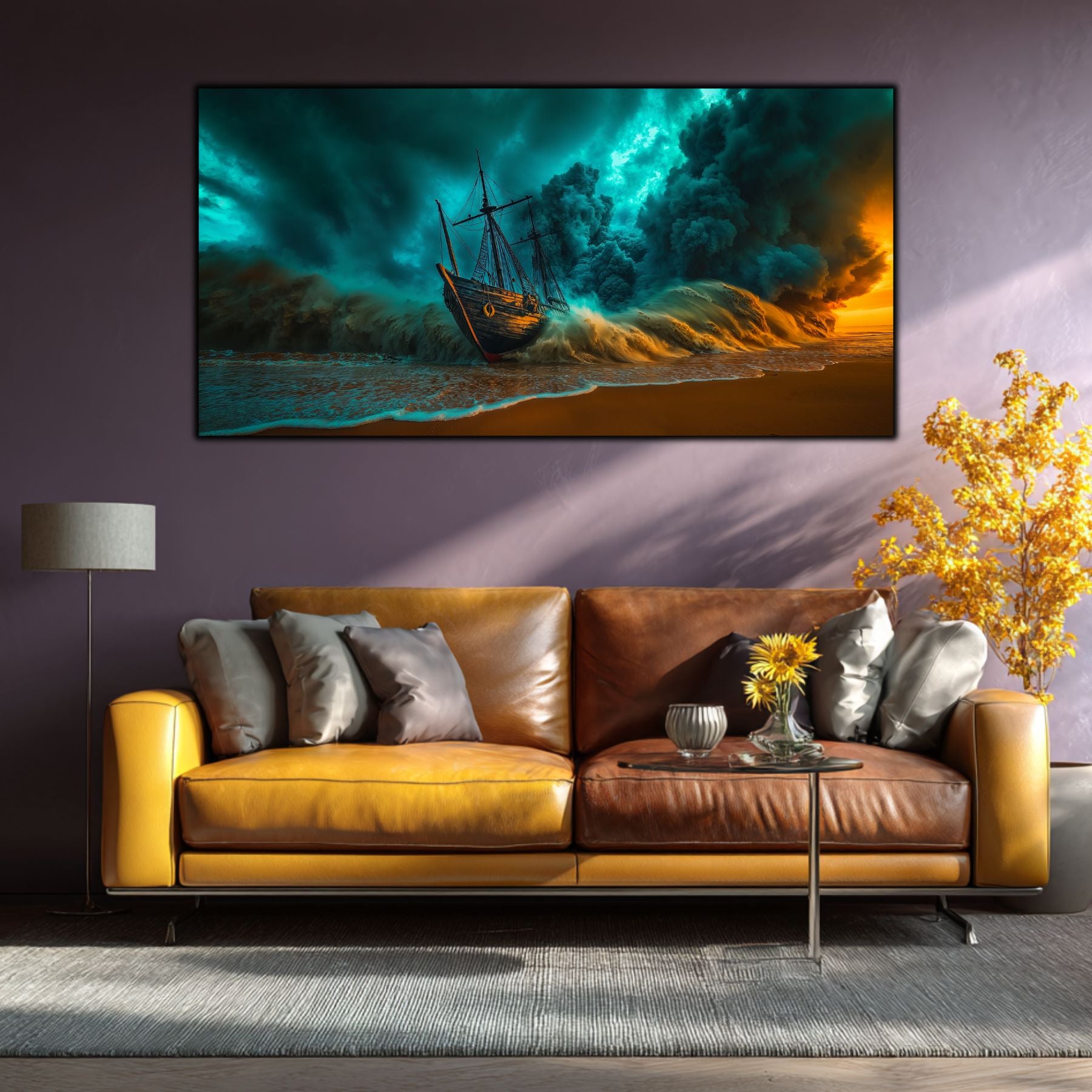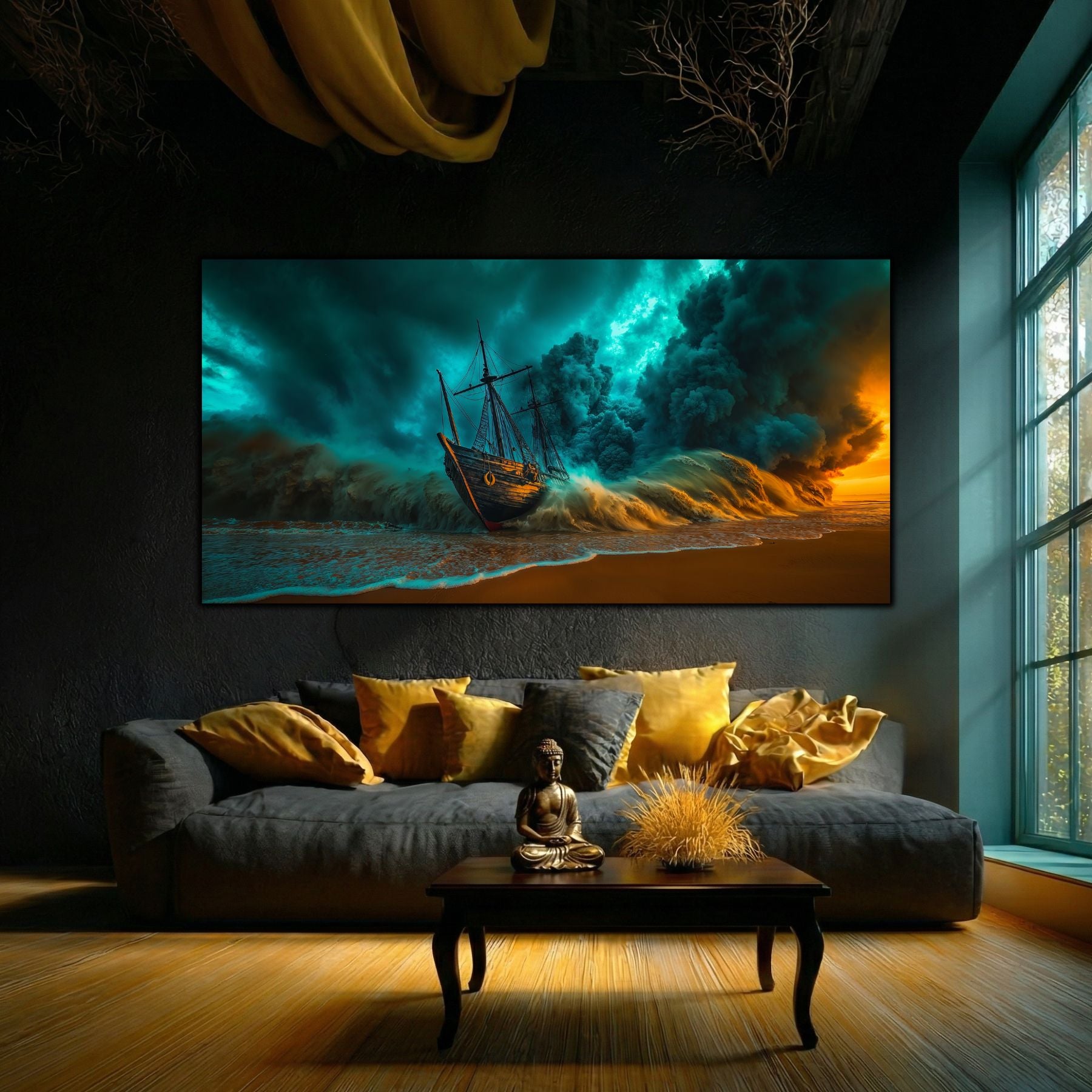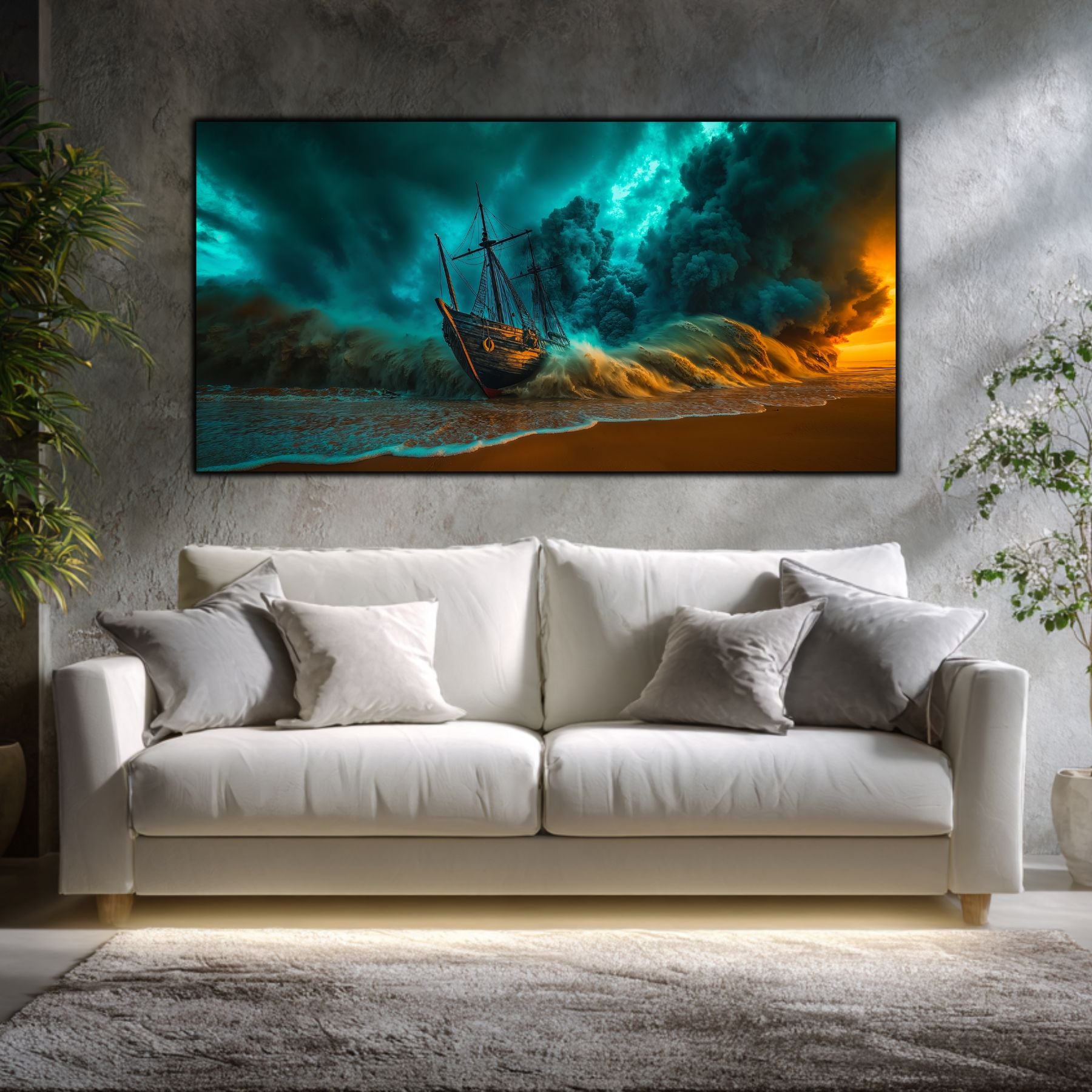 Cerul in Colaps si Vaporii de Aur: Masa colosala de nori turcoaz nu mai este doar un martor, ci forta care zdrobeste activ nava. Pe acest decor sticla premium, contrastul dintre albastrul rece si lumina portocalie, aproape arzatzaore, de la orizont, creeaza o tensiune care pare sa emane caldura.