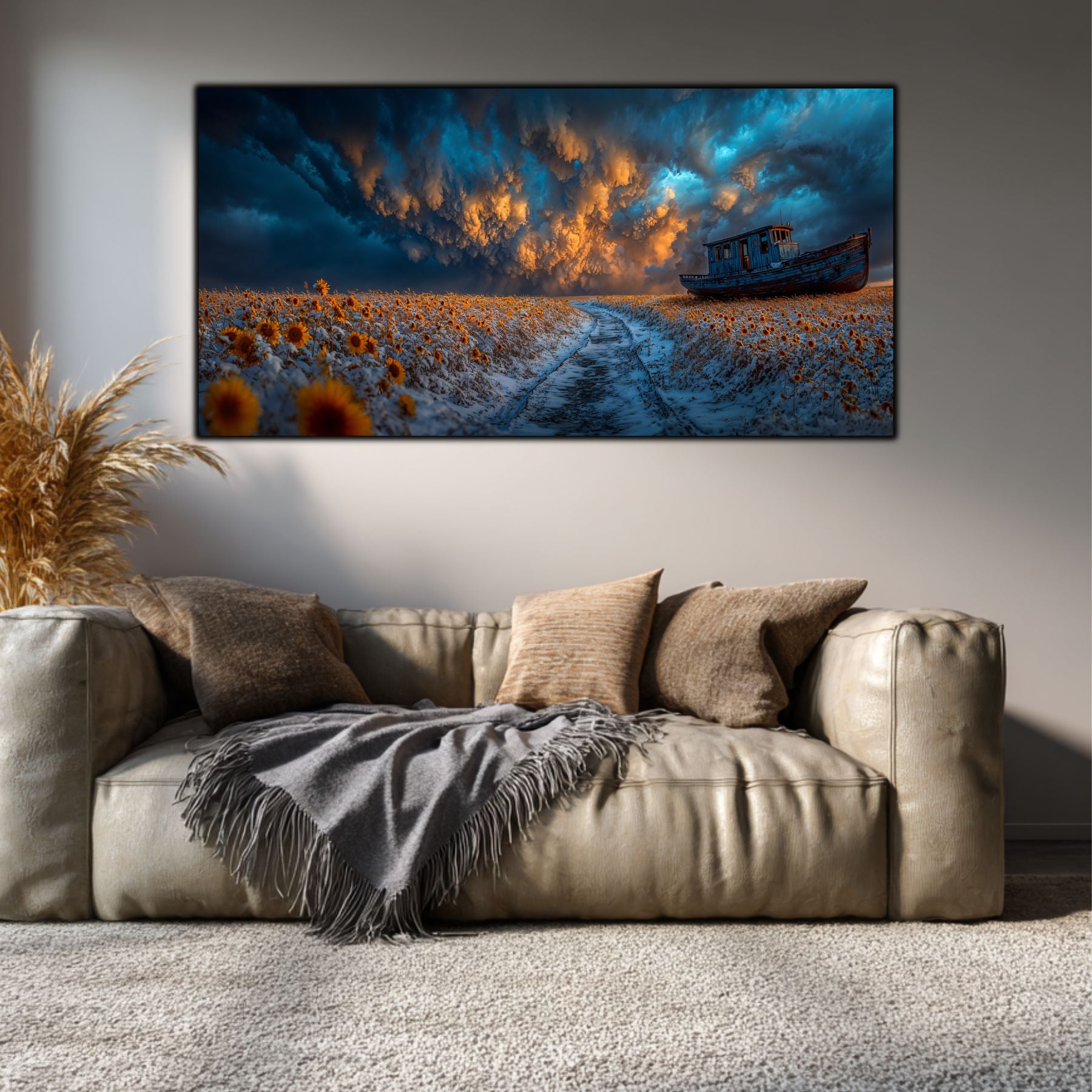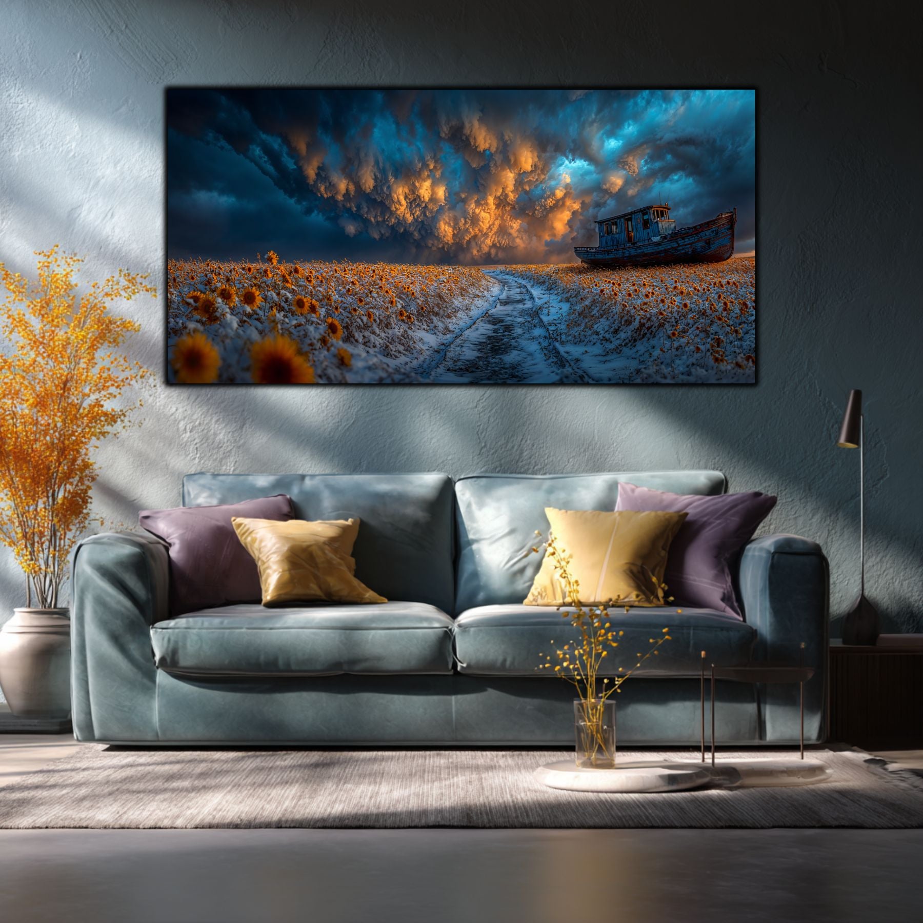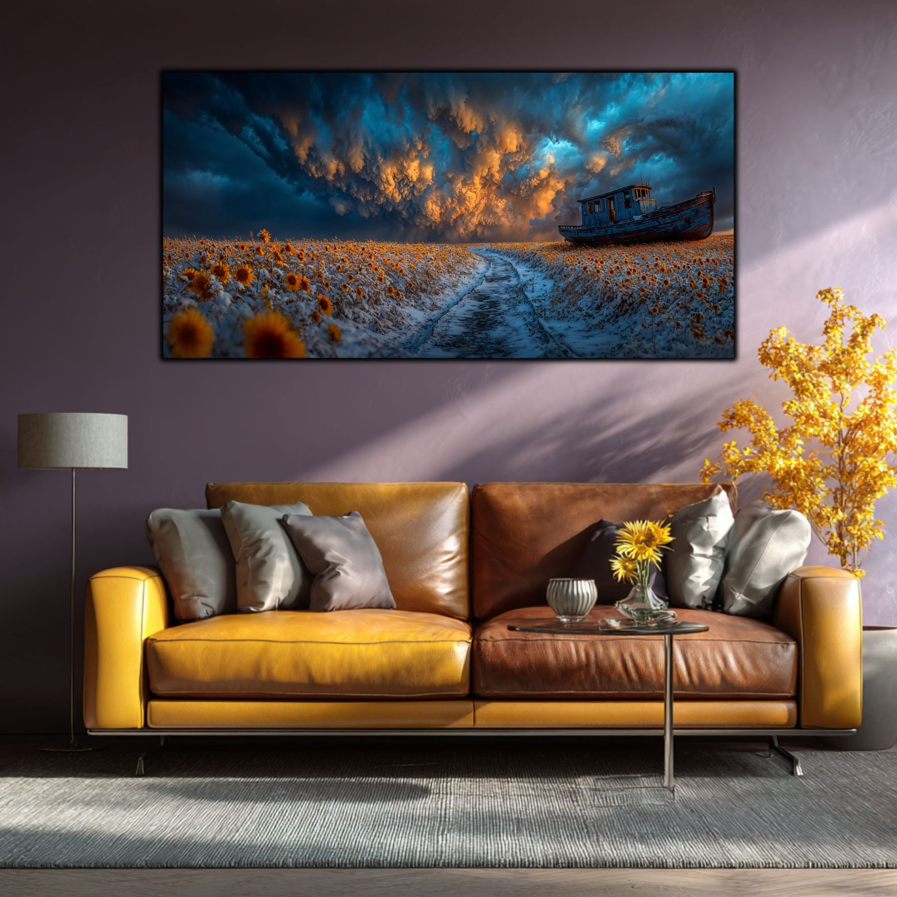 Fuziunea Elementelor Contradictorii: Zapada rece, florile solare si cerul asediat de nori turcoaz creeaza un contrast cromatic de o intensitate rara. Tehnologia de tablou printat UV scoate in evidenta fiecare detaliu, de la textura drumului inghetat pana la dramatismul cerului.