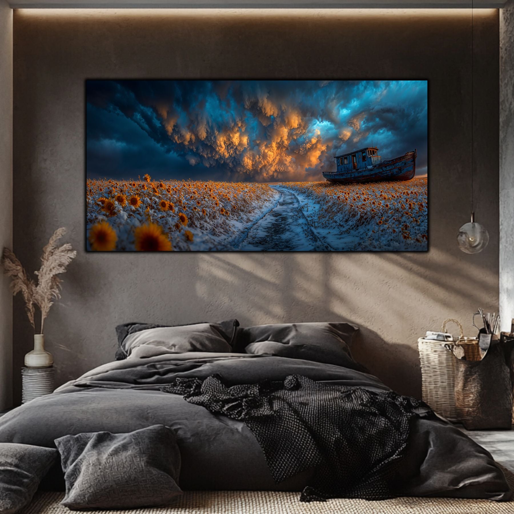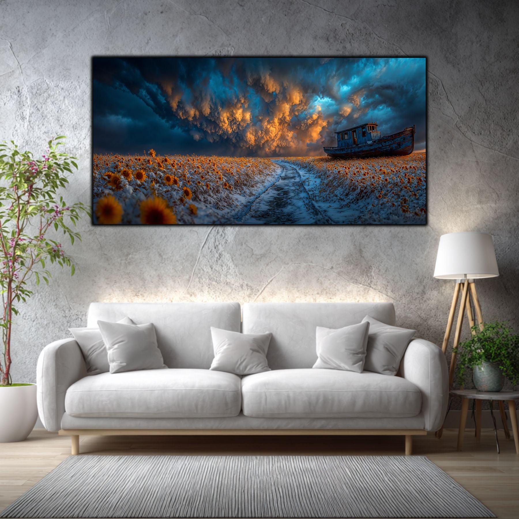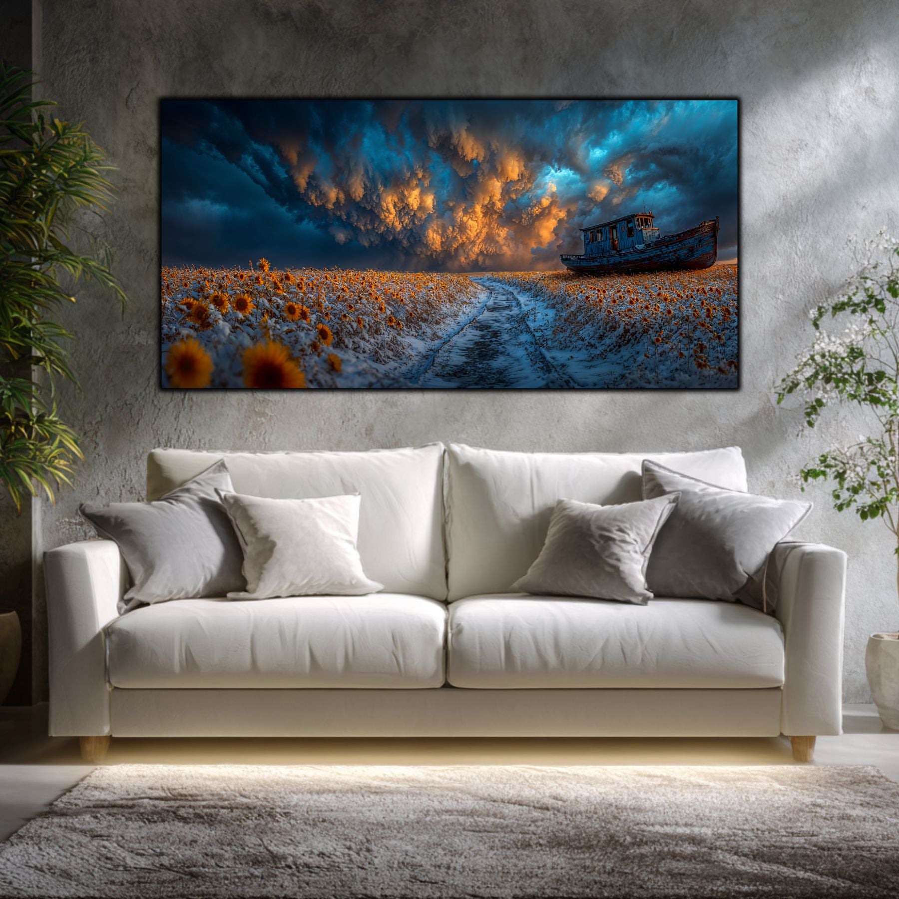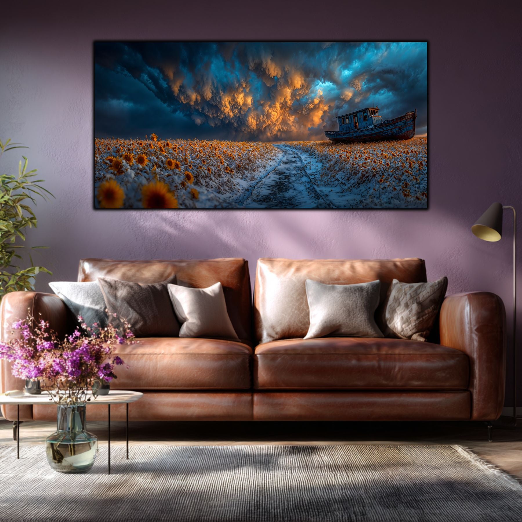 Fuziunea Elementelor Contradictorii: Zapada rece, florile solare si cerul asediat de nori turcoaz creeaza un contrast cromatic de o intensitate rara. Tehnologia de tablou printat UV scoate in evidenta fiecare detaliu, de la textura drumului inghetat pana la dramatismul cerului.