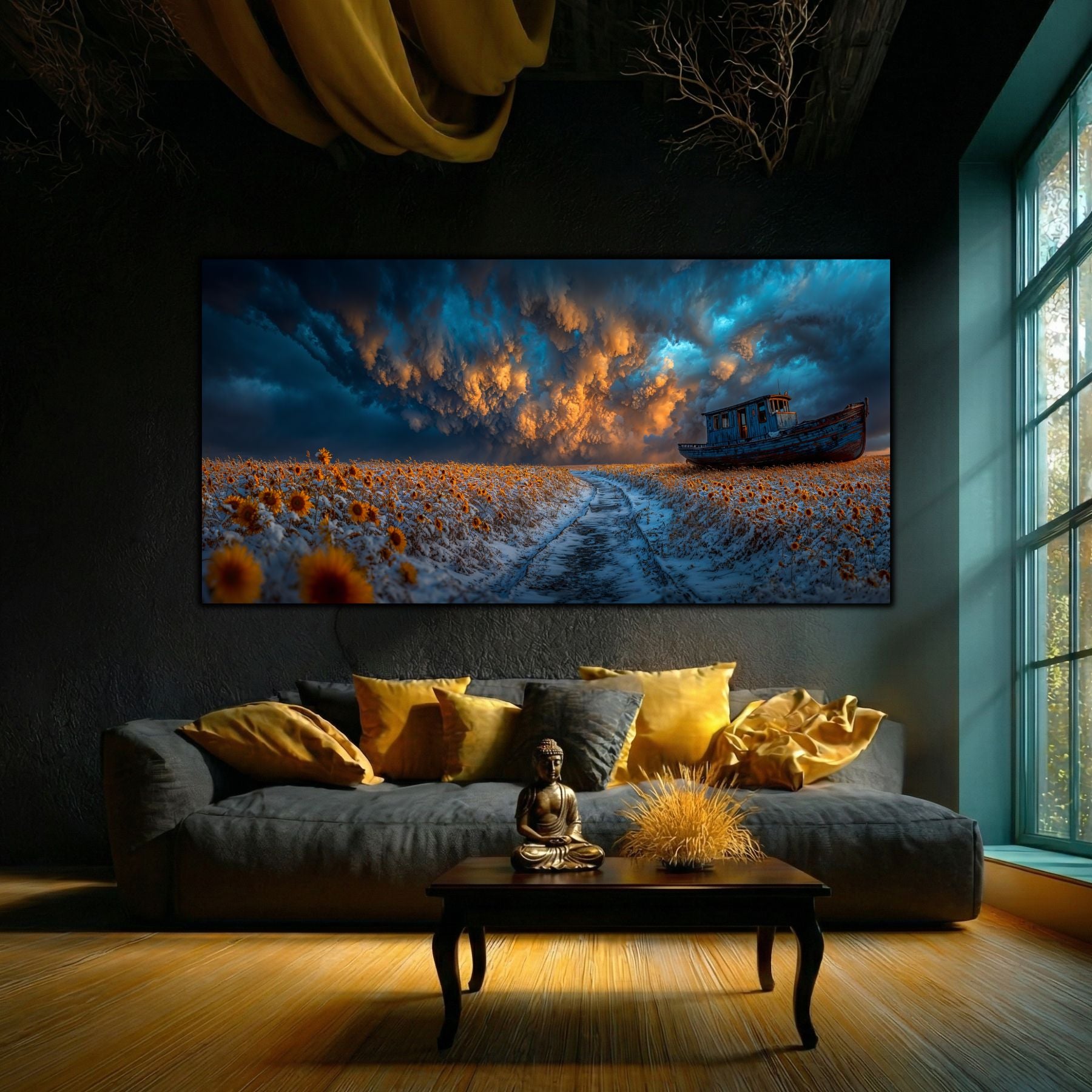 Tablou Living: Plasat in fata intrarii sau pe un perete mare, acest tablou atrage privirea si „impinge” limitele camerei, oferind o senzatie de libertate si spatiu infinit.