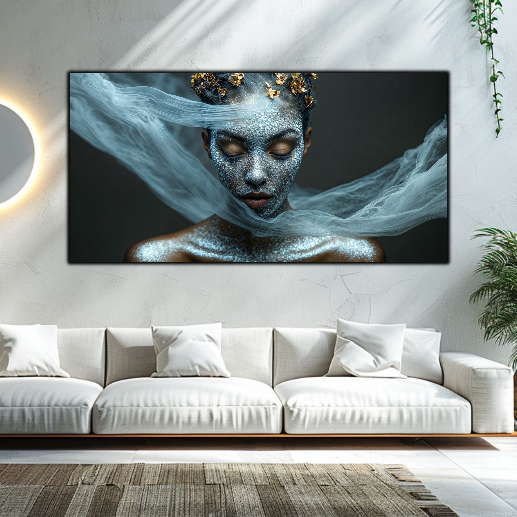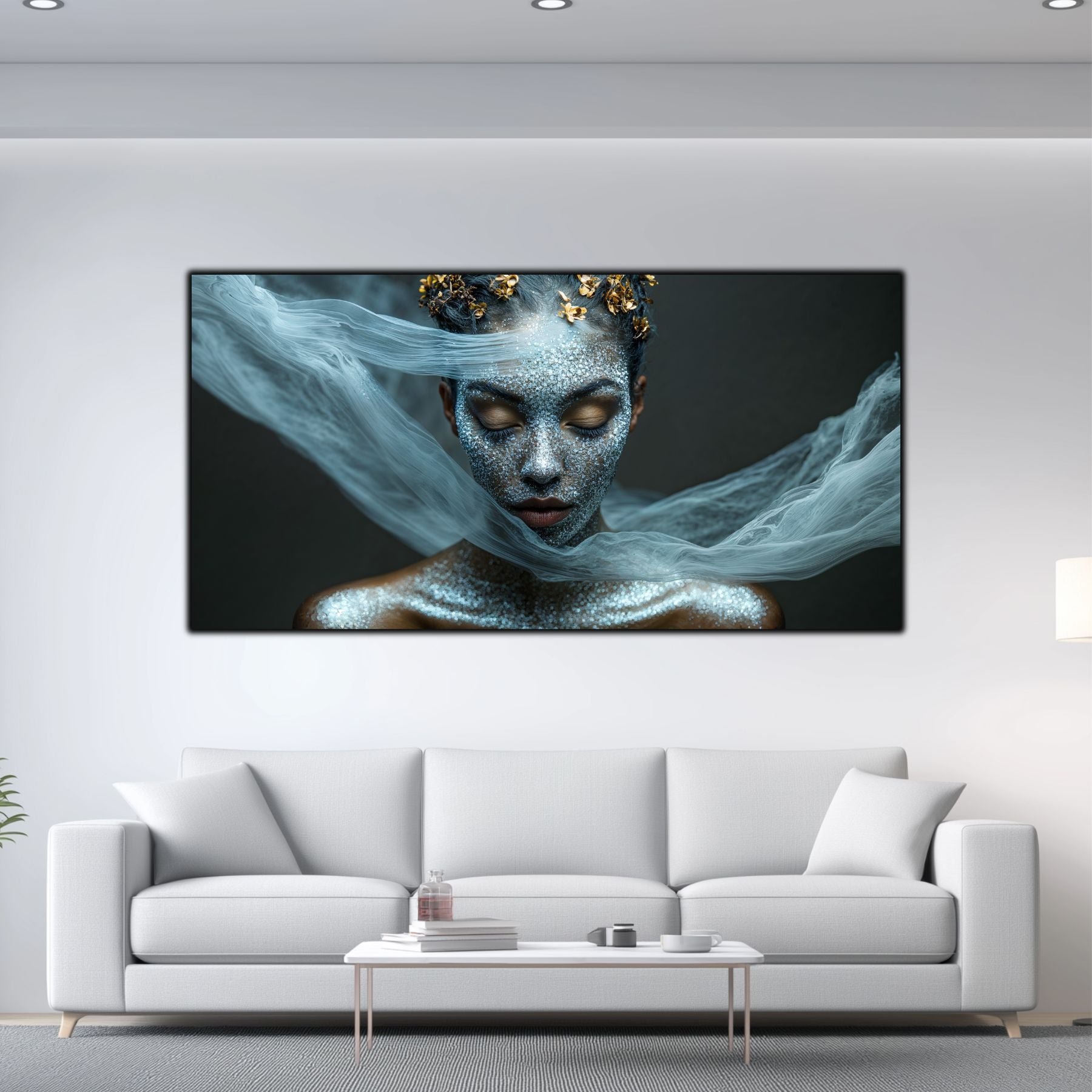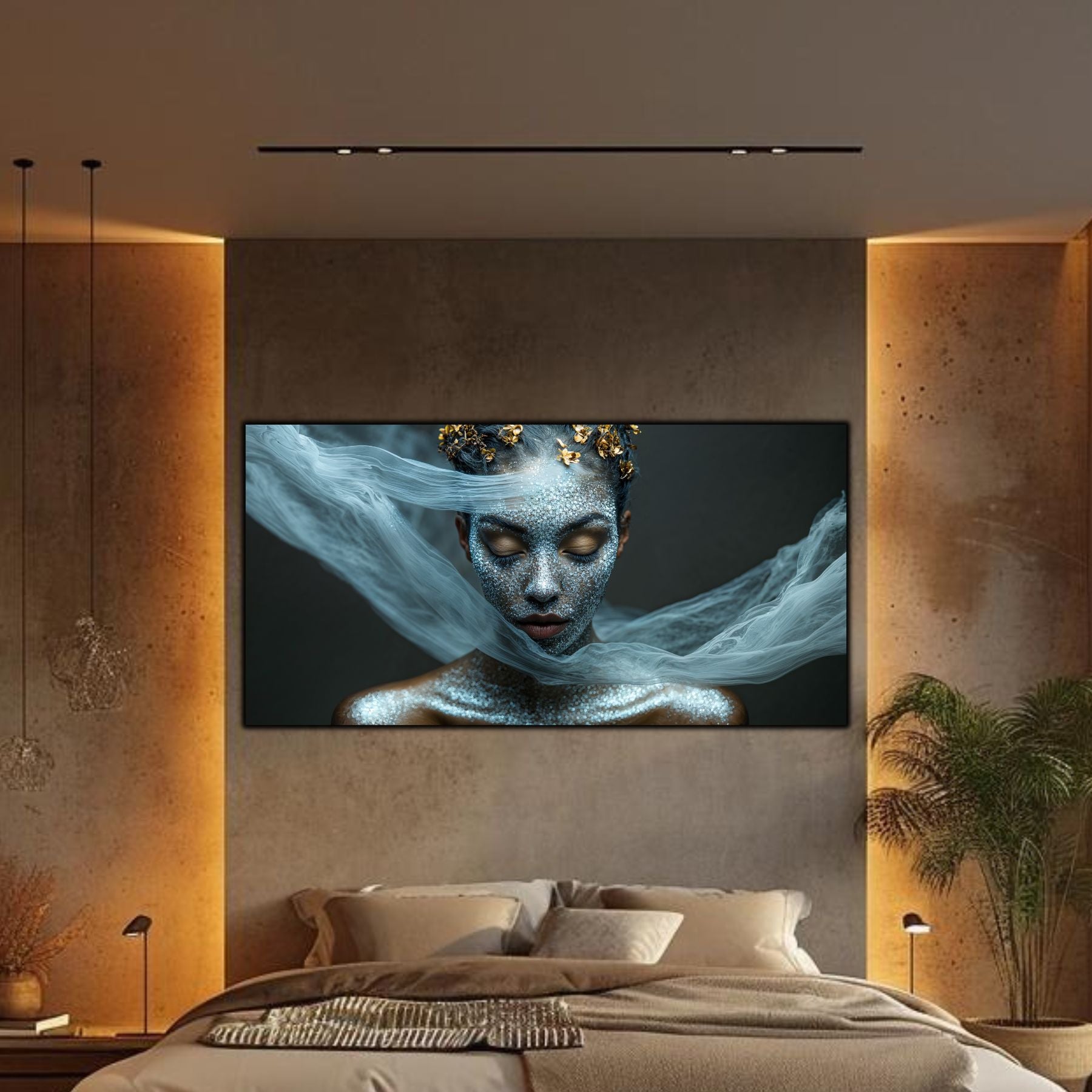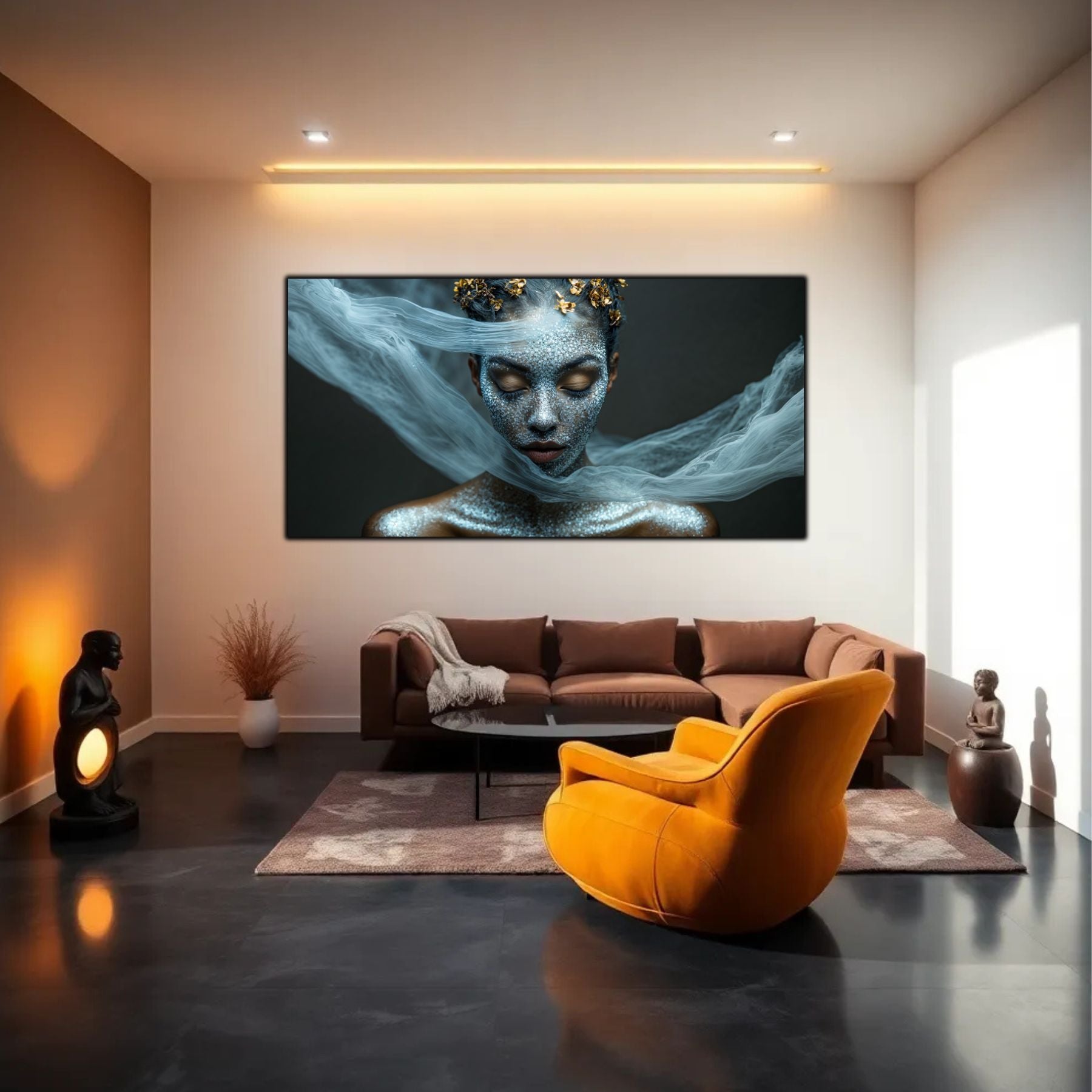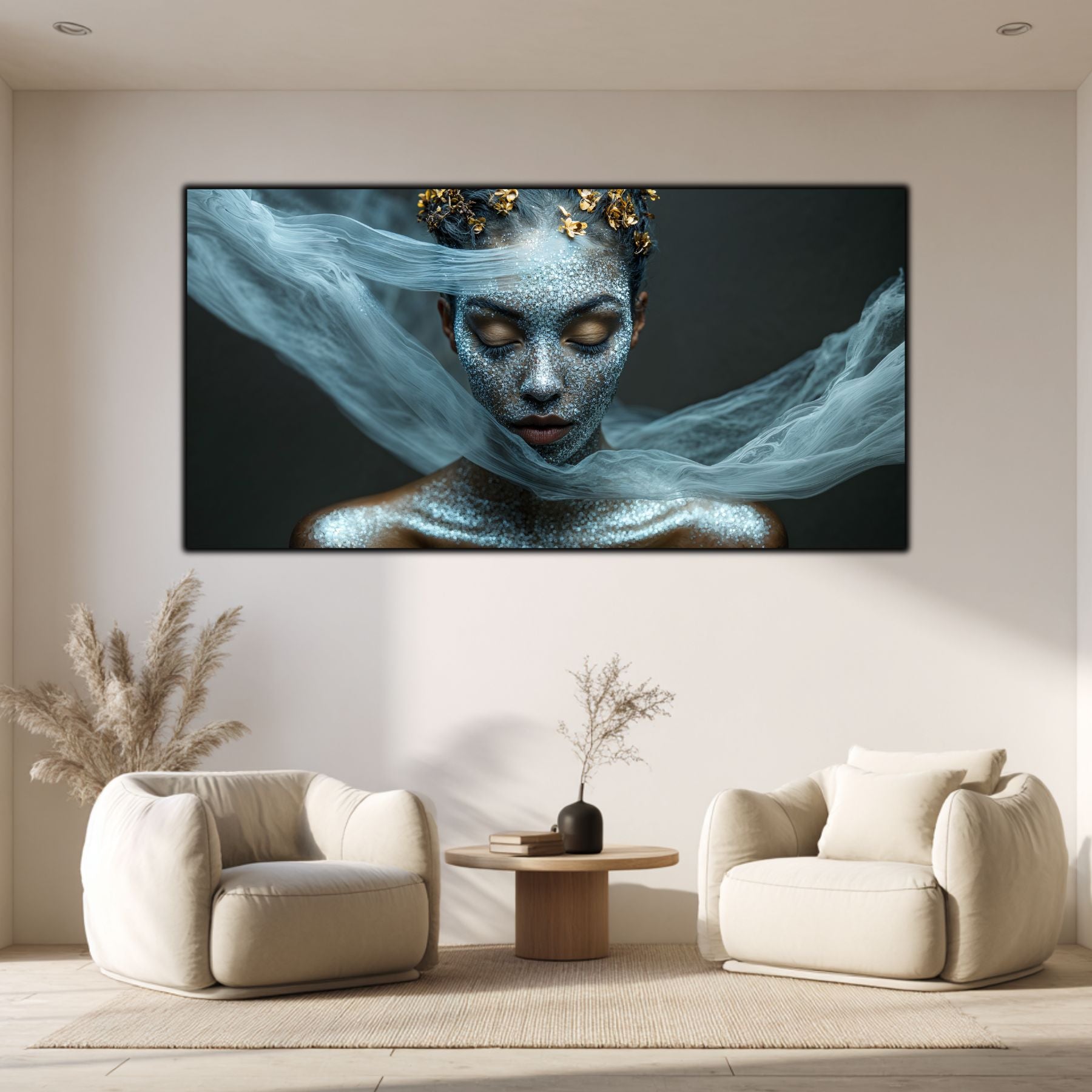 Imaginile prezentate sunt randari digitale realizate pentru a evidentia frumusetea tablourilor. Ele nu respecta proportiile reale in raport cu spatiul, fiind doar o interpretare artistica a modului in care acestea ar putea fi integrate intr-un decor. Va invit sa le „probati” mental pe peretii casei voastre si sa descoperiti cum isi gasesc locul in realitate.