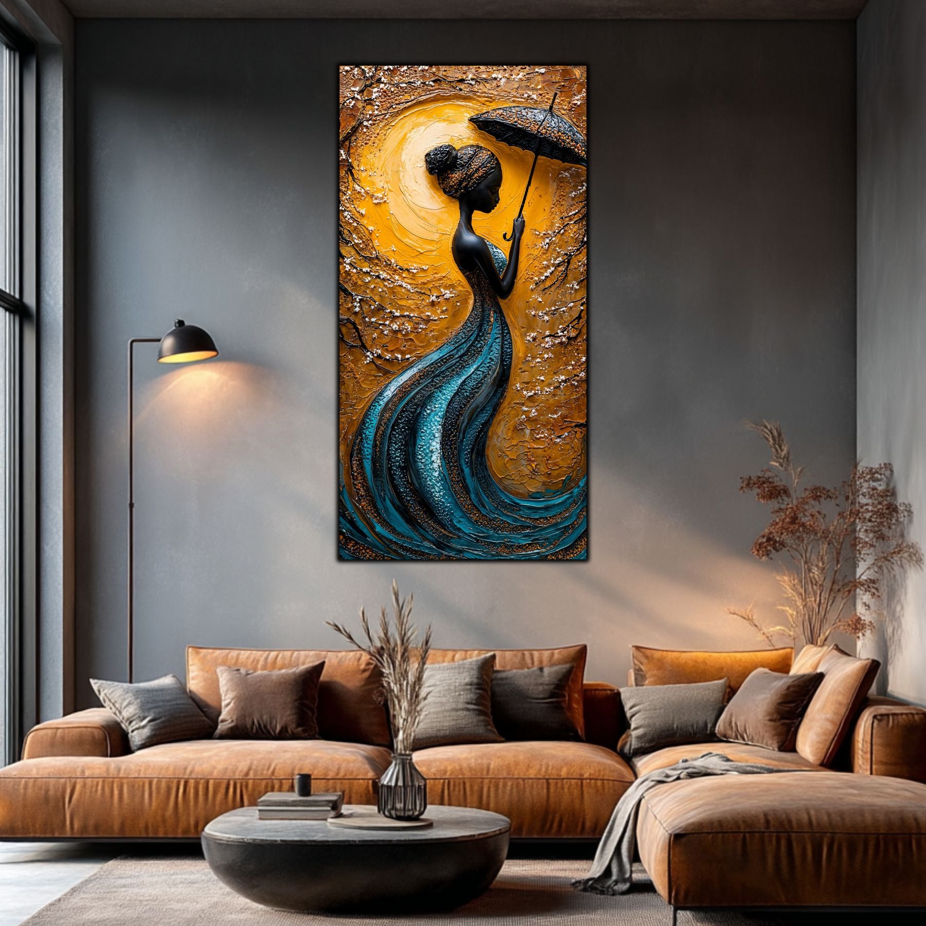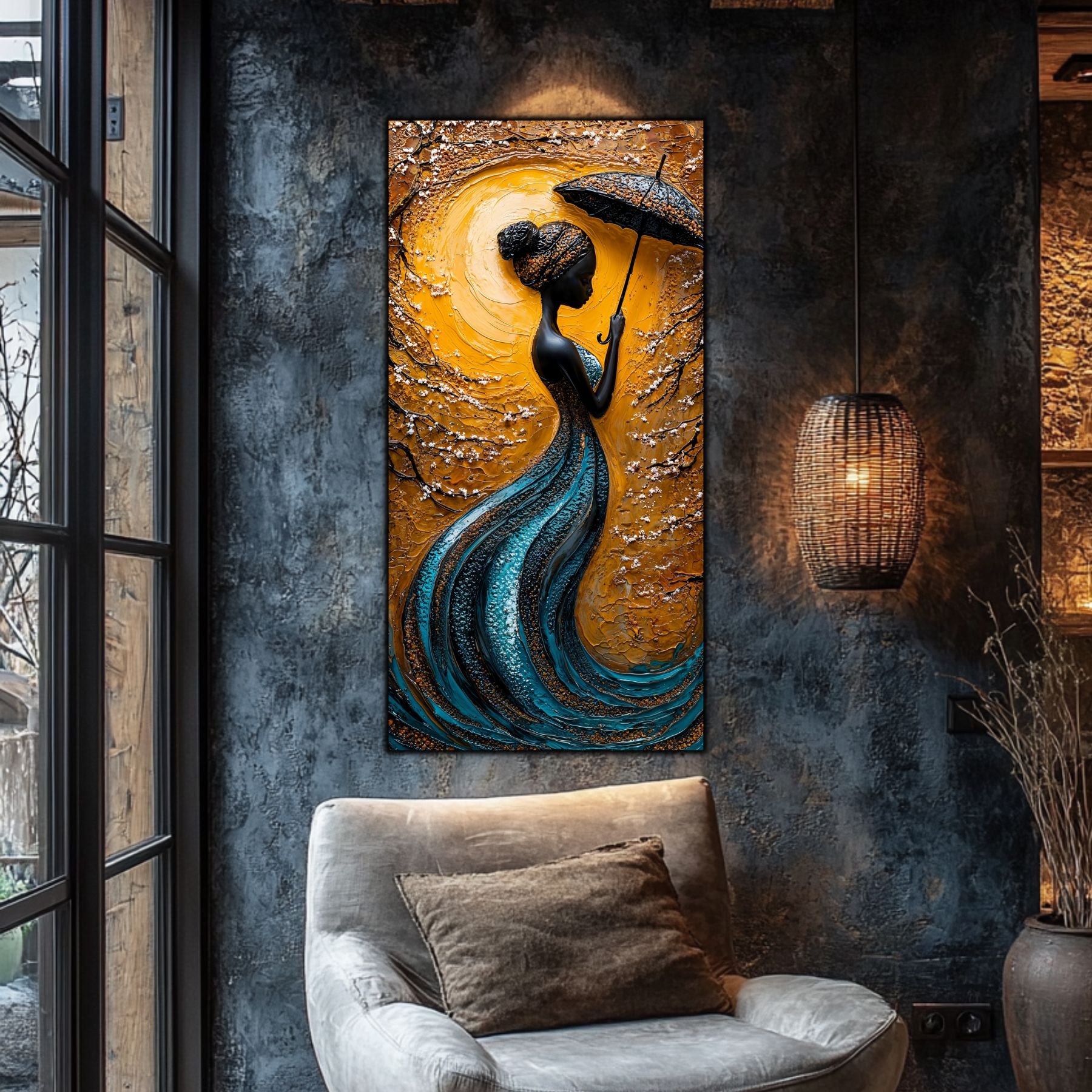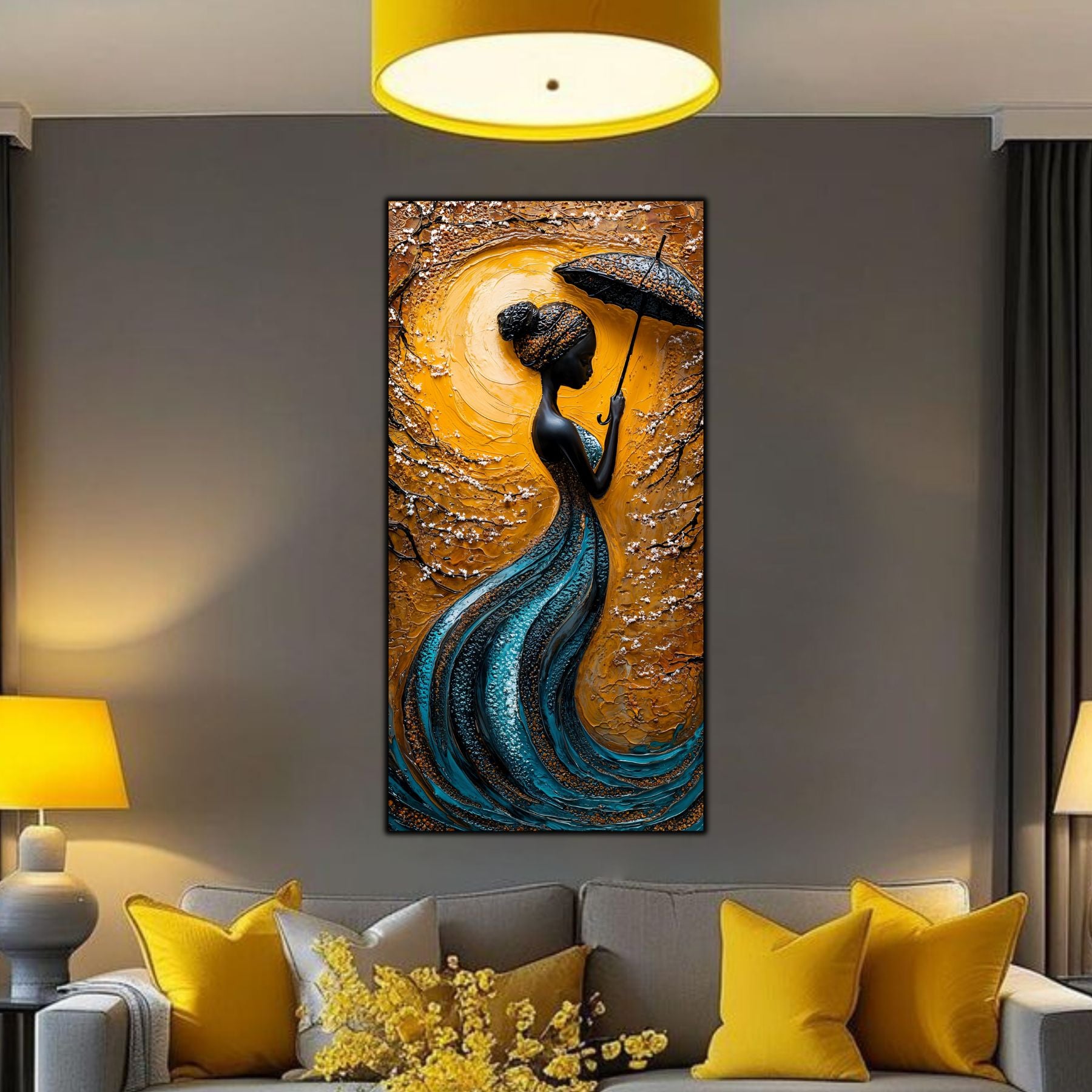Imaginile prezentate sunt randari digitale realizate pentru a evidentia frumusetea tablourilor. Ele nu respecta proportiile reale in raport cu spatiul, fiind doar o interpretare artistica a modului in care acestea ar putea fi integrate intr-un decor. Va invit sa le „probati” mental pe peretii casei voastre si sa descoperiti cum isi gasesc locul in realitate.
