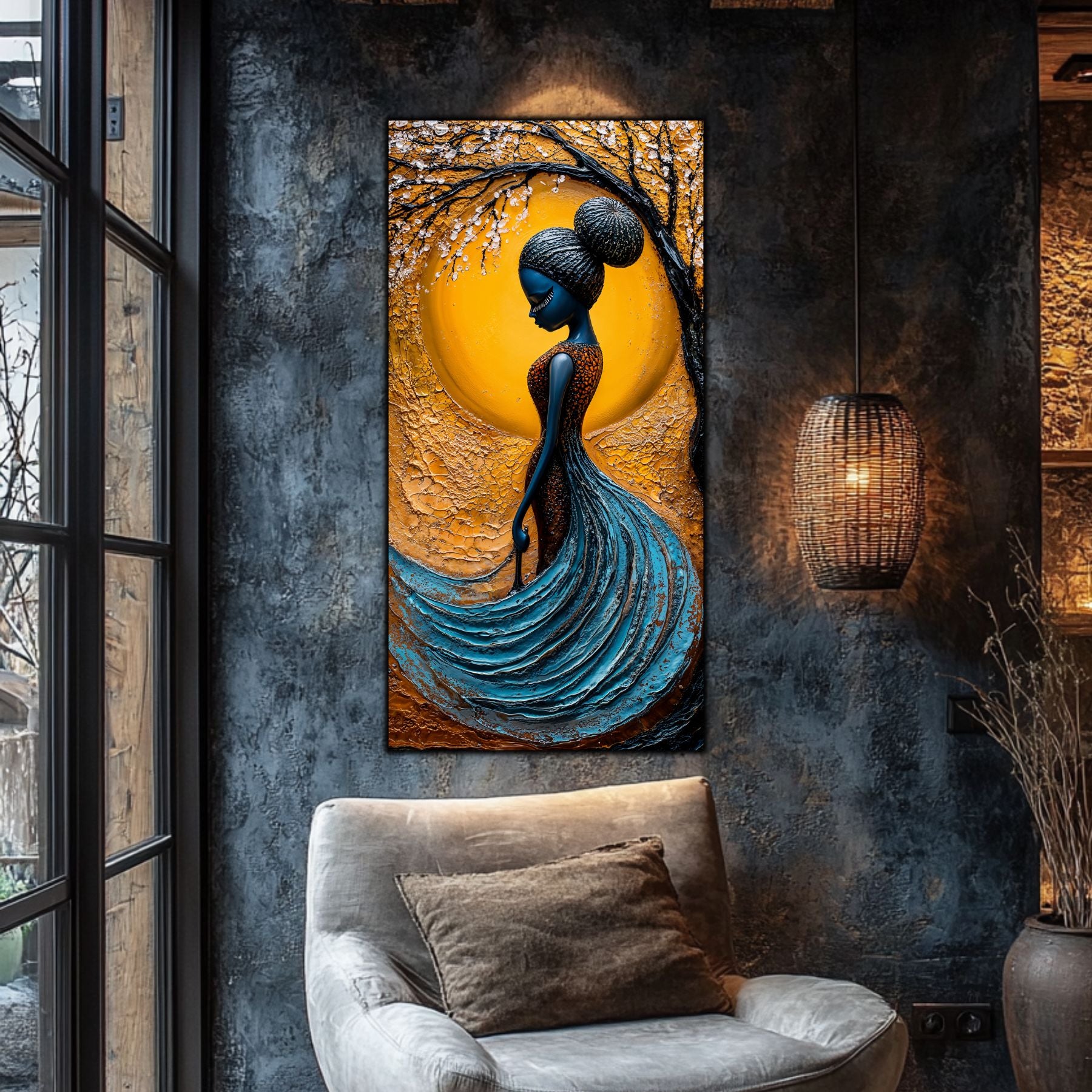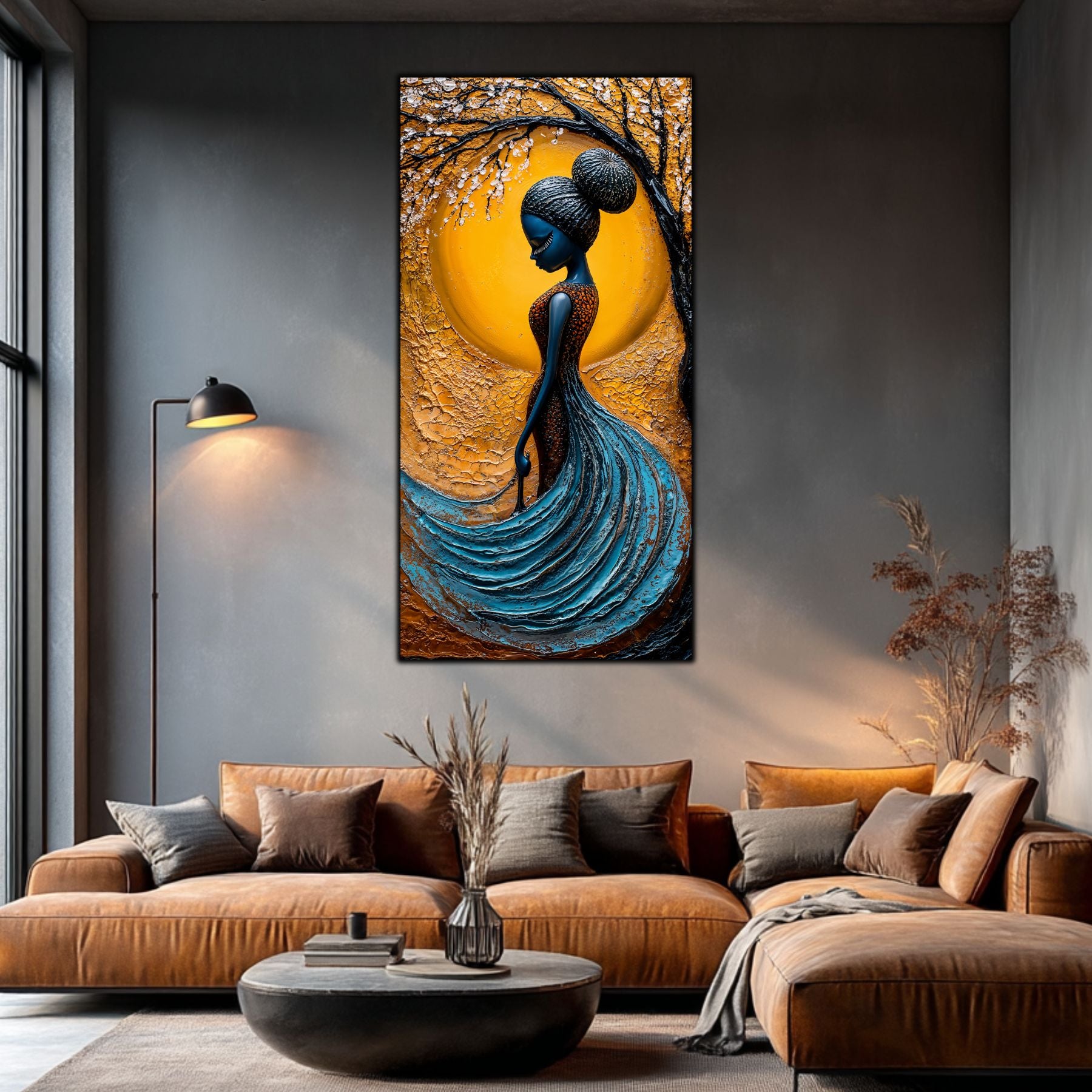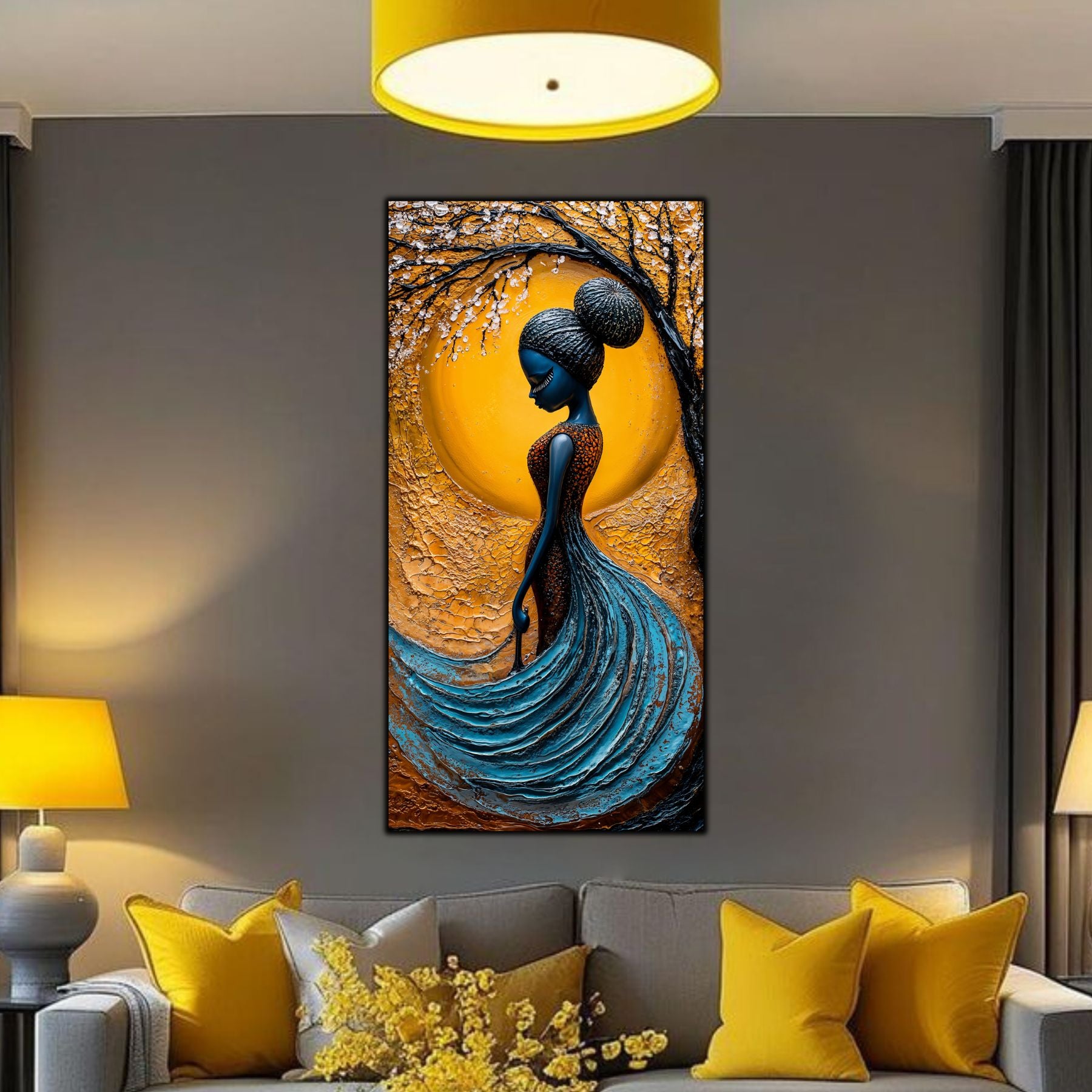 Imaginile prezentate sunt randari digitale realizate pentru a evidentia frumusetea tablourilor. Ele nu respecta proportiile reale in raport cu spatiul, fiind doar o interpretare artistica a modului in care acestea ar putea fi integrate intr-un decor. Va invit sa le „probati” mental pe peretii casei voastre si sa descoperiti cum isi gasesc locul in realitate.