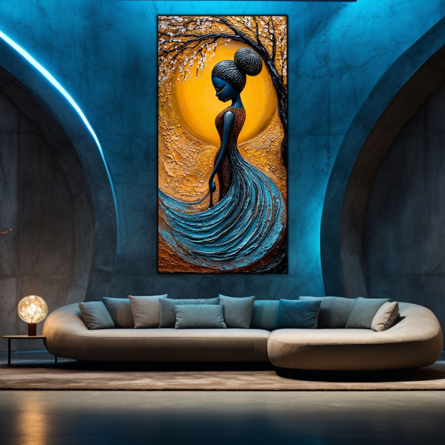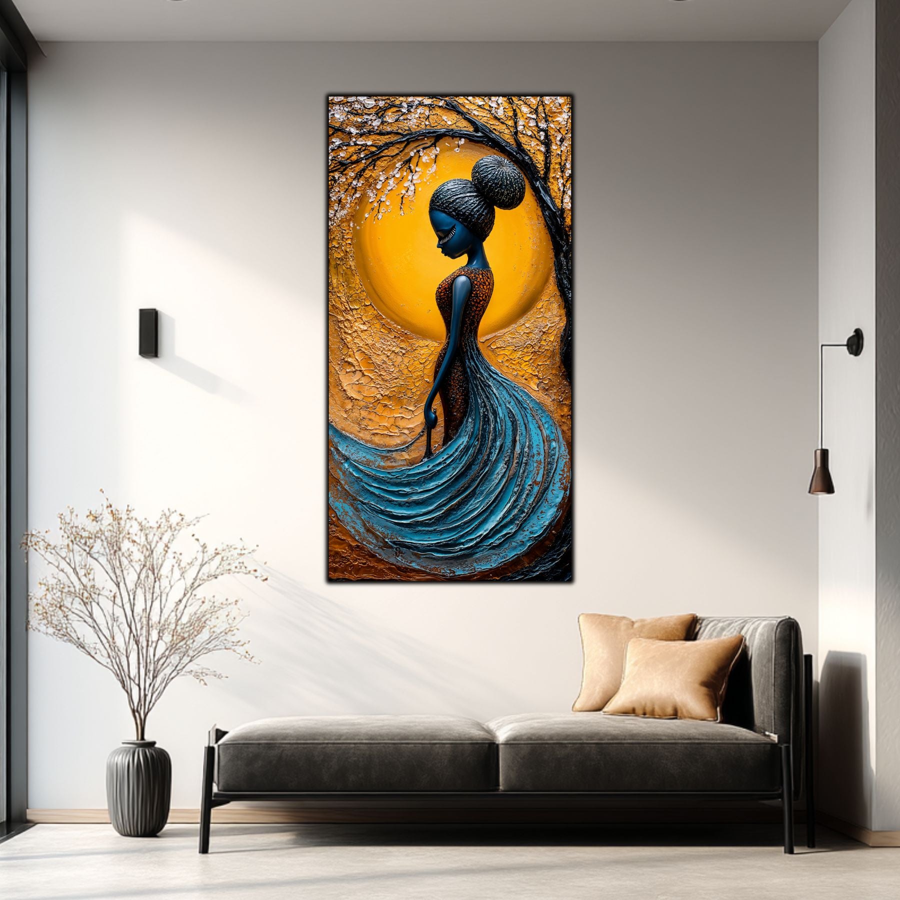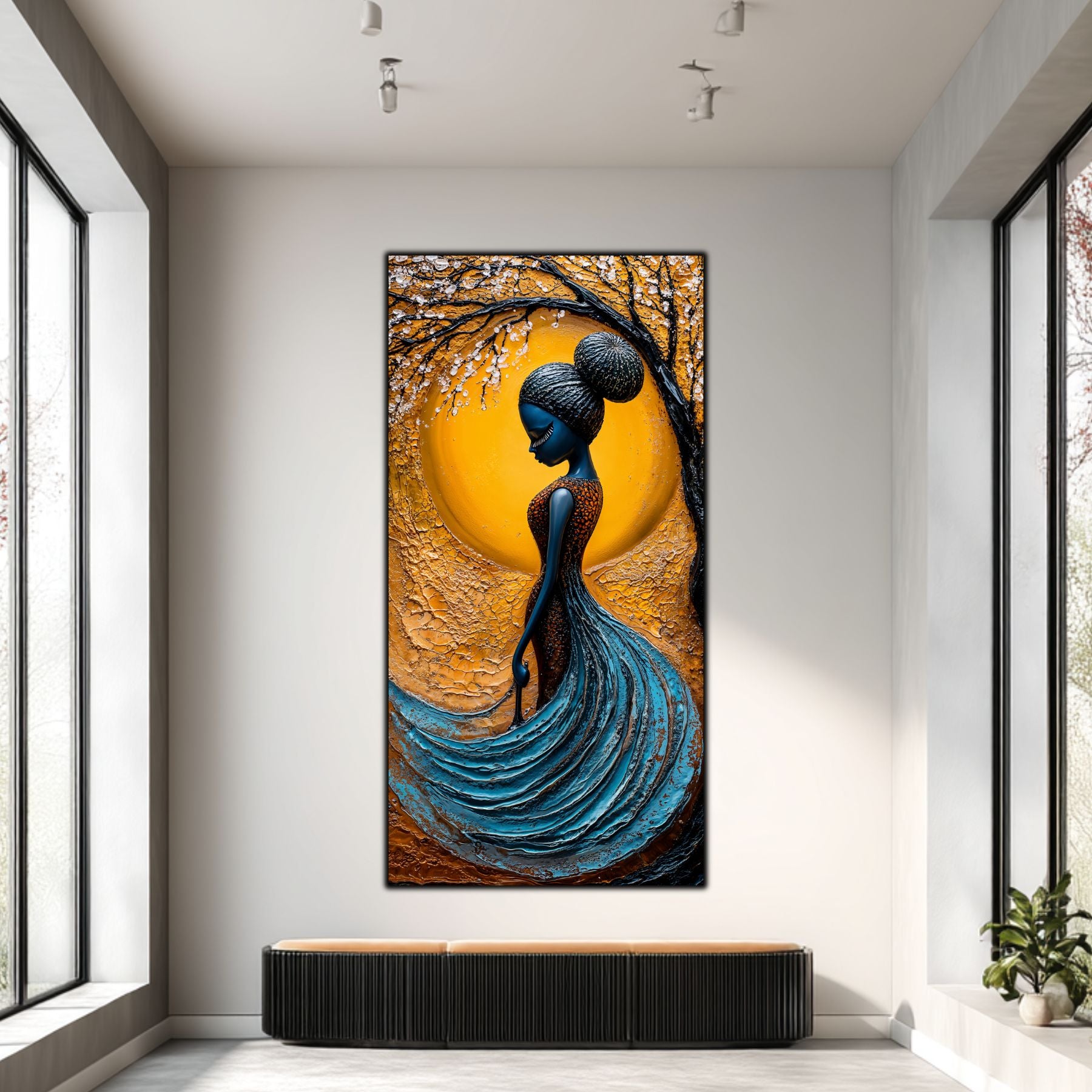 Imaginile prezentate sunt randari digitale realizate pentru a evidentia frumusetea tablourilor. Ele nu respecta proportiile reale in raport cu spatiul, fiind doar o interpretare artistica a modului in care acestea ar putea fi integrate intr-un decor. Va invit sa le „probati” mental pe peretii casei voastre si sa descoperiti cum isi gasesc locul in realitate.
