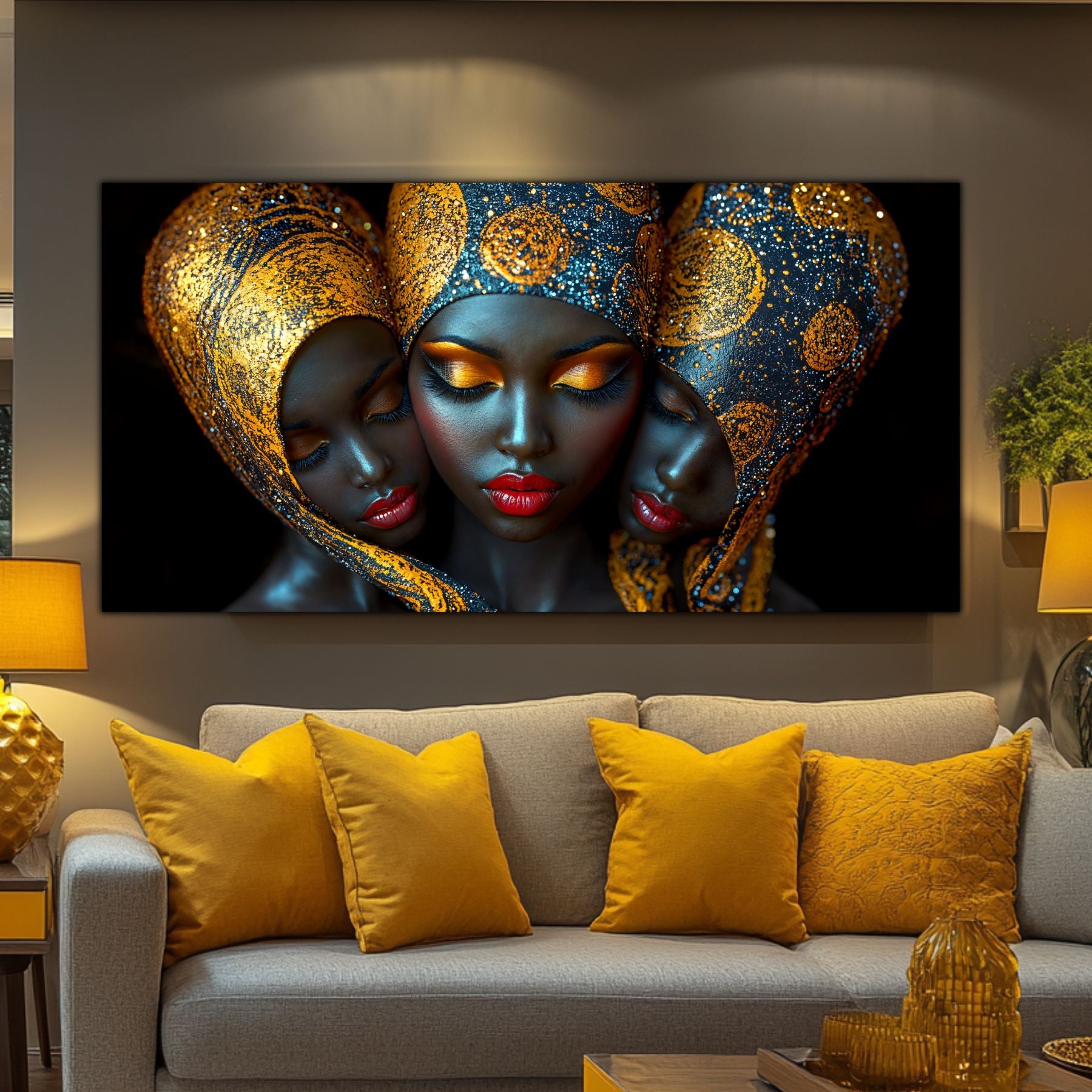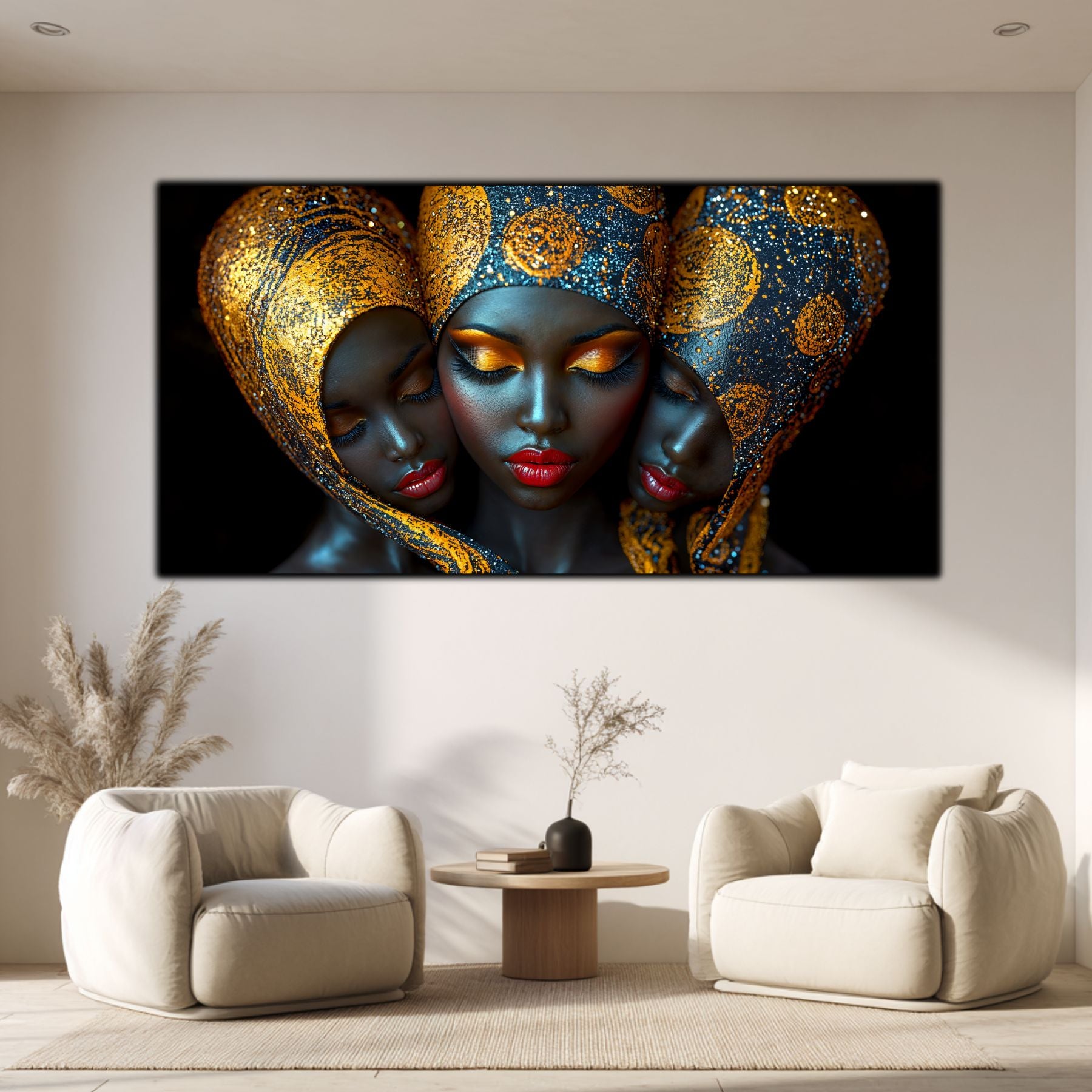 Imaginile prezentate sunt randari digitale realizate pentru a evidentia frumusetea tablourilor. Ele nu respecta proportiile reale in raport cu spatiul, fiind doar o interpretare artistica a modului in care acestea ar putea fi integrate intr-un decor. Va invit sa le „probati” mental pe peretii casei voastre si sa descoperiti cum isi gasesc locul in realitate.