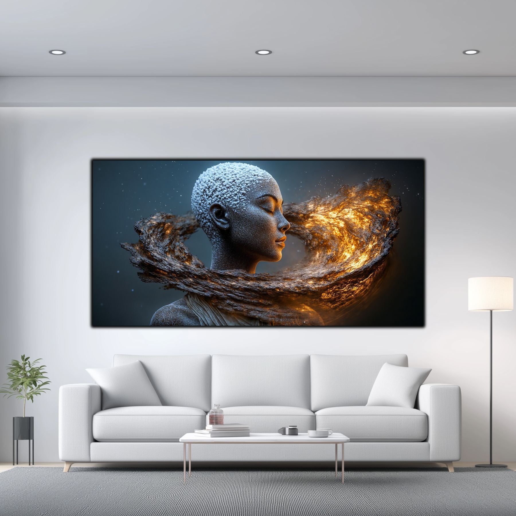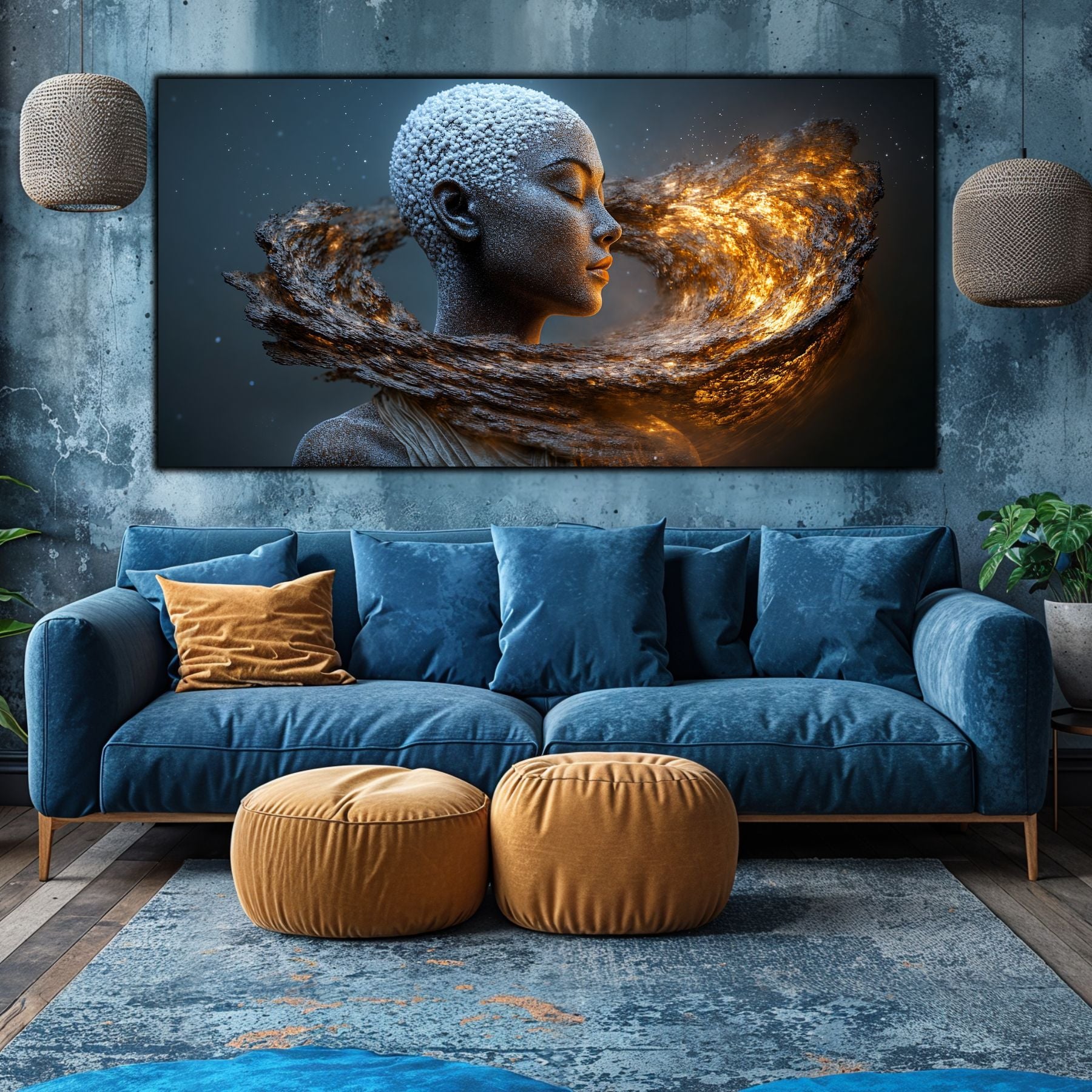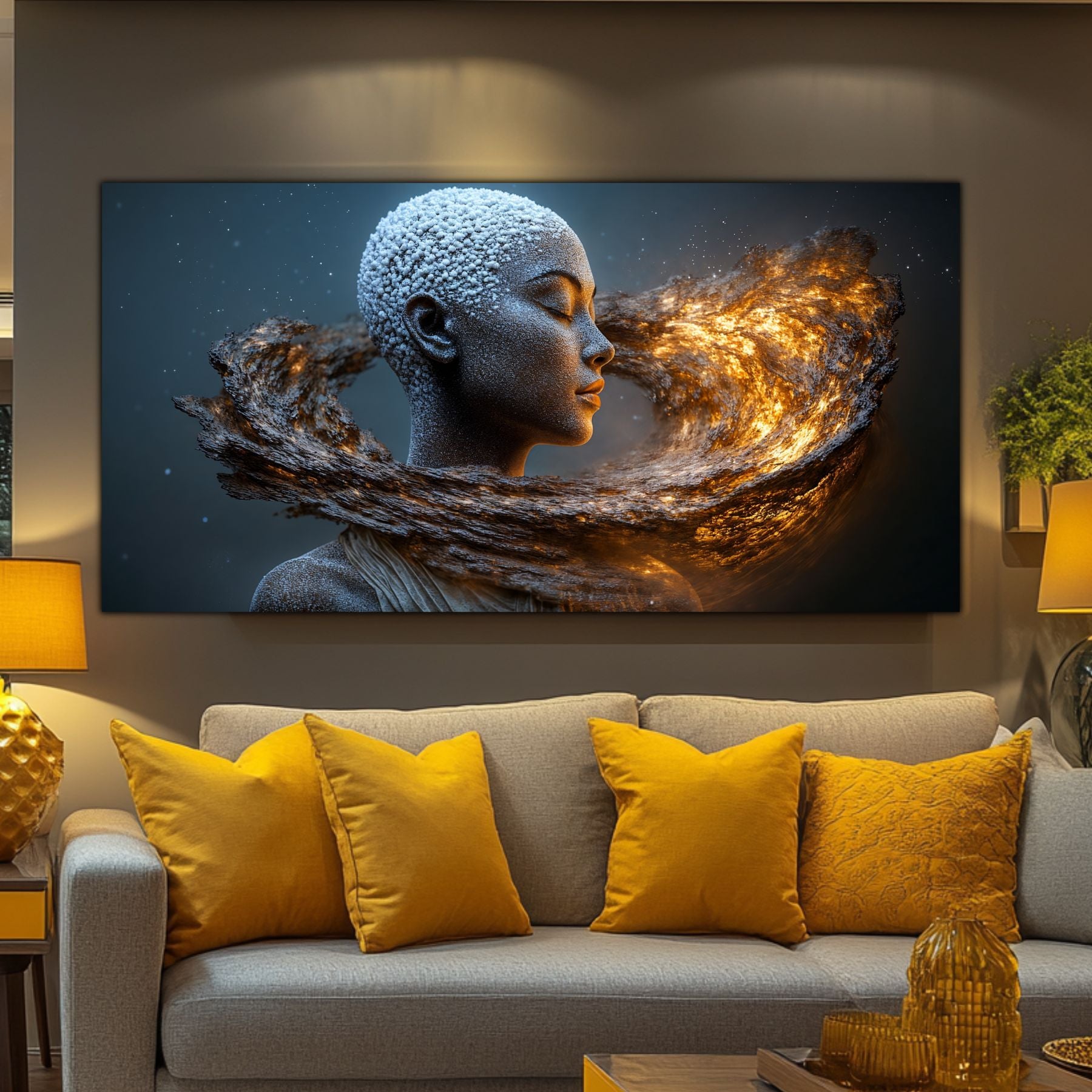 Imaginile prezentate sunt randari digitale realizate pentru a evidentia frumusetea tablourilor. Ele nu respecta proportiile reale in raport cu spatiul, fiind doar o interpretare artistica a modului in care acestea ar putea fi integrate intr-un decor. Va invit sa le „probati” mental pe peretii casei voastre si sa descoperiti cum isi gasesc locul in realitate.
