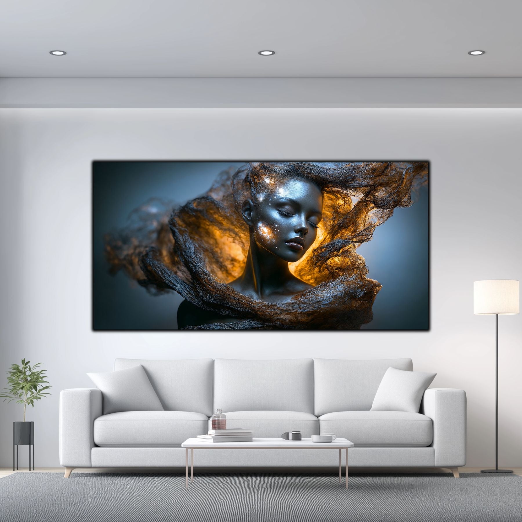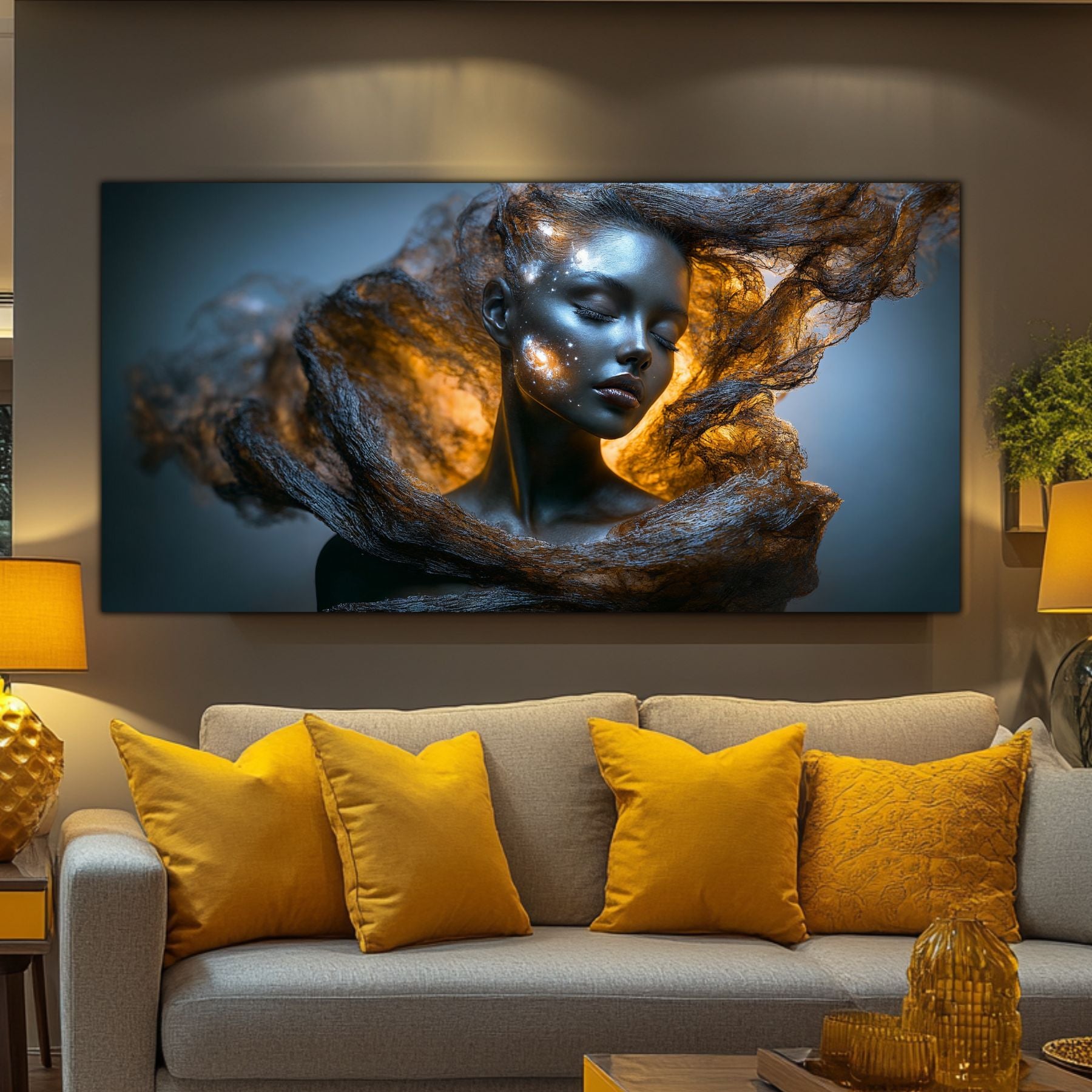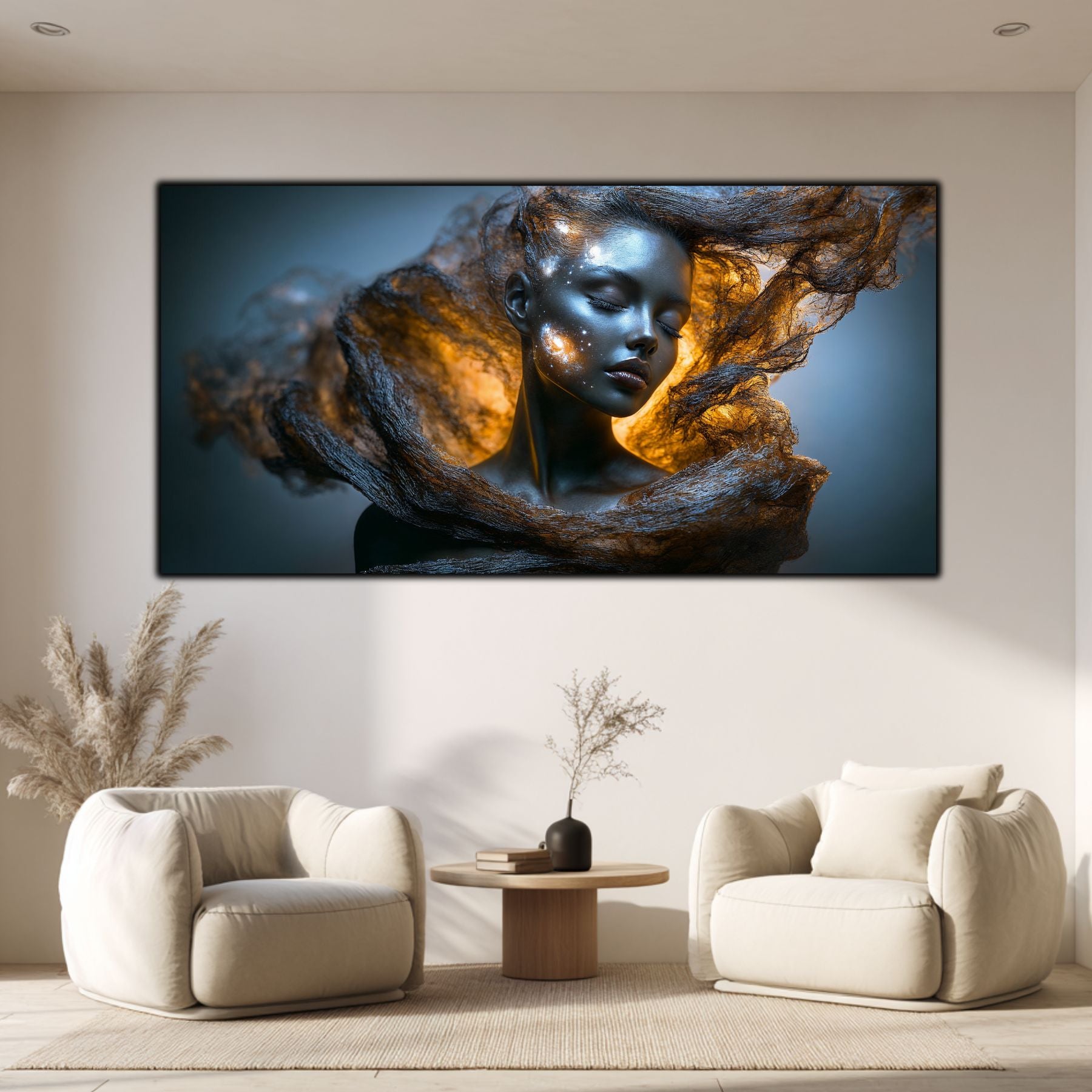 Imaginile prezentate sunt randari digitale realizate pentru a evidentia frumusetea tablourilor. Ele nu respecta proportiile reale in raport cu spatiul, fiind doar o interpretare artistica a modului in care acestea ar putea fi integrate intr-un decor. Va invit sa le „probati” mental pe peretii casei voastre si sa descoperiti cum isi gasesc locul in realitate.