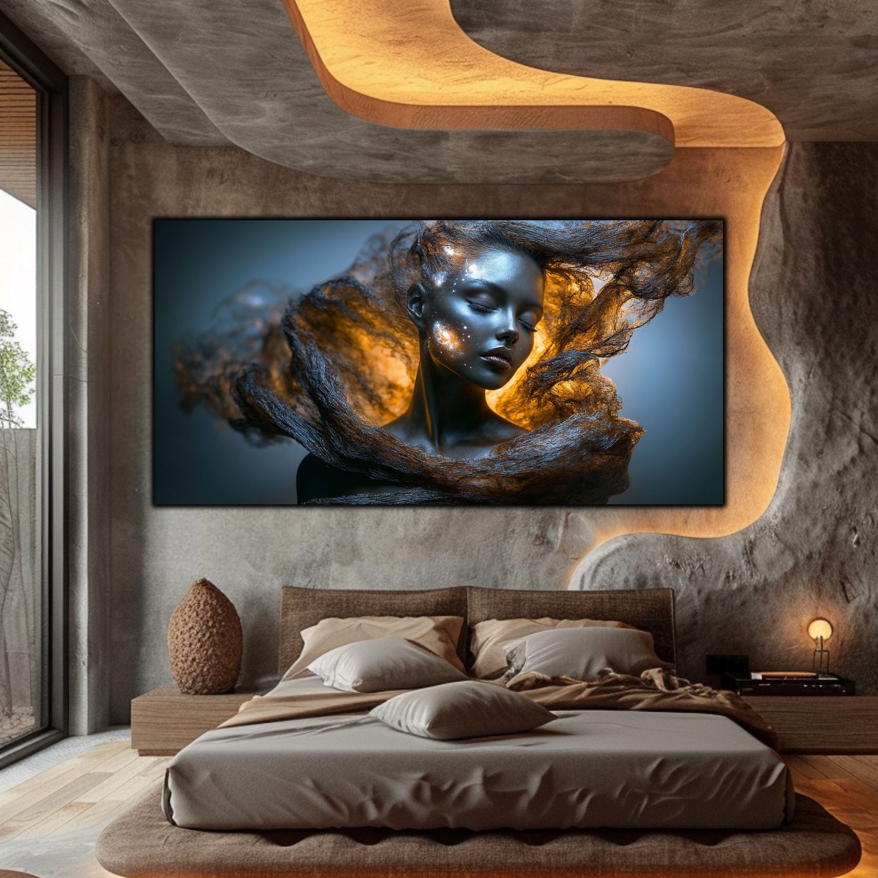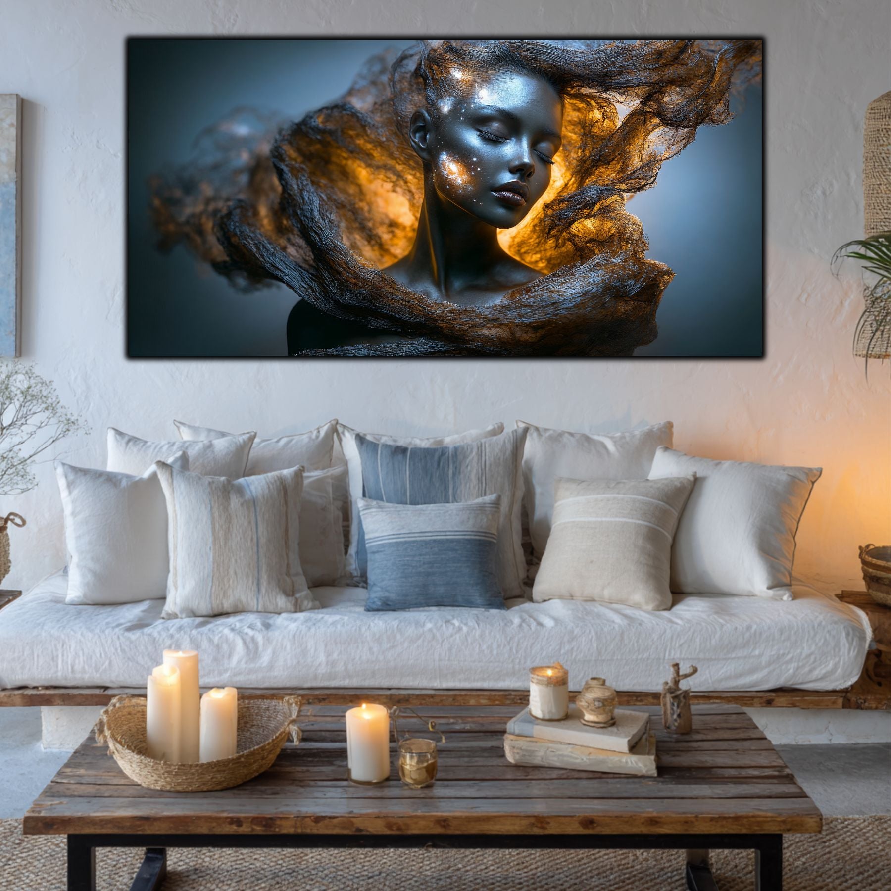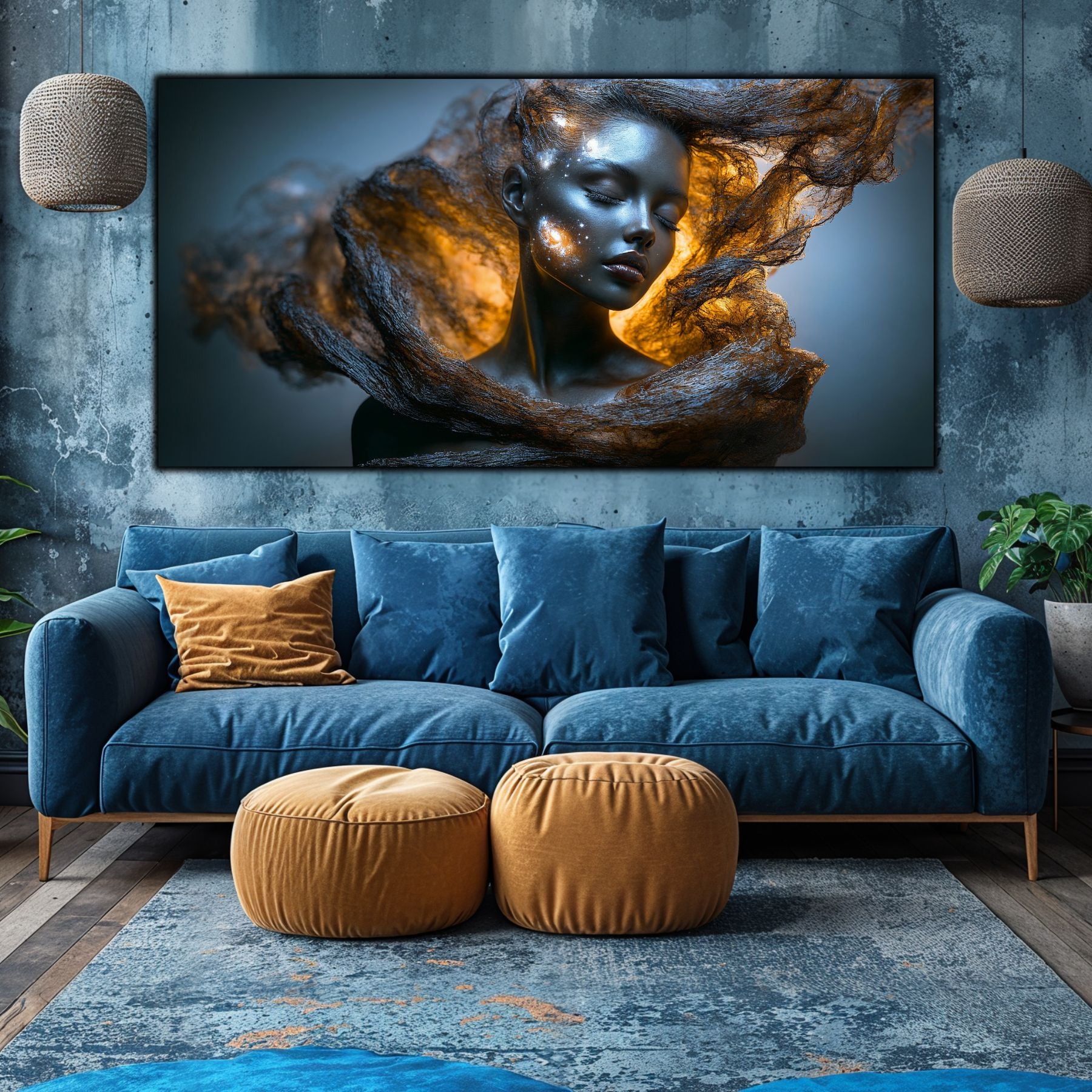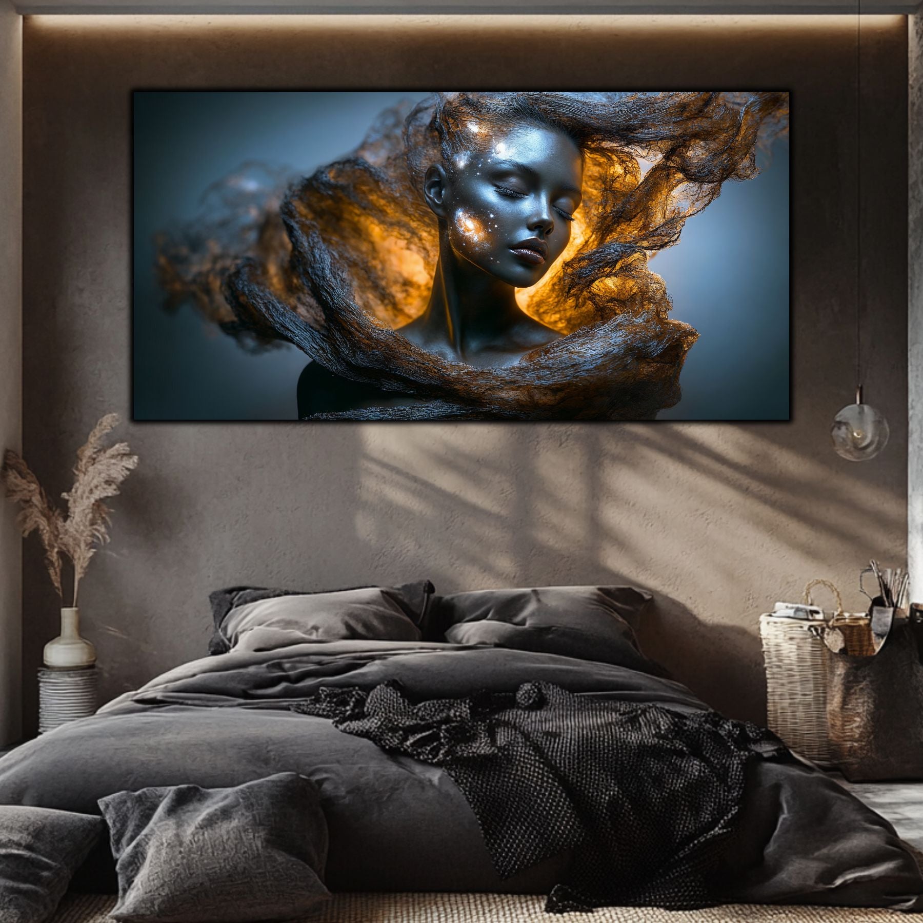Imaginile prezentate sunt randari digitale realizate pentru a evidentia frumusetea tablourilor. Ele nu respecta proportiile reale in raport cu spatiul, fiind doar o interpretare artistica a modului in care acestea ar putea fi integrate intr-un decor. Va invit sa le „probati” mental pe peretii casei voastre si sa descoperiti cum isi gasesc locul in realitate.