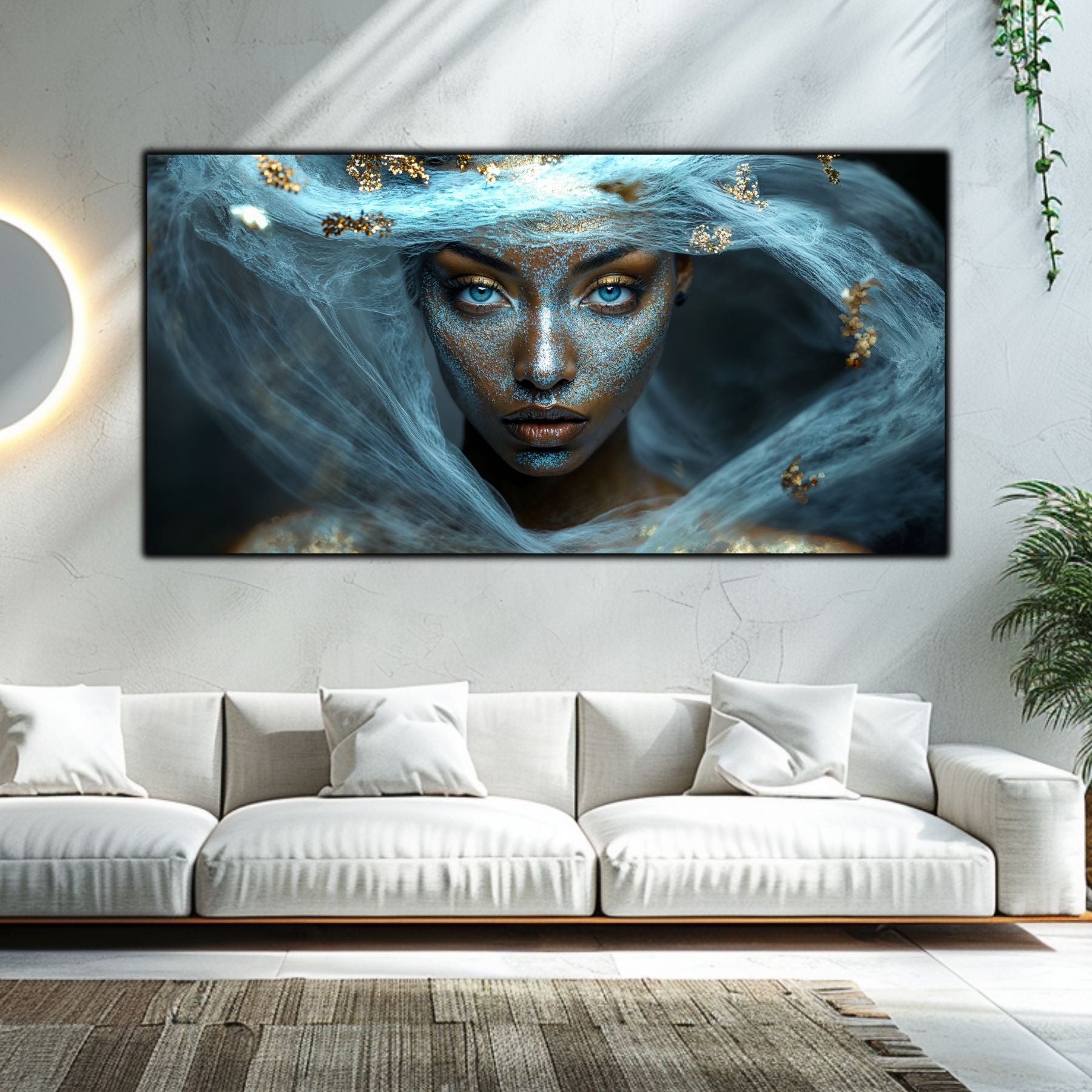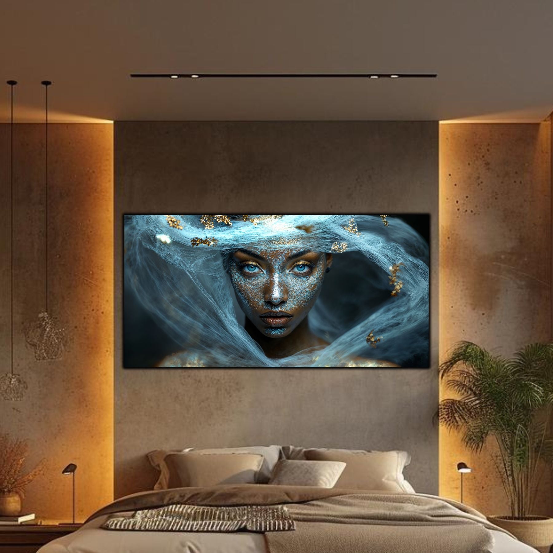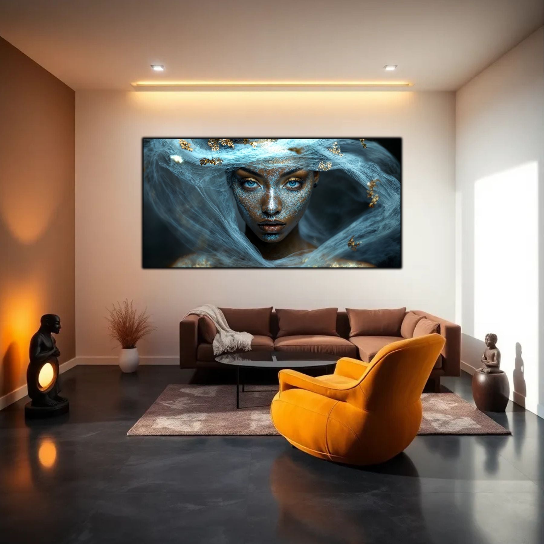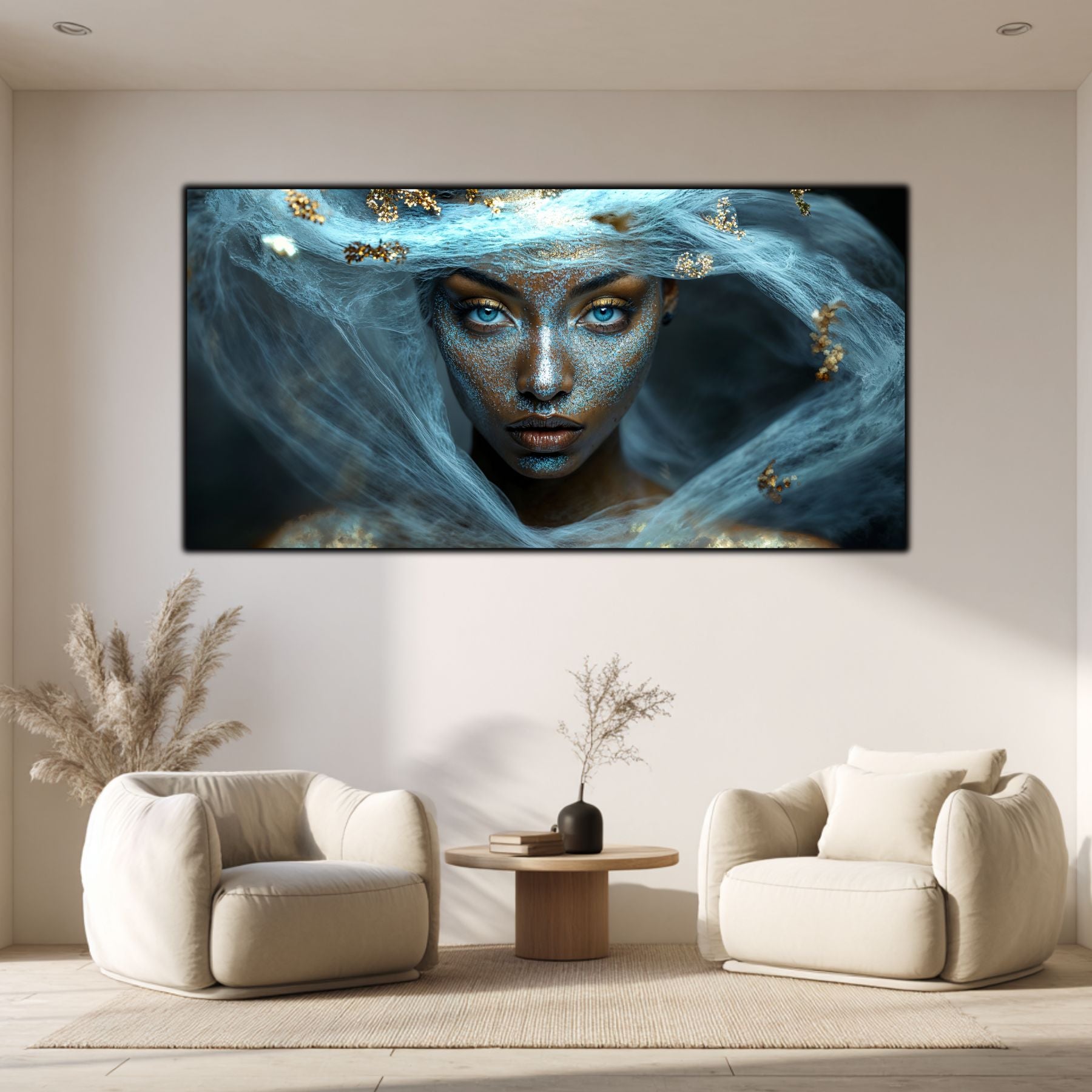 Imaginile prezentate sunt randari digitale realizate pentru a evidentia frumusetea tablourilor. Ele nu respecta proportiile reale in raport cu spatiul, fiind doar o interpretare artistica a modului in care acestea ar putea fi integrate intr-un decor. Va invit sa le „probati” mental pe peretii casei voastre si sa descoperiti cum isi gasesc locul in realitate.