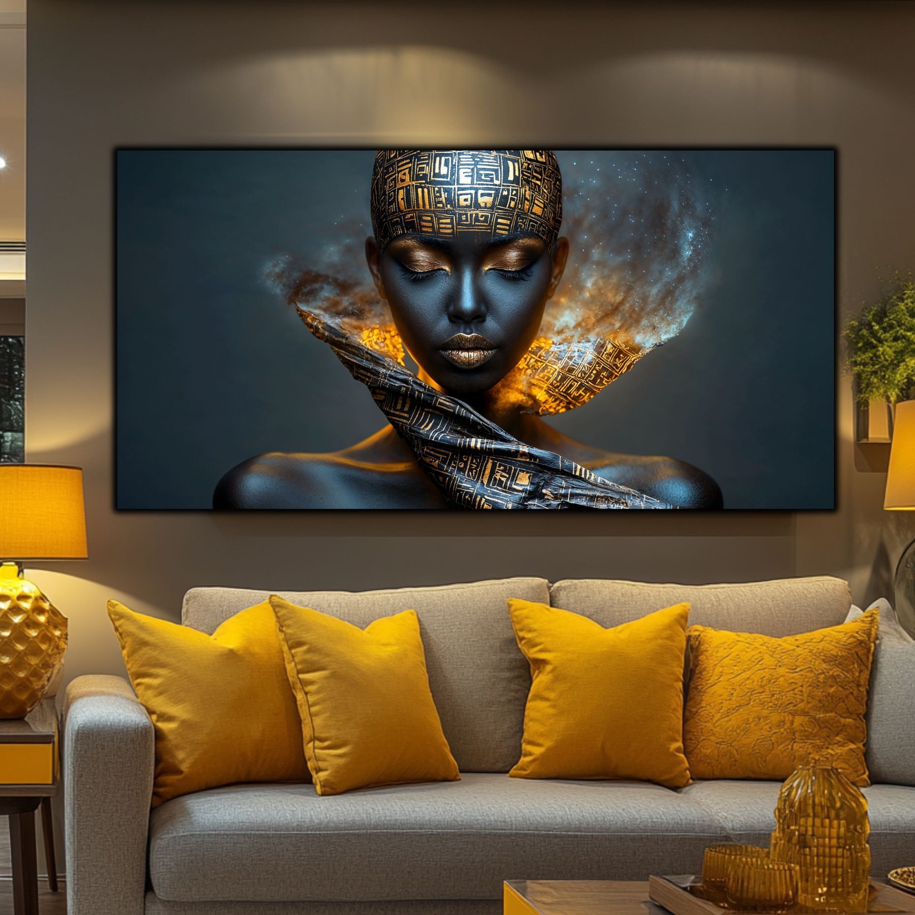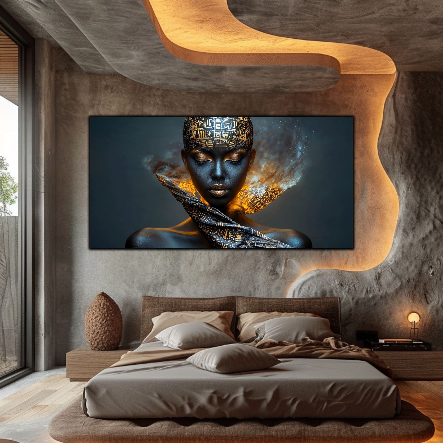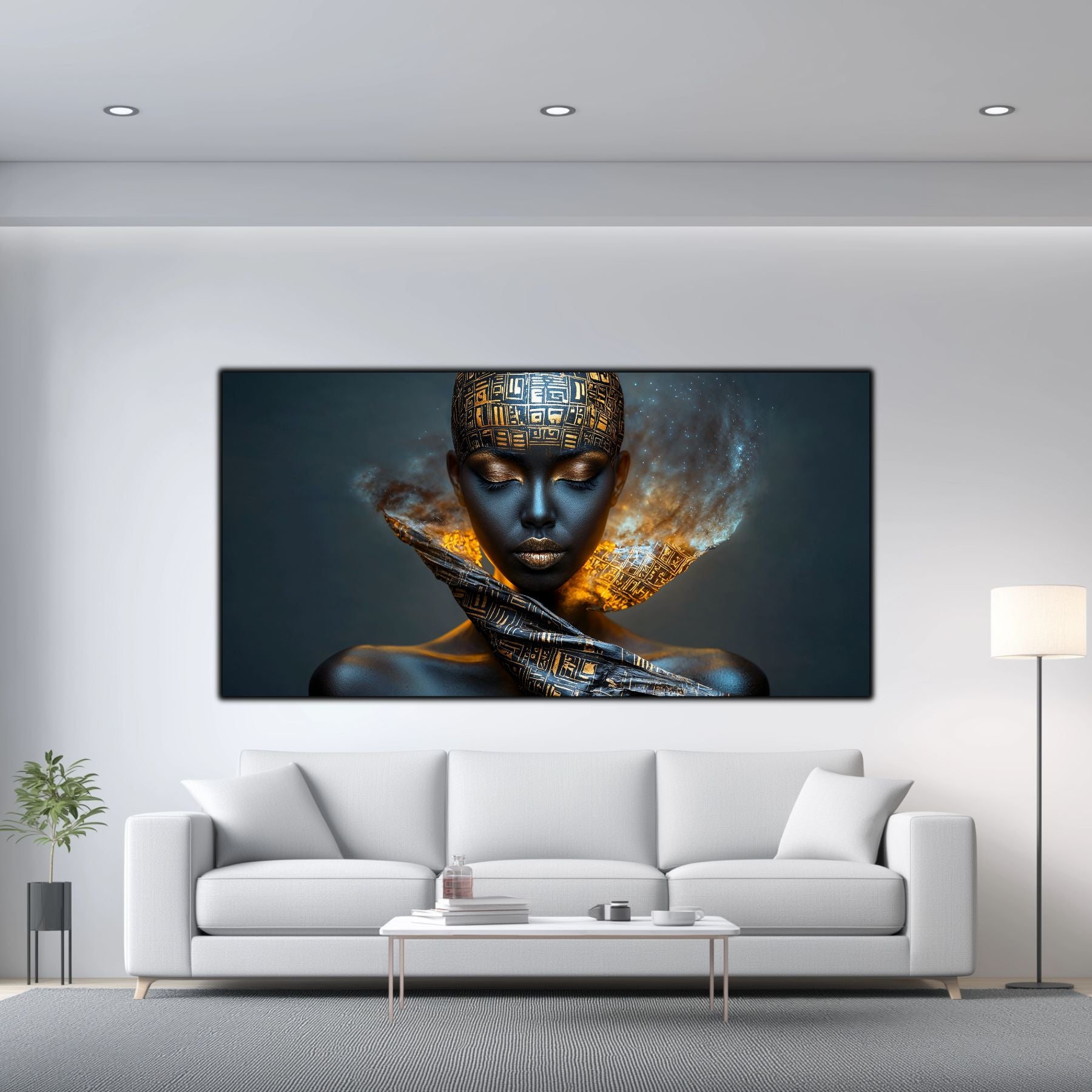 Tablou modern pe sticlă, din colecția „Dark StarDust”. Negru cosmic, accente aurii și mister astral pentru un decor luxury exclusivist.