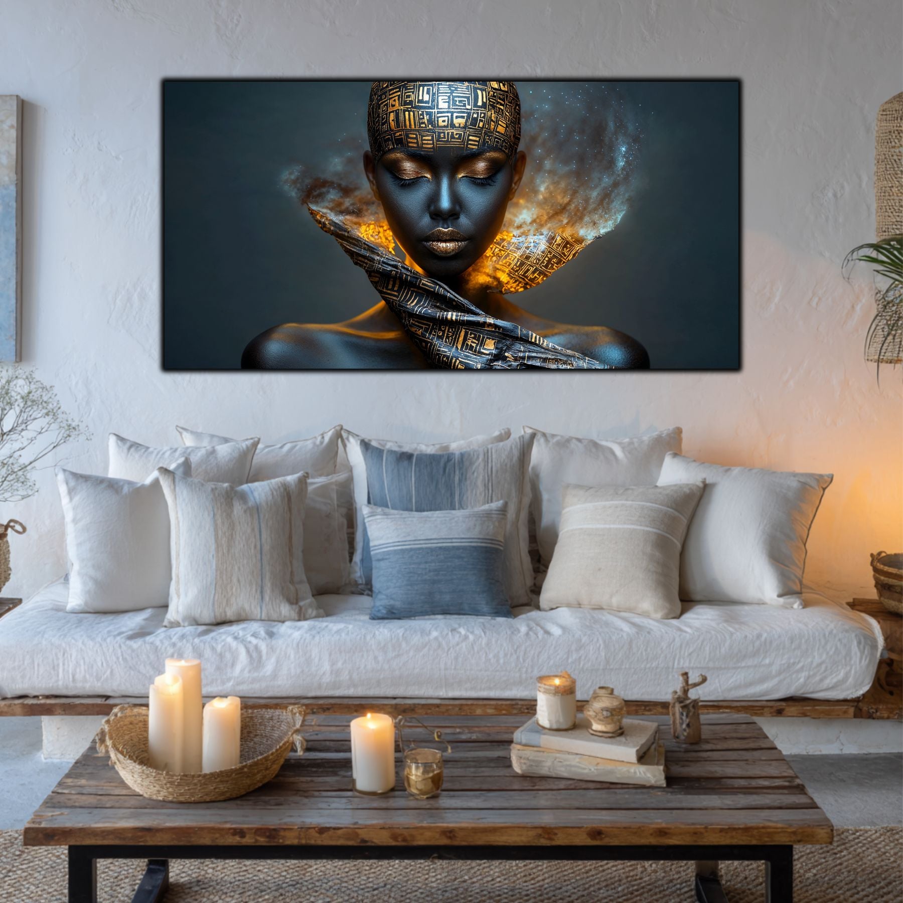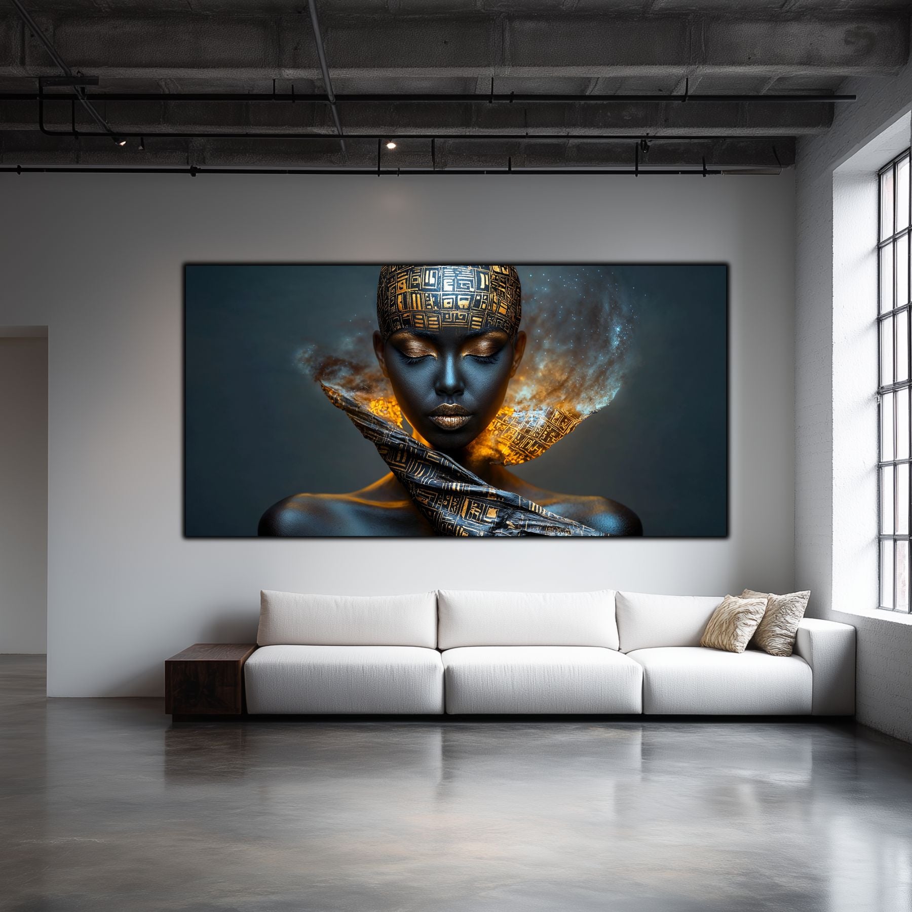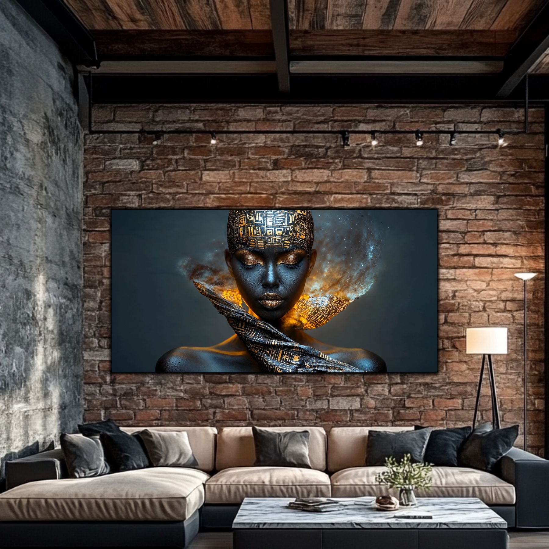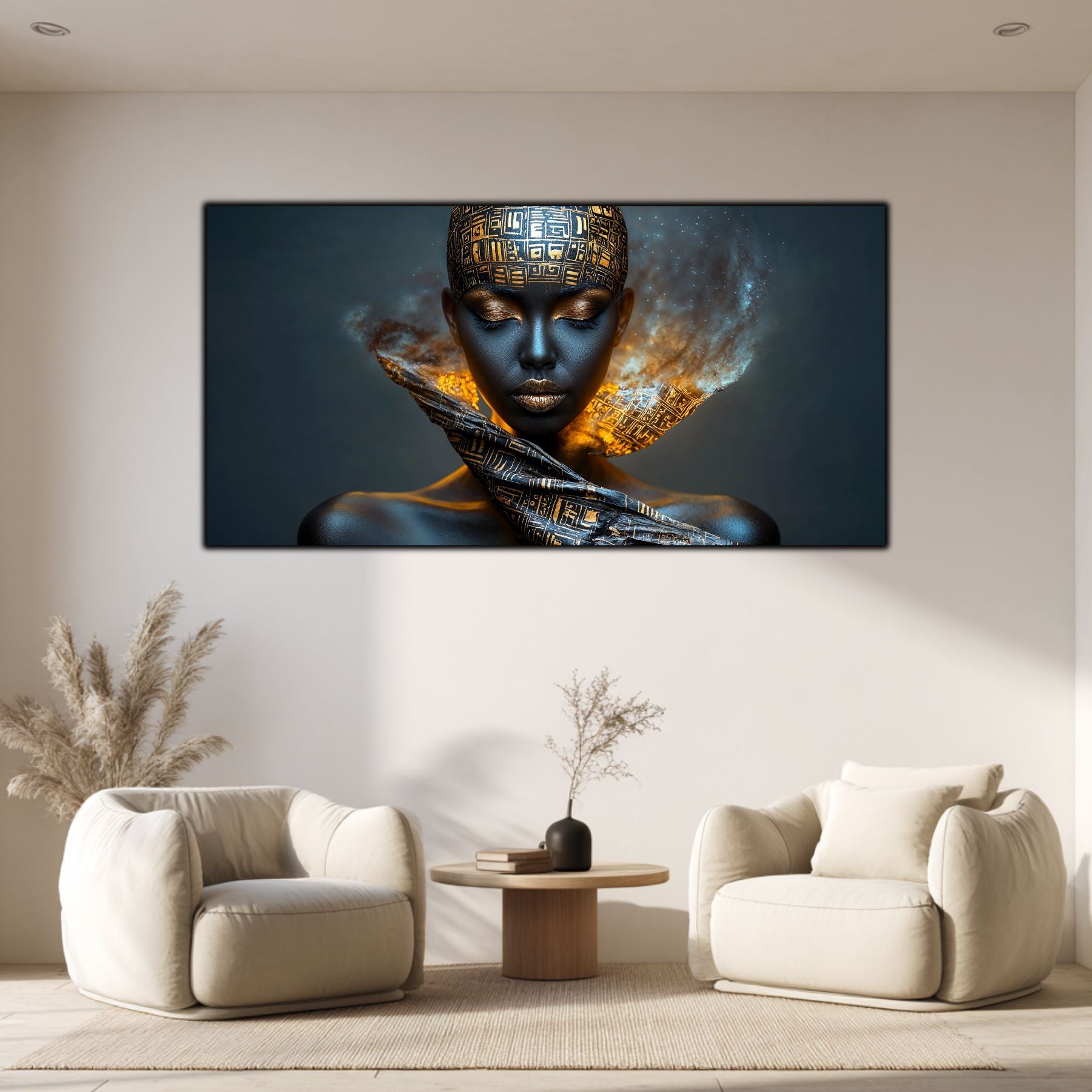 Tablou modern pe sticlă, din colecția „Dark StarDust”. Negru cosmic, accente aurii și mister astral pentru un decor luxury exclusivist.