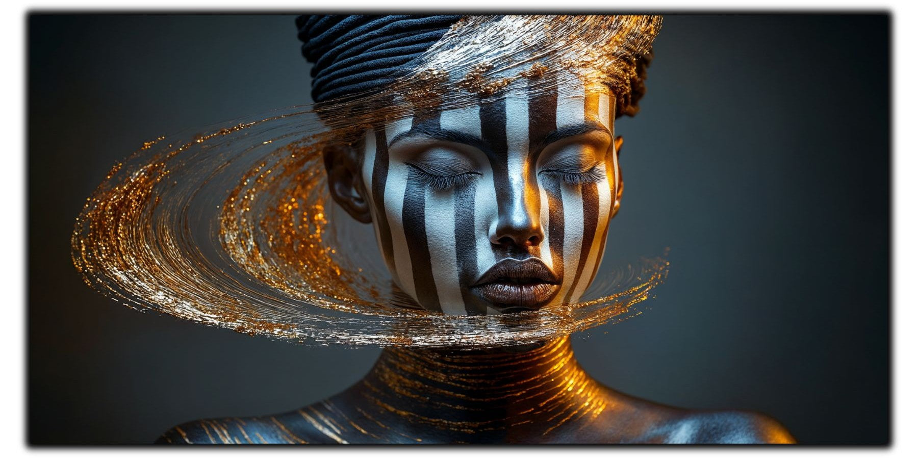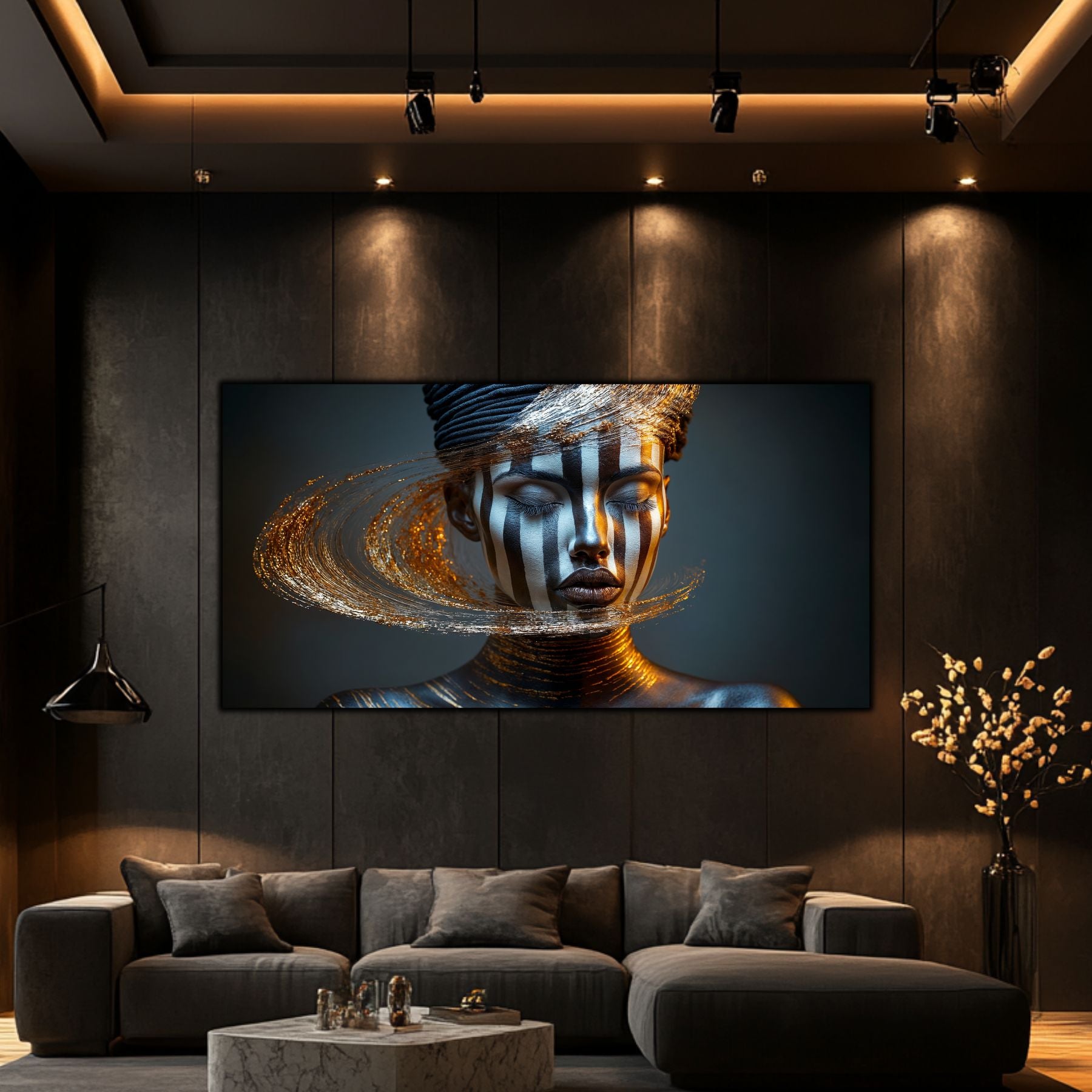 Tablou modern pe sticlă, din colecția „Dark StarDust”. Negru cosmic, accente aurii și mister astral pentru un decor luxury exclusivist.