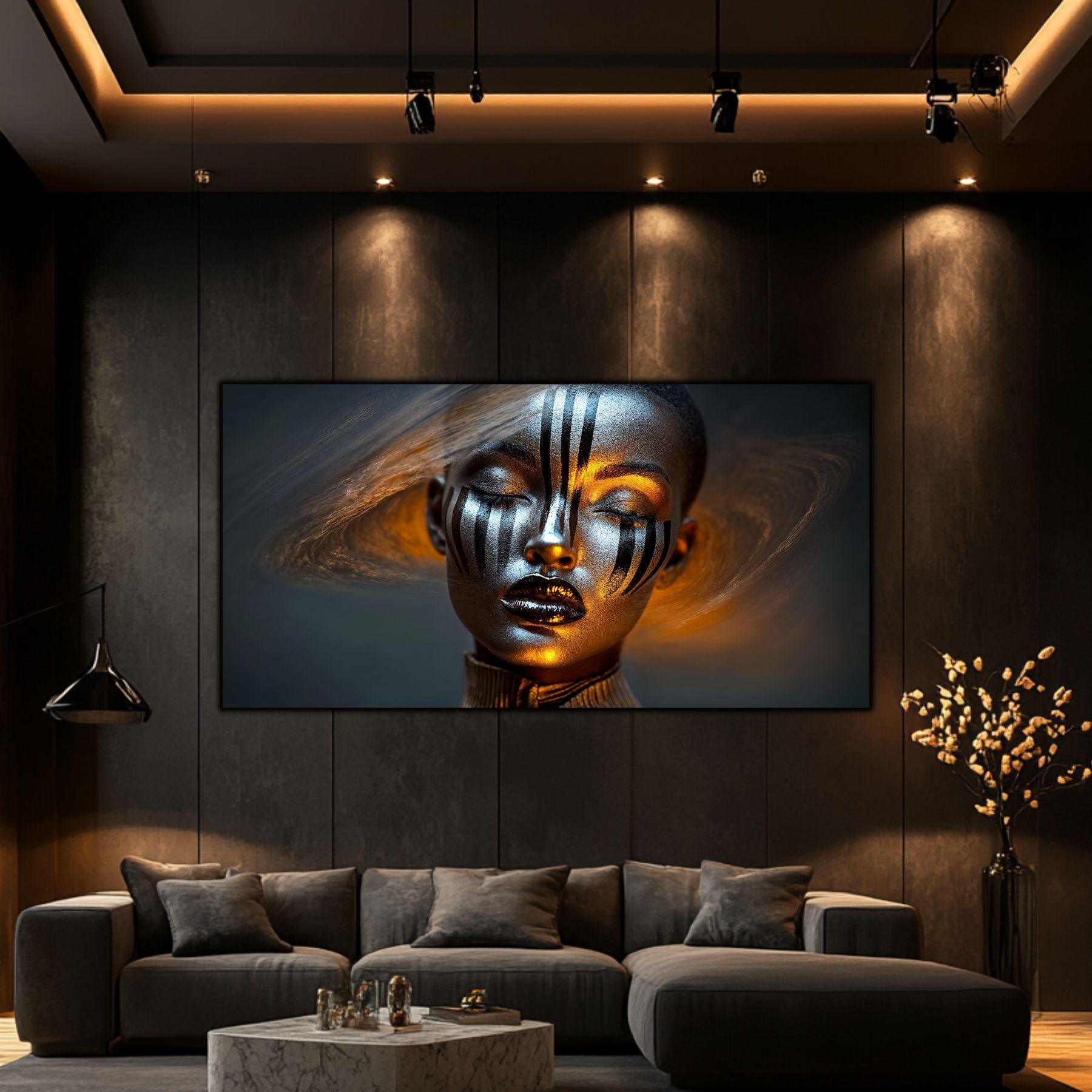 Tablou modern pe sticlă, din colecția „Dark StarDust”. Negru cosmic, accente aurii și mister astral pentru un decor luxury exclusivist.