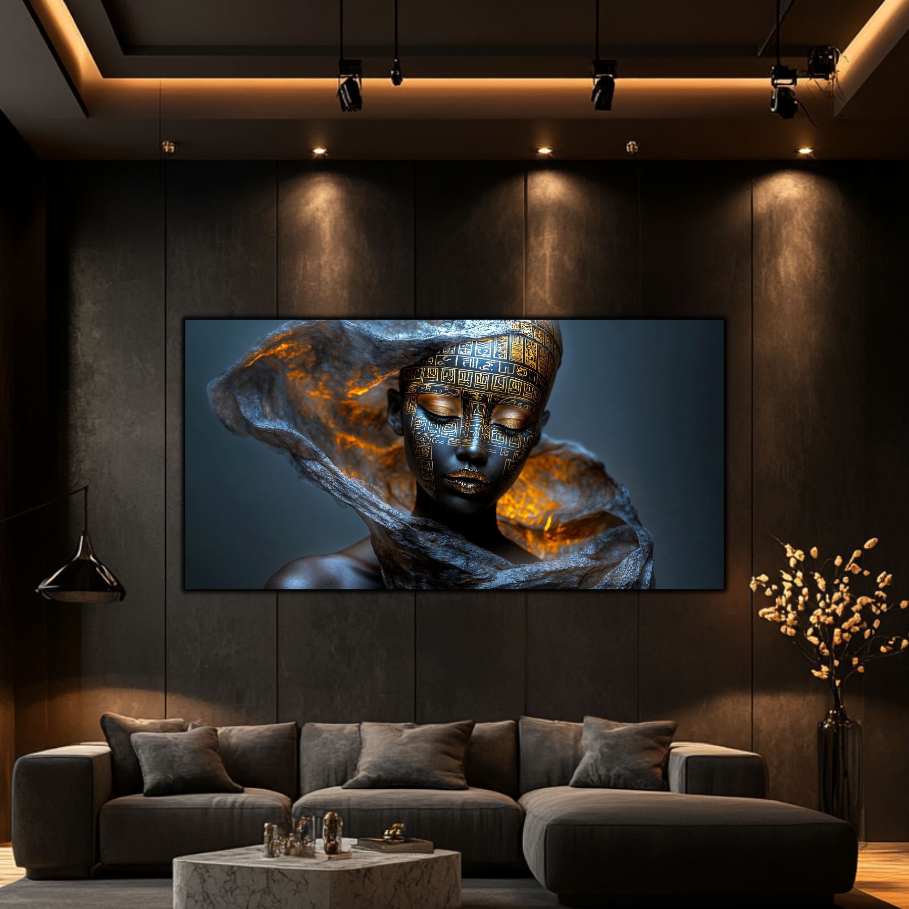 Tablou modern pe sticlă, din colecția „Dark StarDust”. Negru cosmic, accente aurii și mister astral pentru un decor luxury exclusivist.