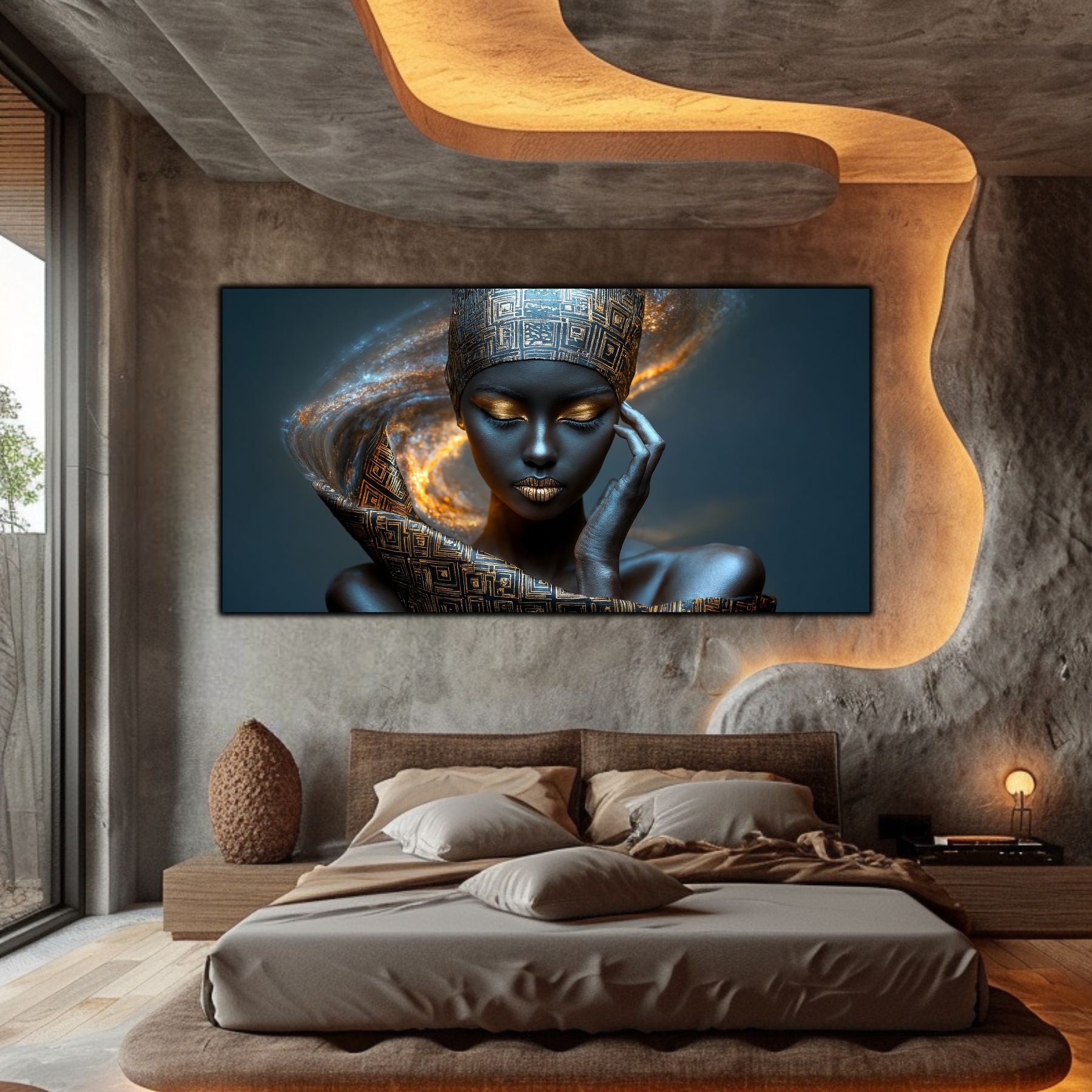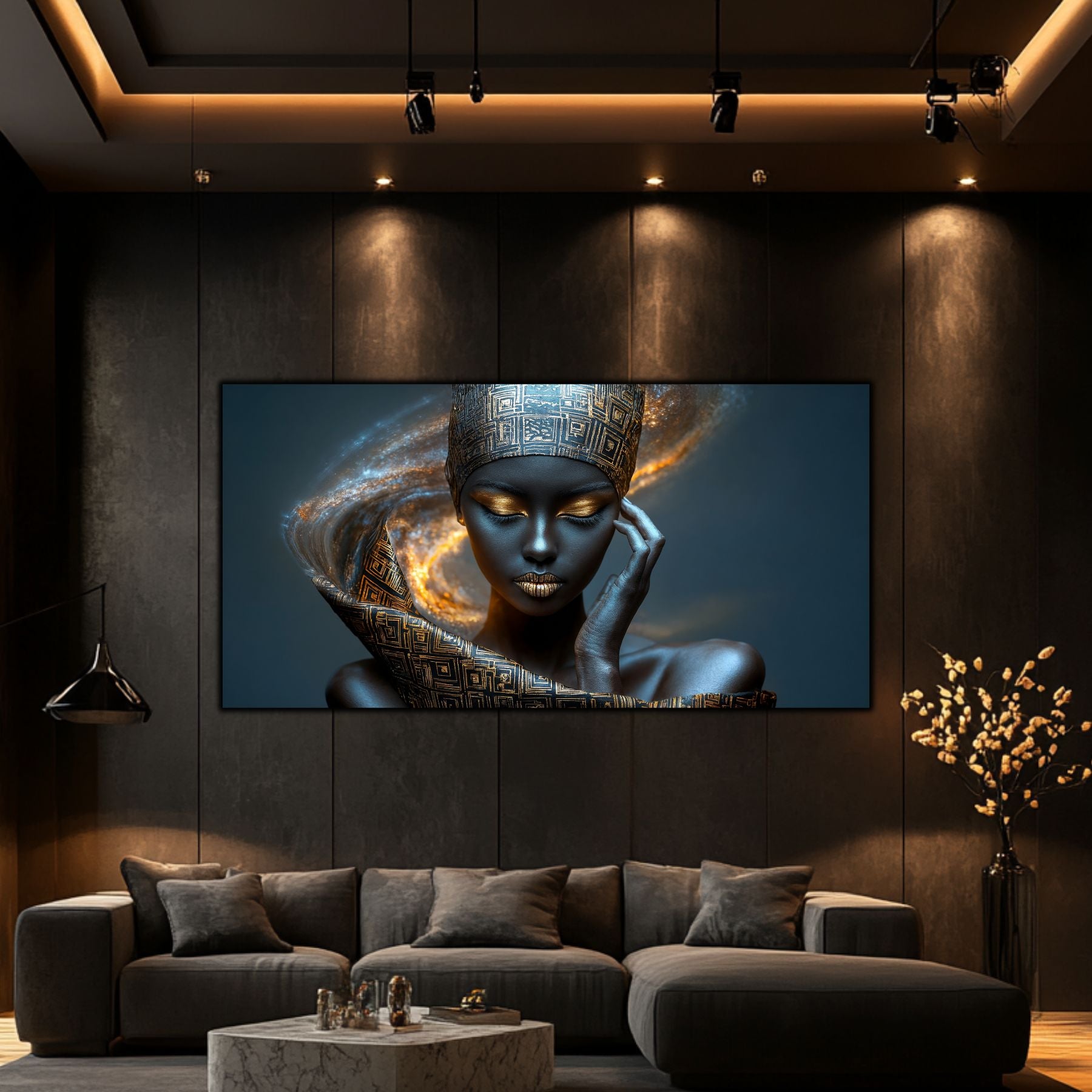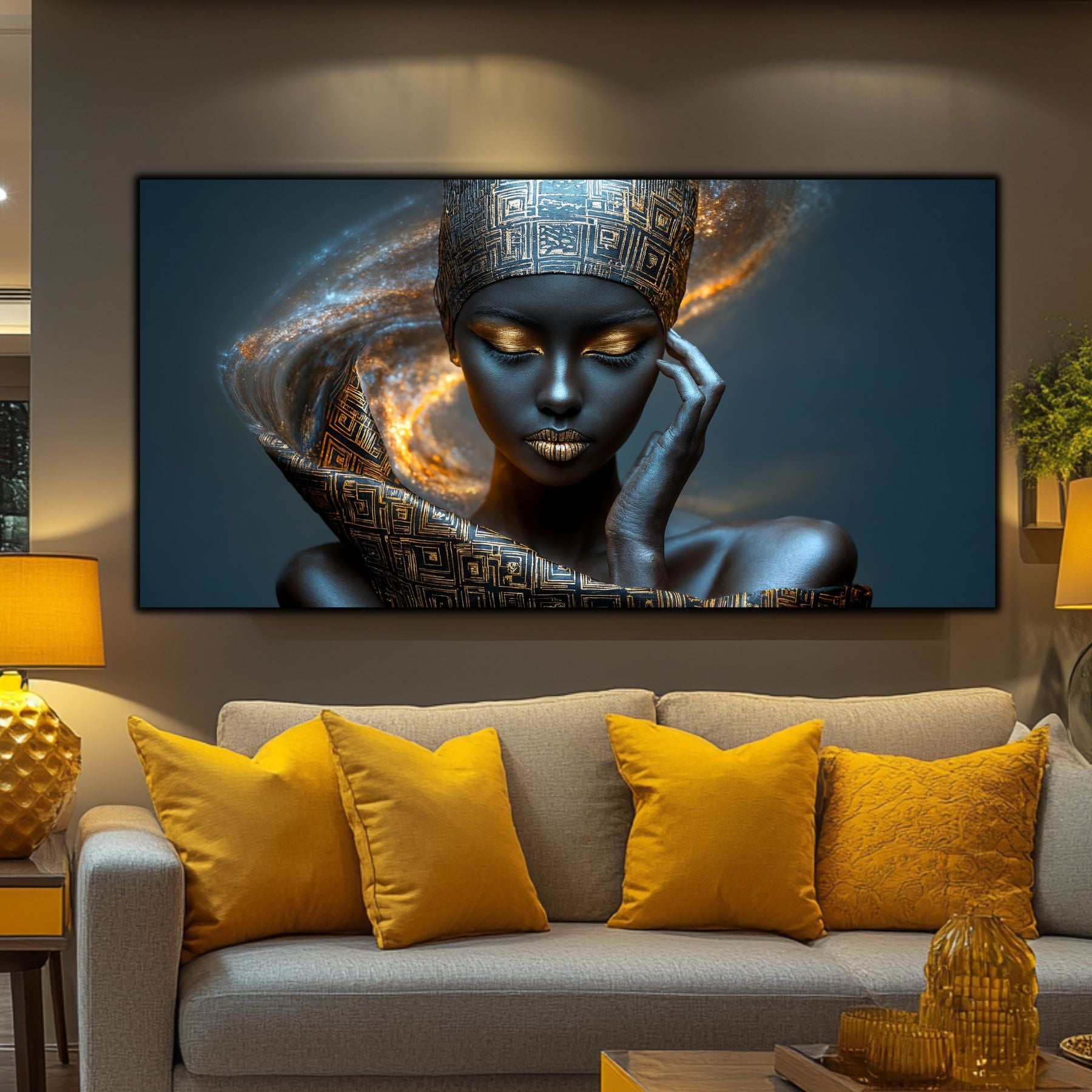 Tablou modern pe sticlă, din colecția „Dark StarDust”. Negru cosmic, accente aurii și mister astral pentru un decor luxury exclusivist.