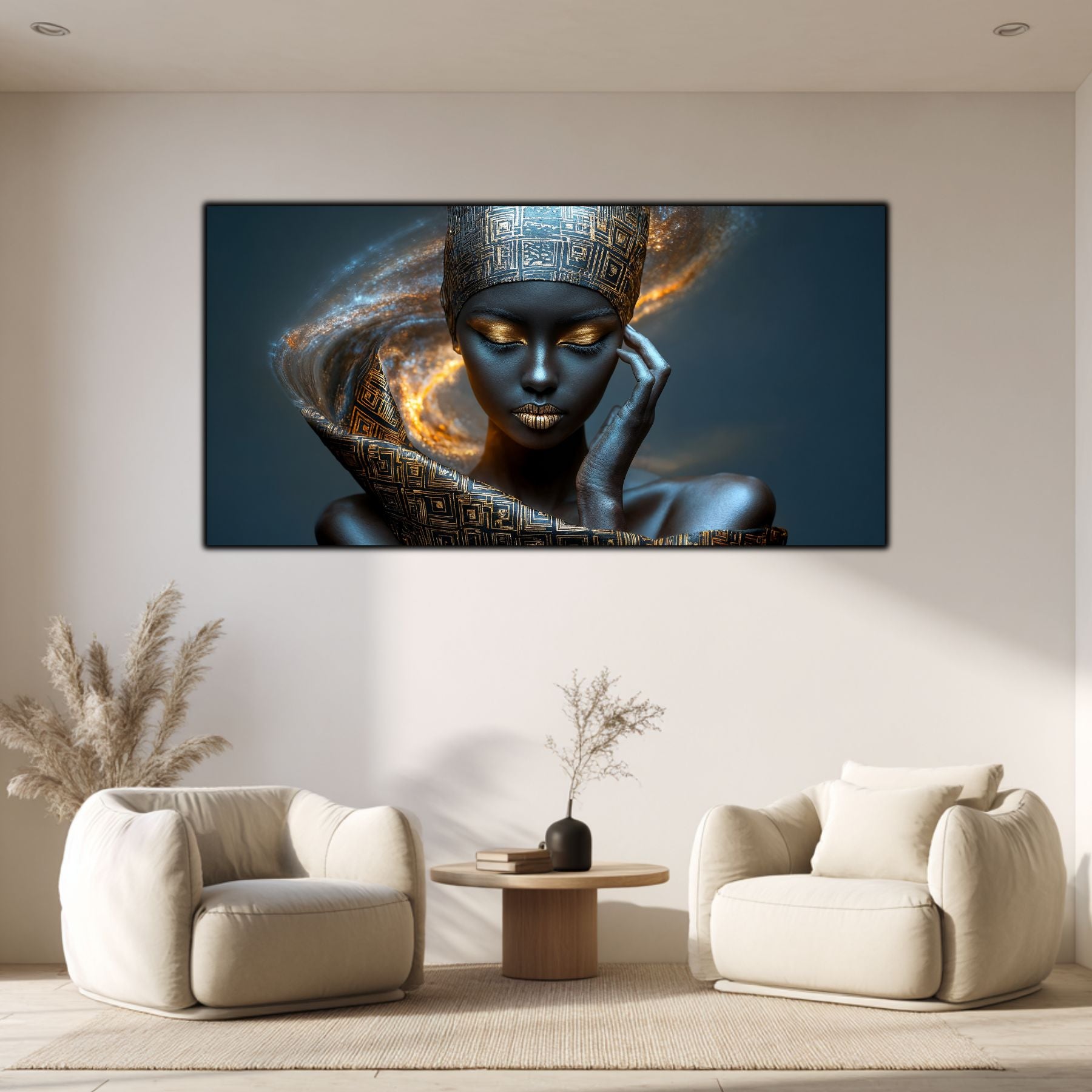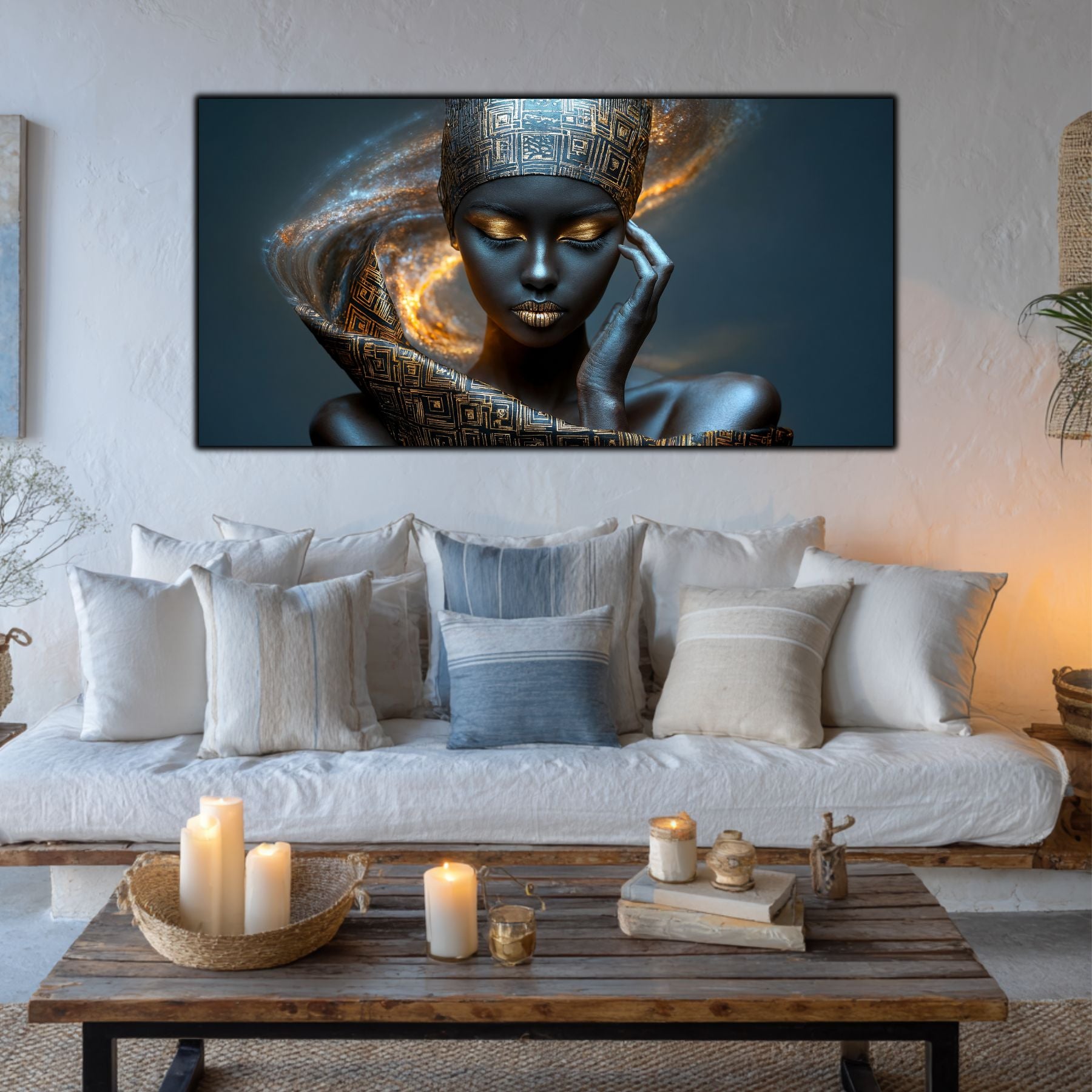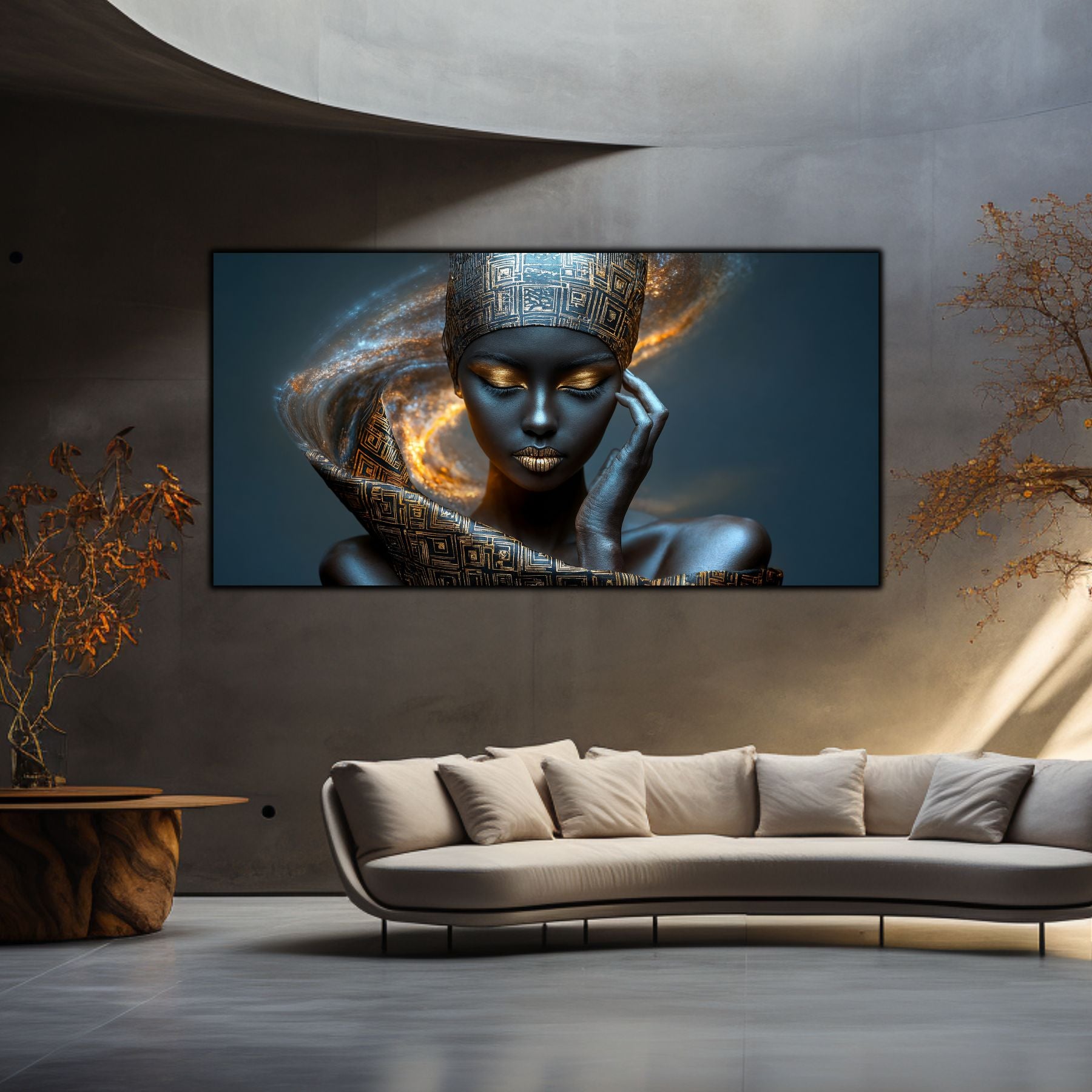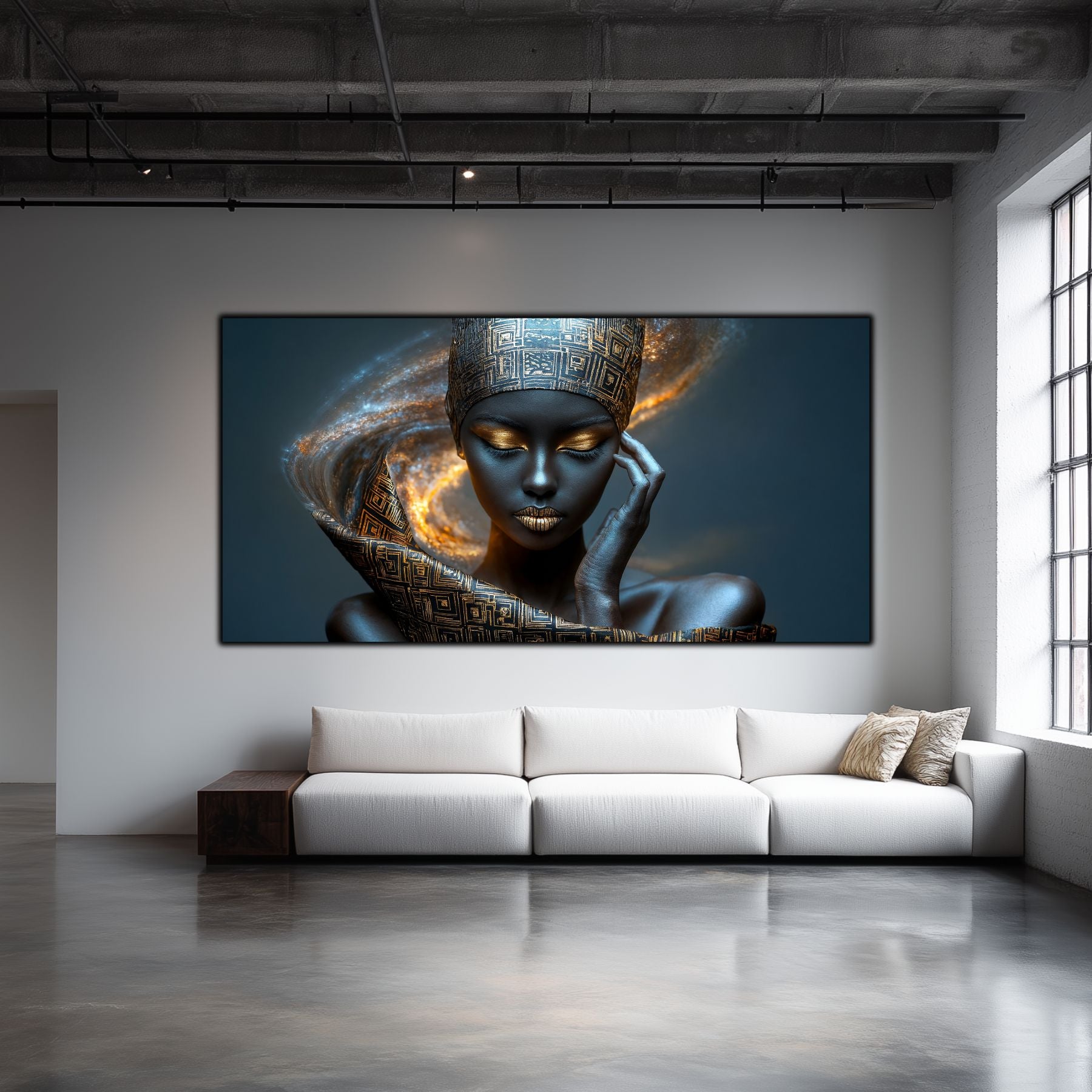 Tablou modern pe sticlă, din colecția „Dark StarDust”. Negru cosmic, accente aurii și mister astral pentru un decor luxury exclusivist.