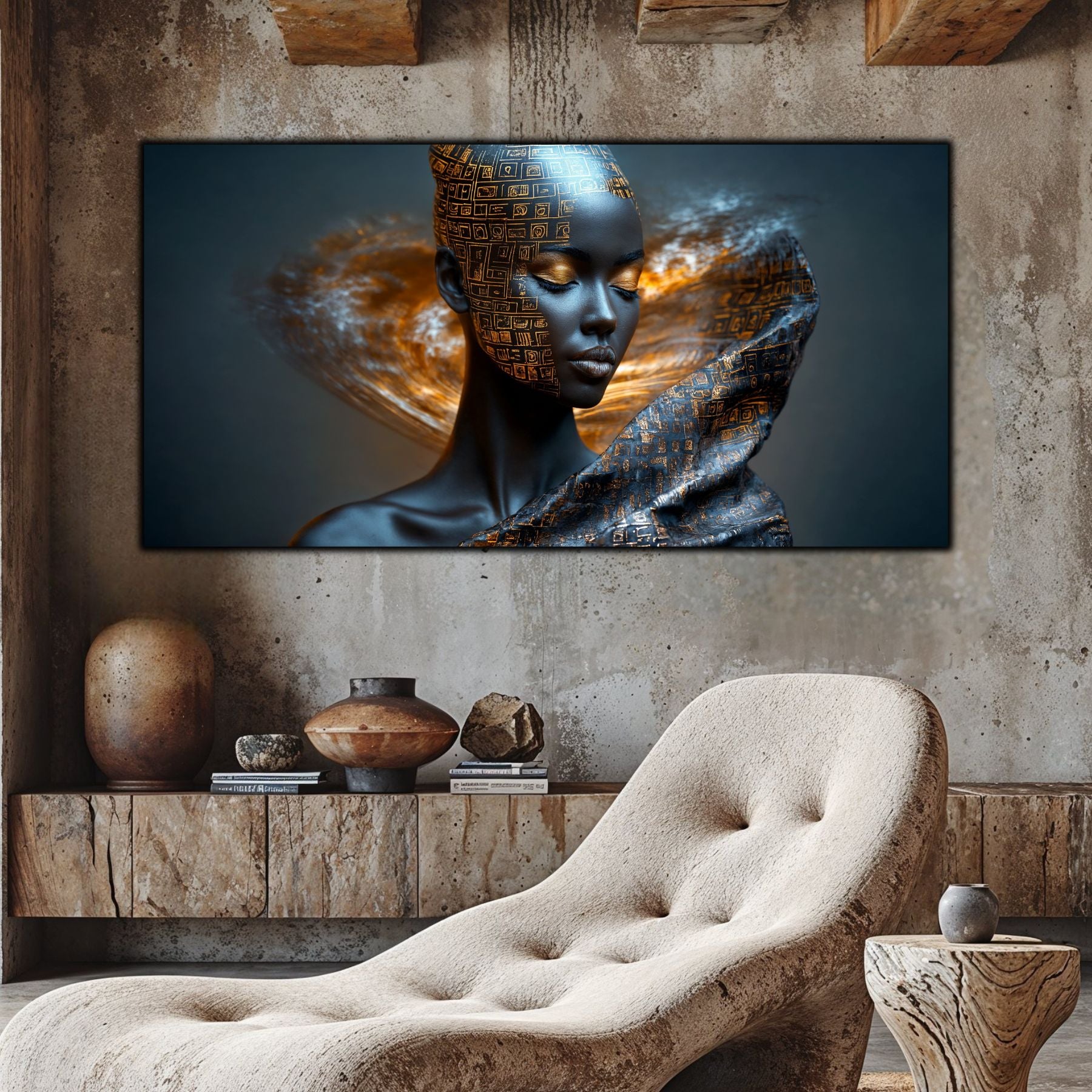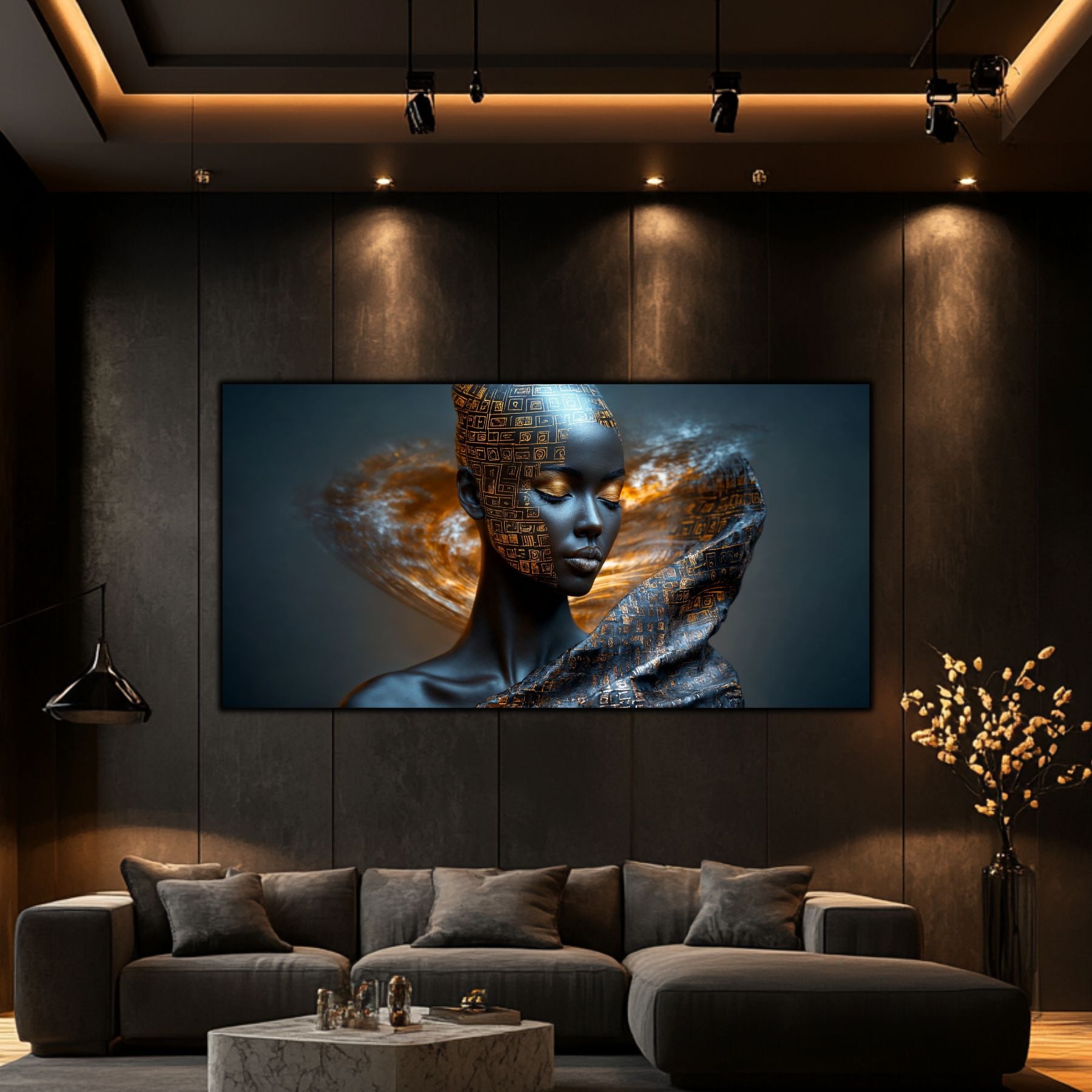 Tablou modern pe sticlă, din colecția „Dark StarDust”. Negru cosmic, accente aurii și mister astral pentru un decor luxury exclusivist.