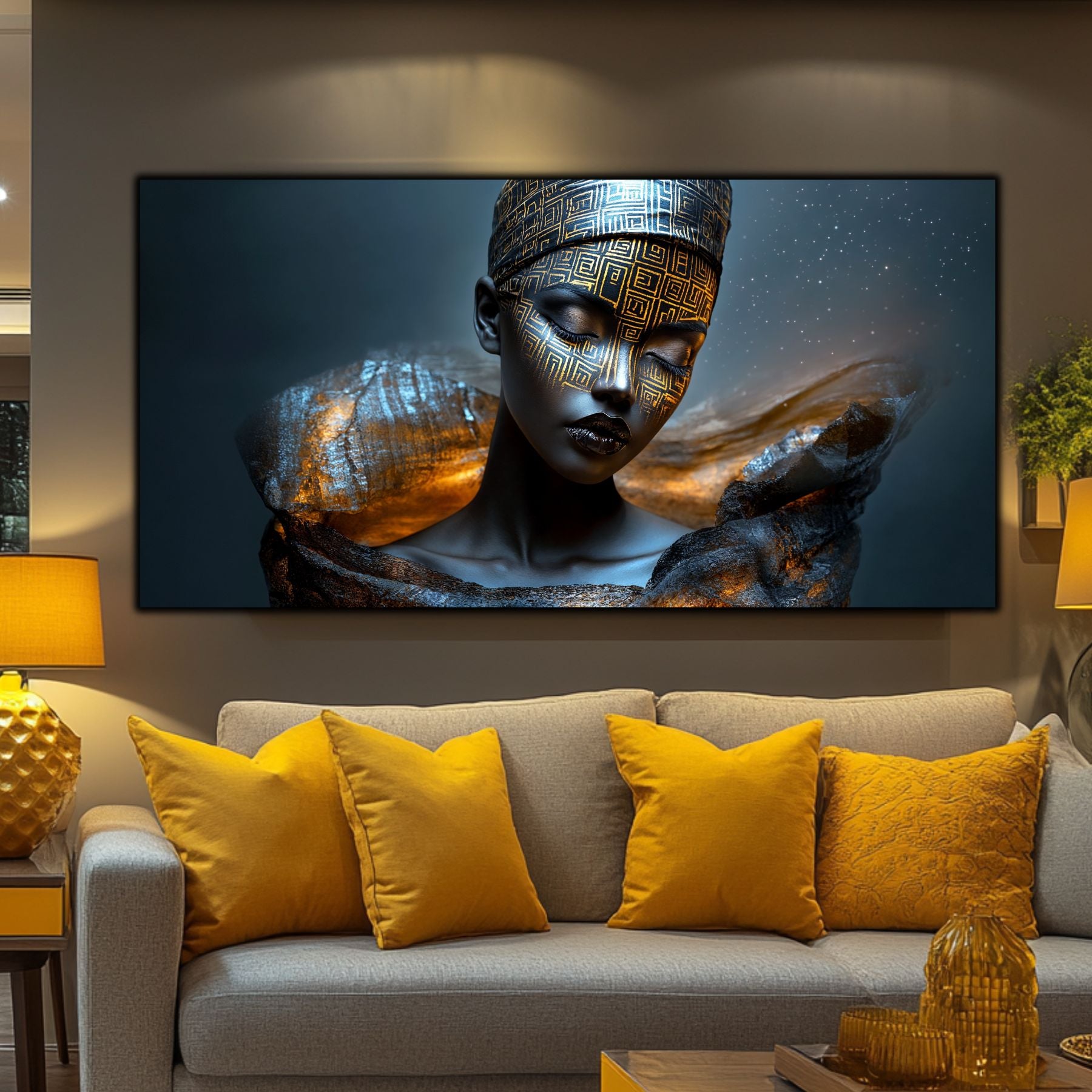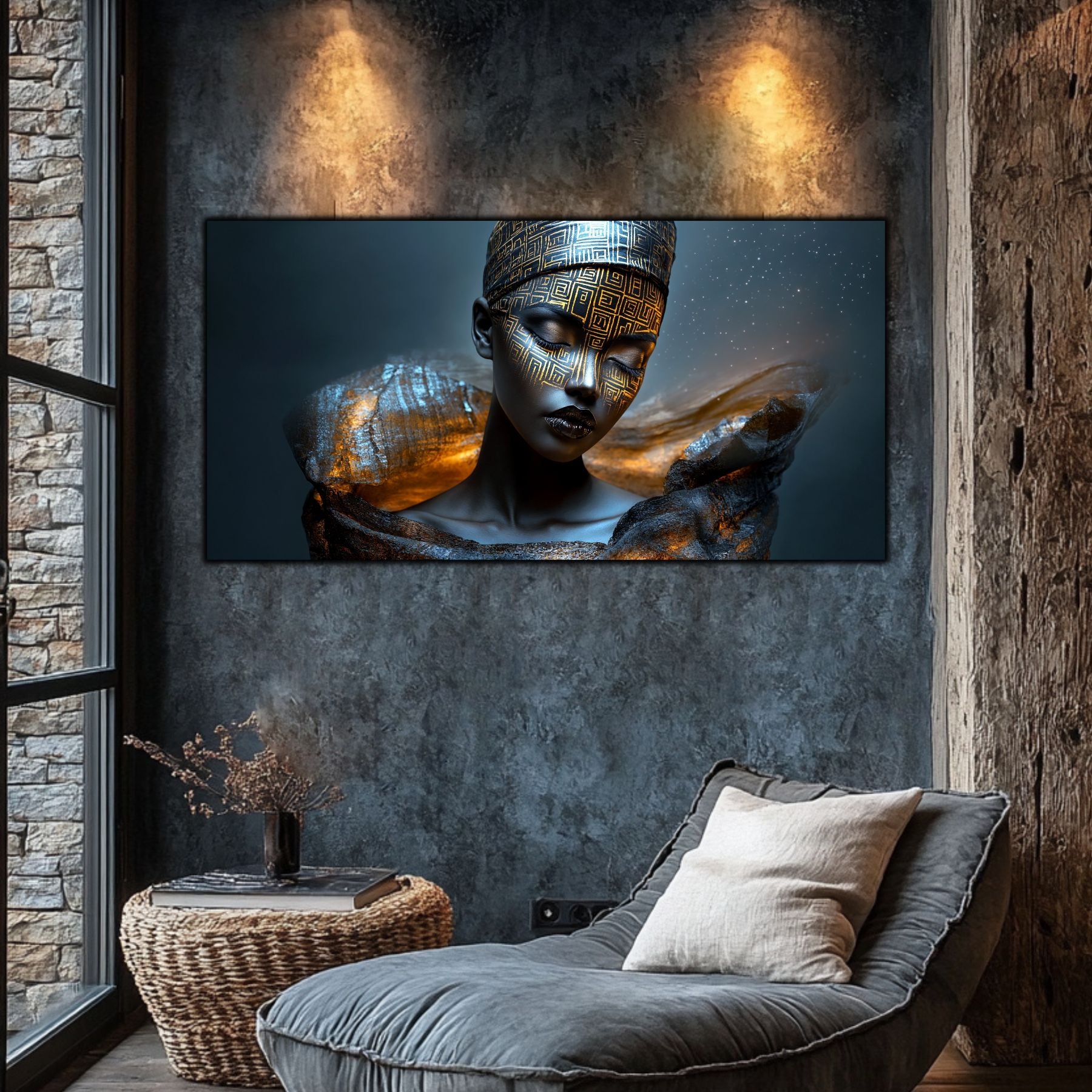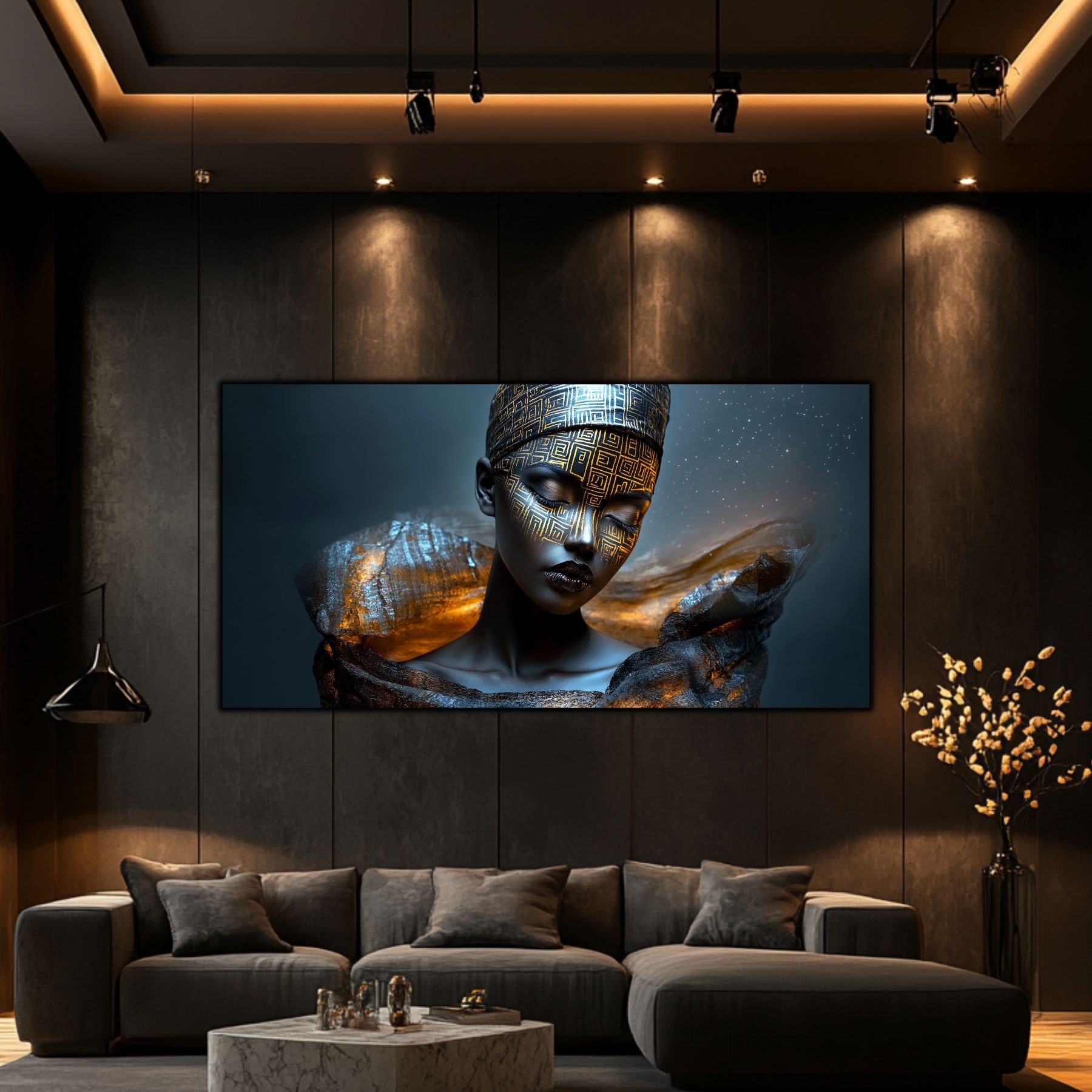 Tablou modern pe sticlă, din colecția „Dark StarDust”. Negru cosmic, accente aurii și mister astral pentru un decor luxury exclusivist.
