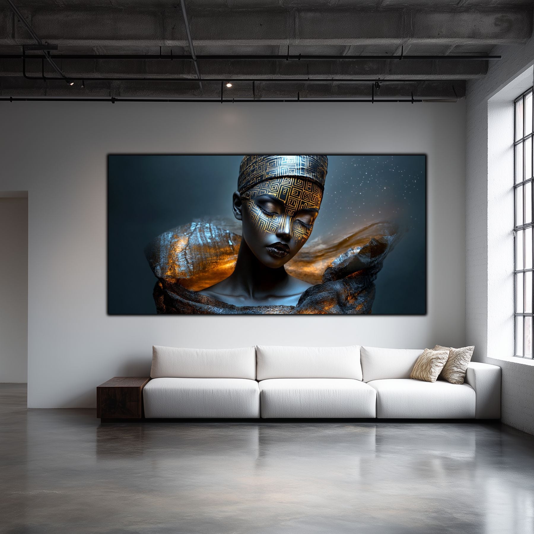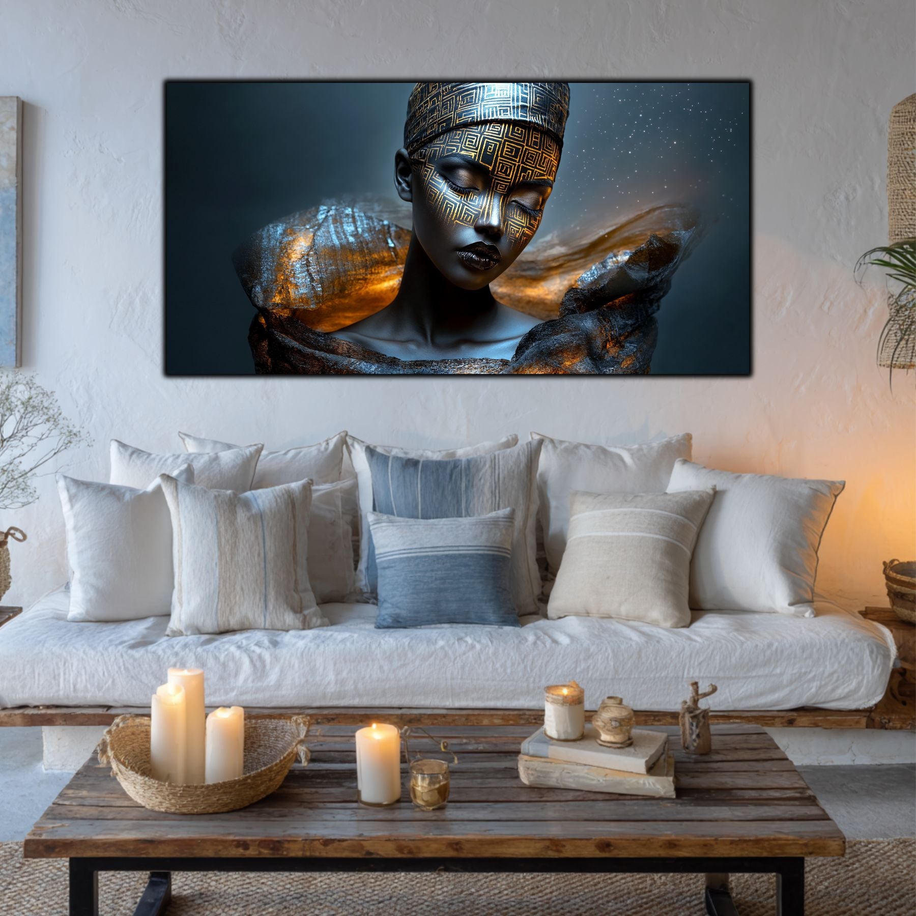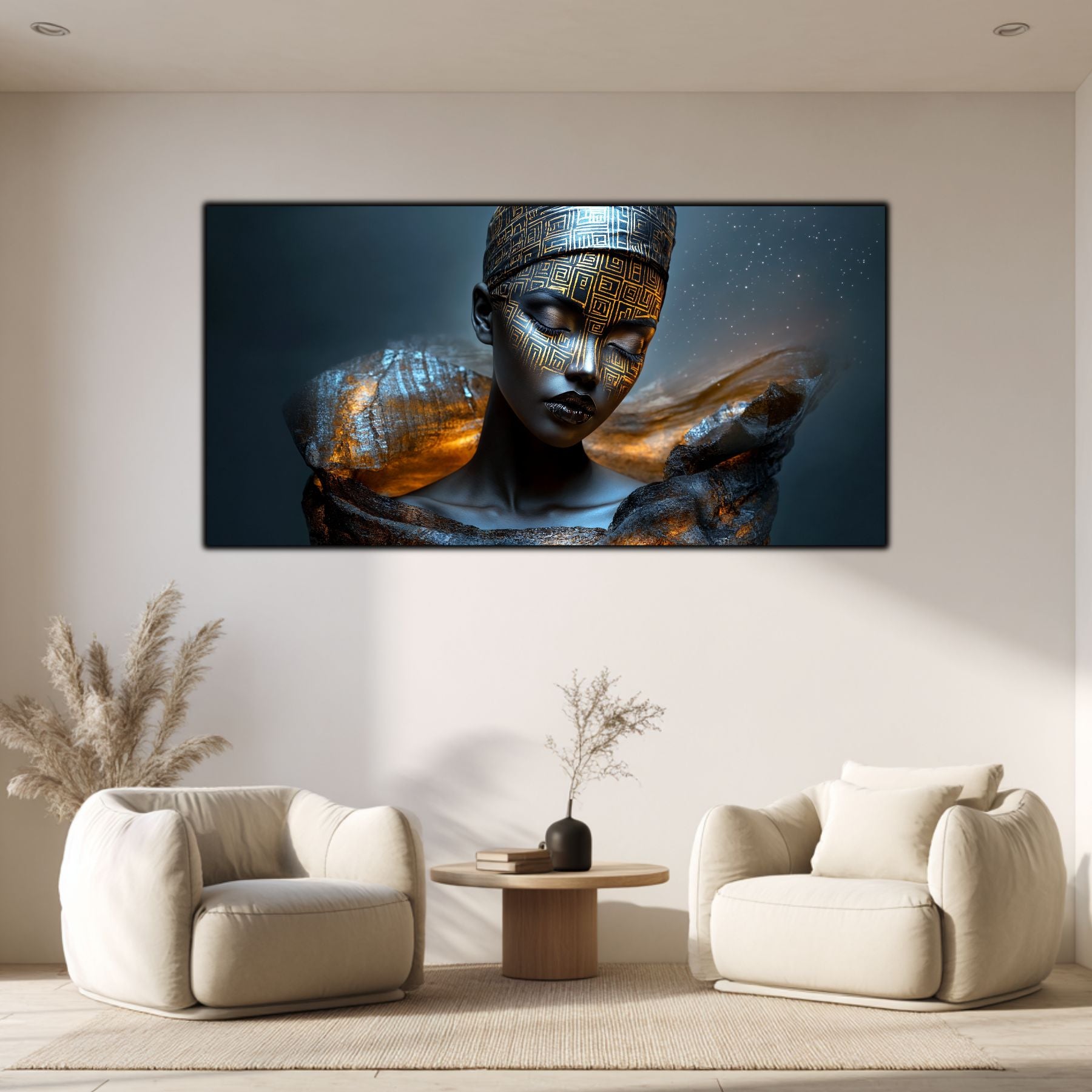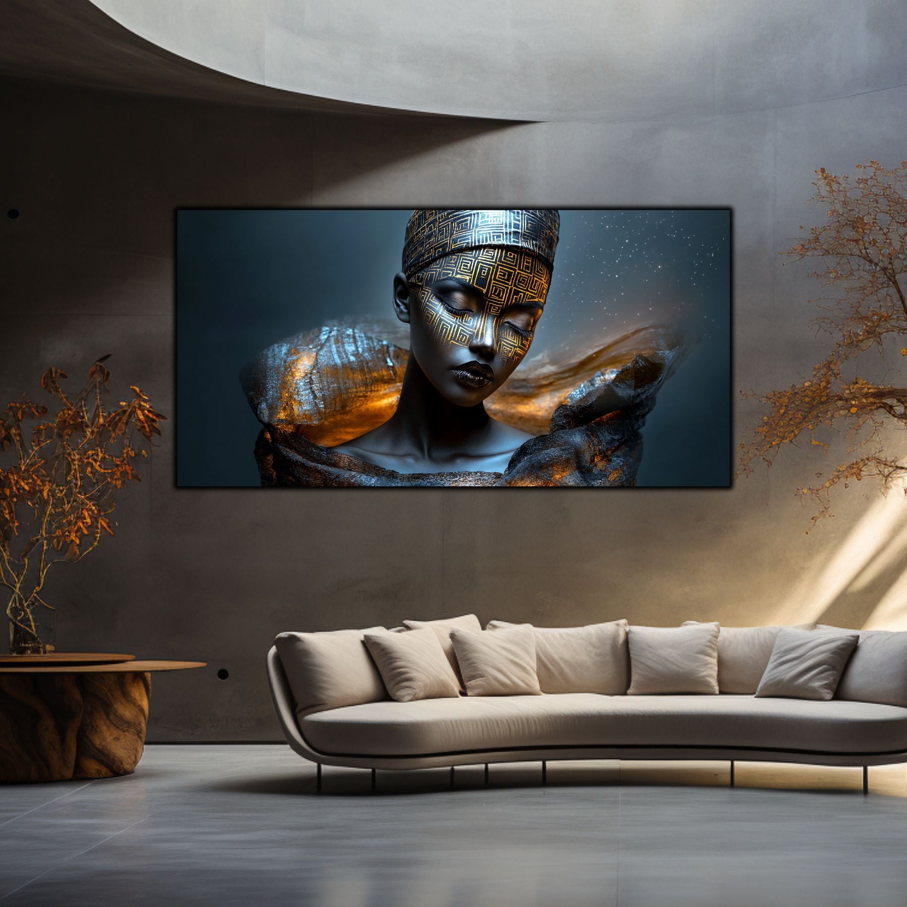 Tablou modern pe sticlă, din colecția „Dark StarDust”. Negru cosmic, accente aurii și mister astral pentru un decor luxury exclusivist.