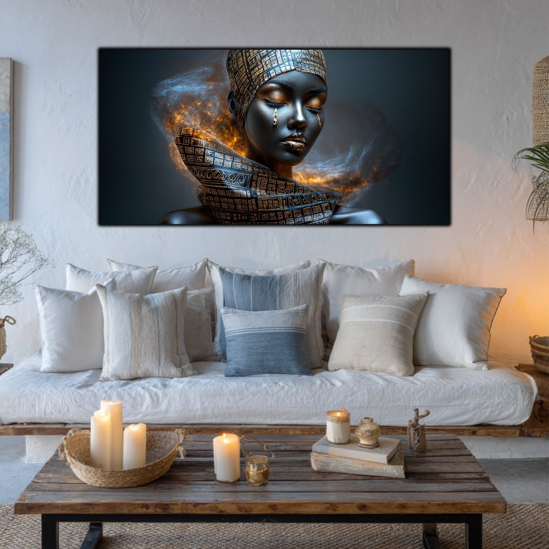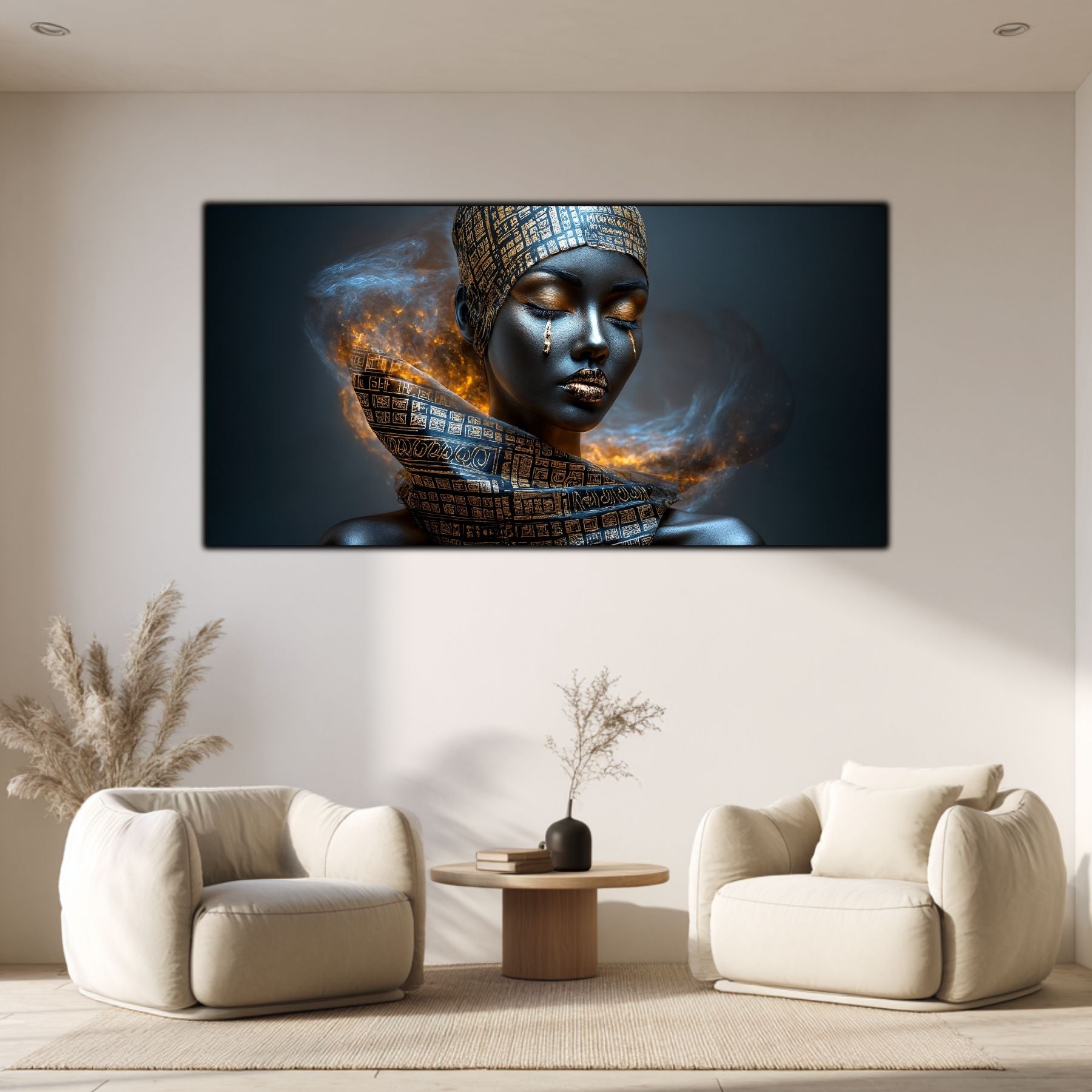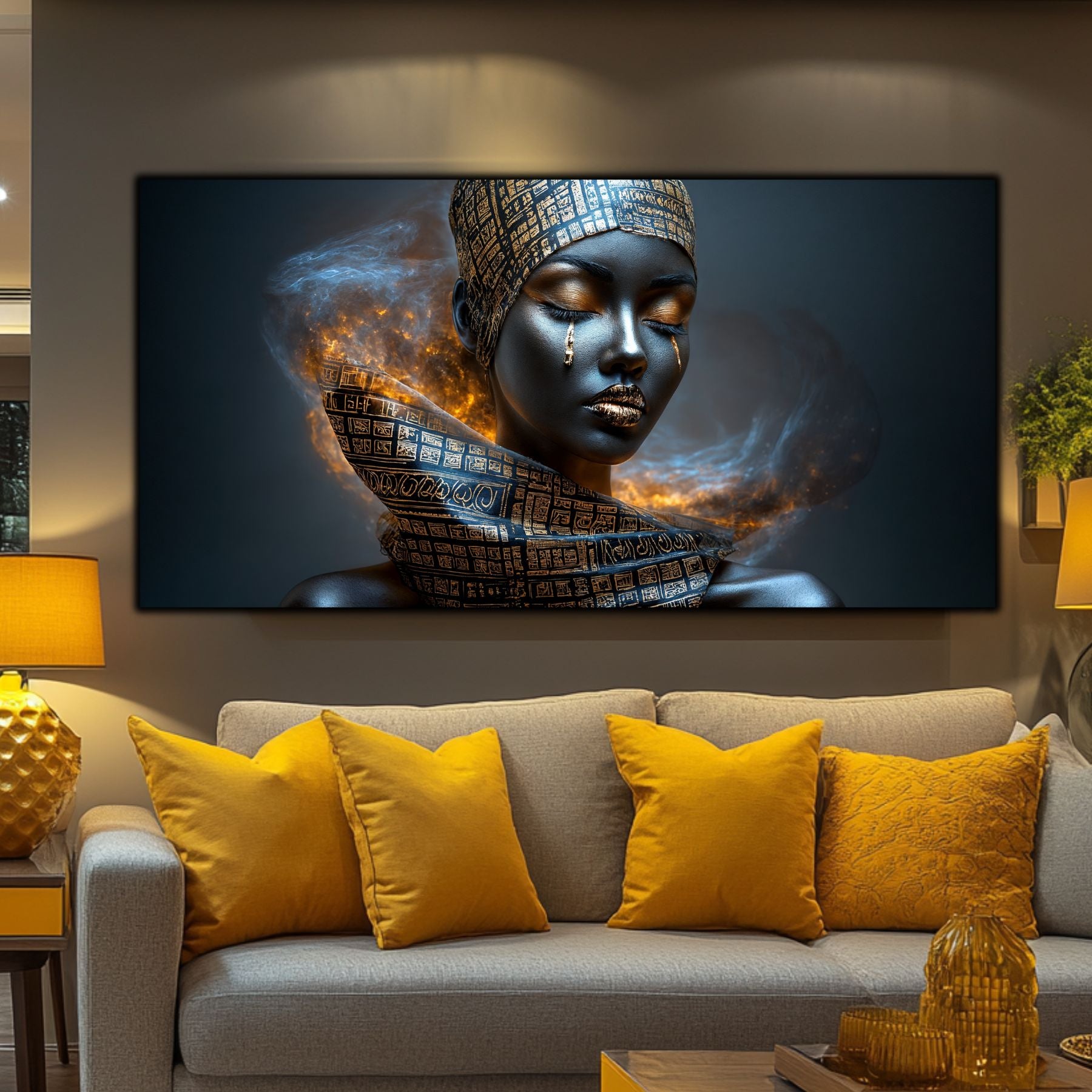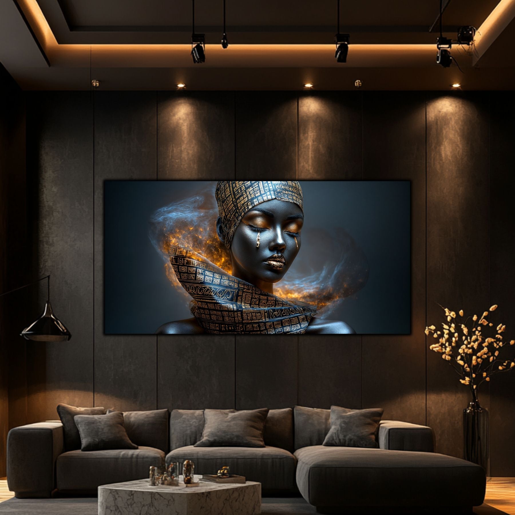 Tablou modern pe sticlă, din colecția „Dark StarDust”. Negru cosmic, accente aurii și mister astral pentru un decor luxury exclusivist.