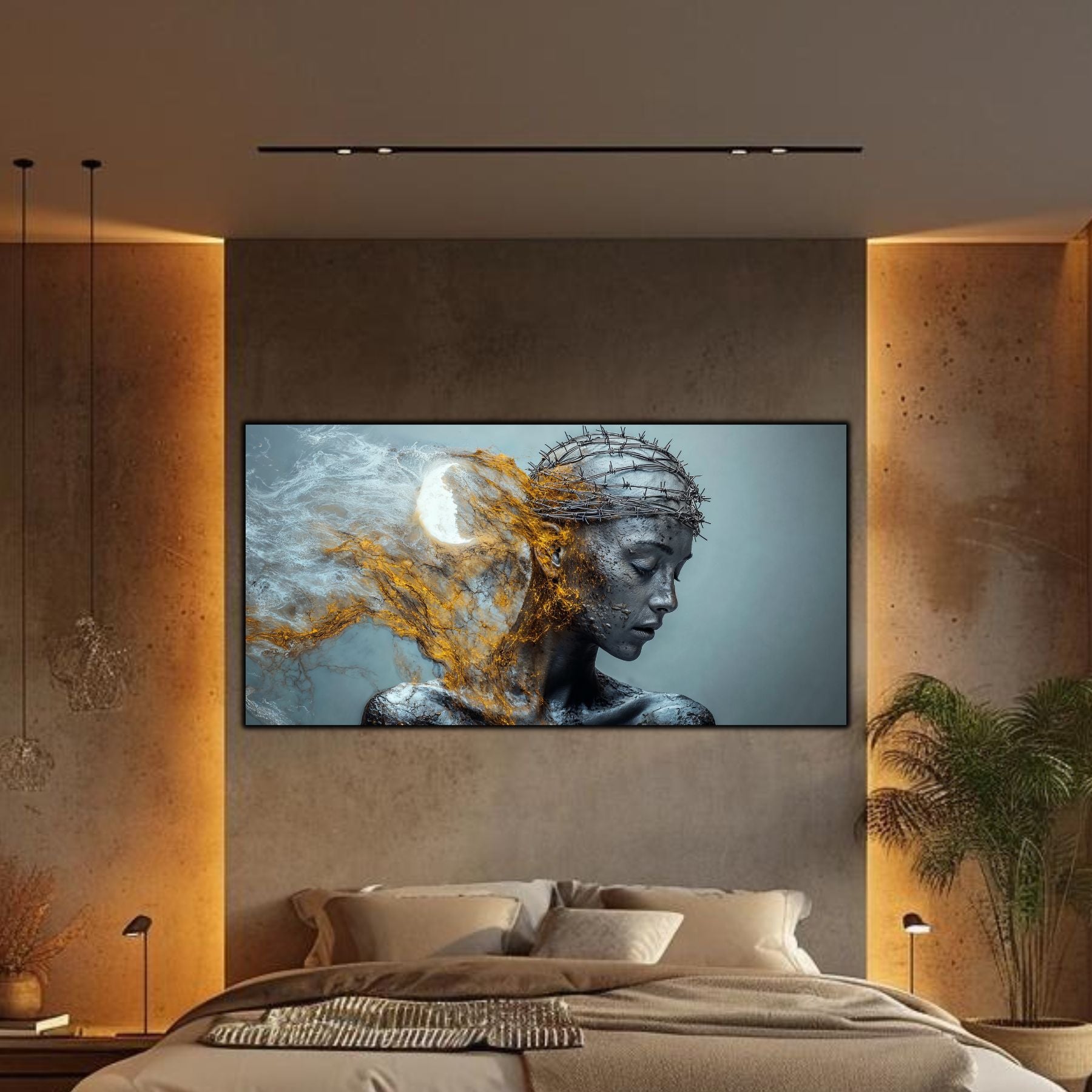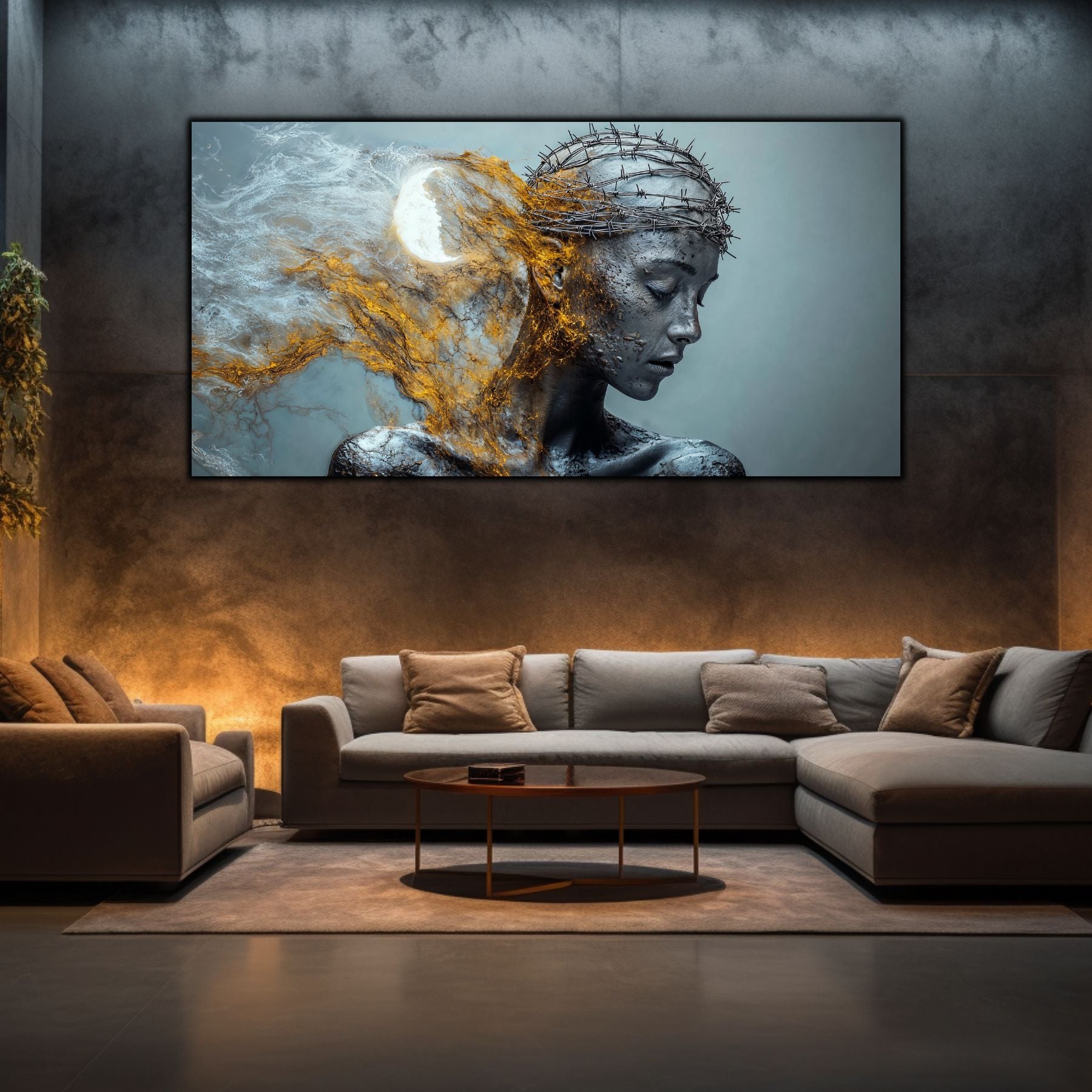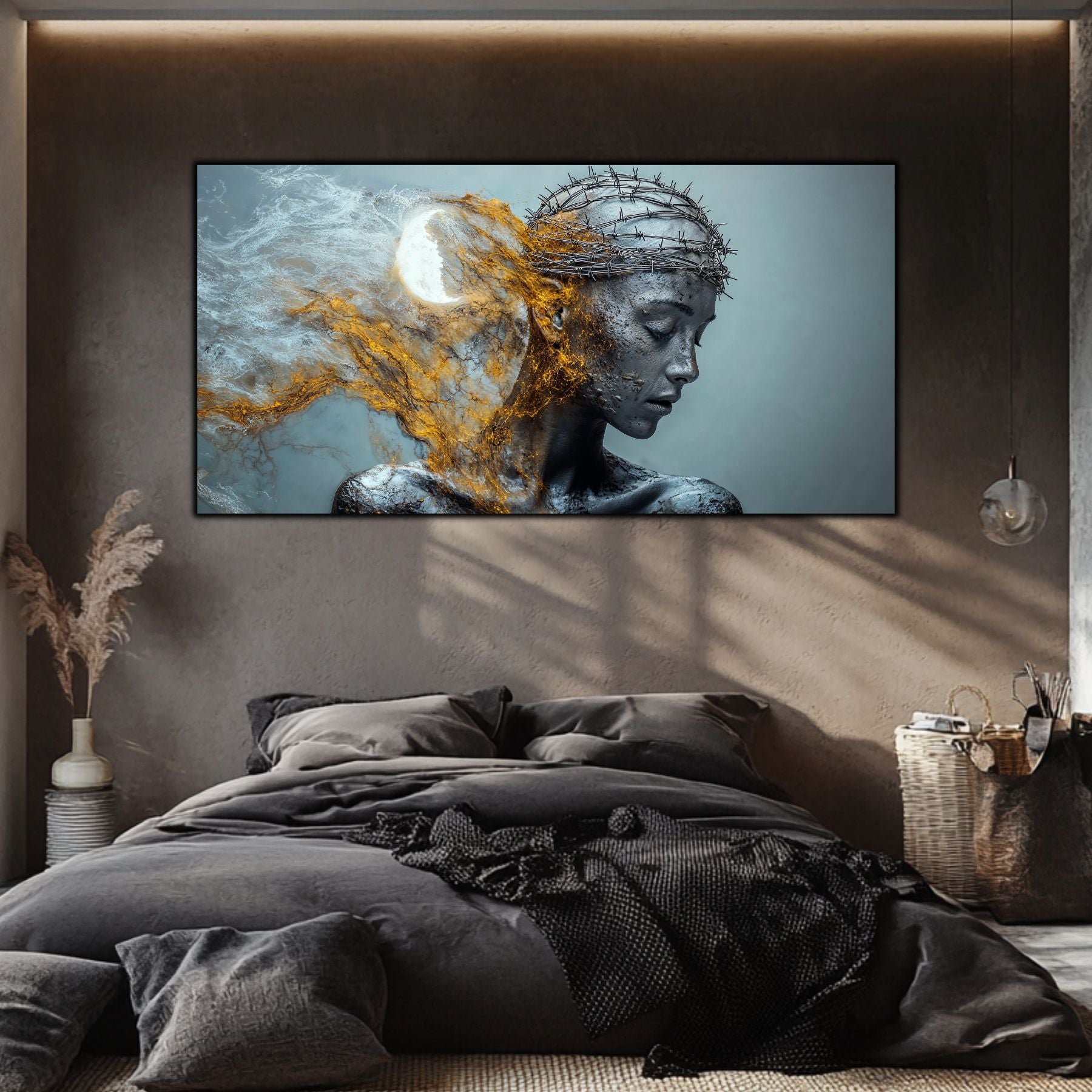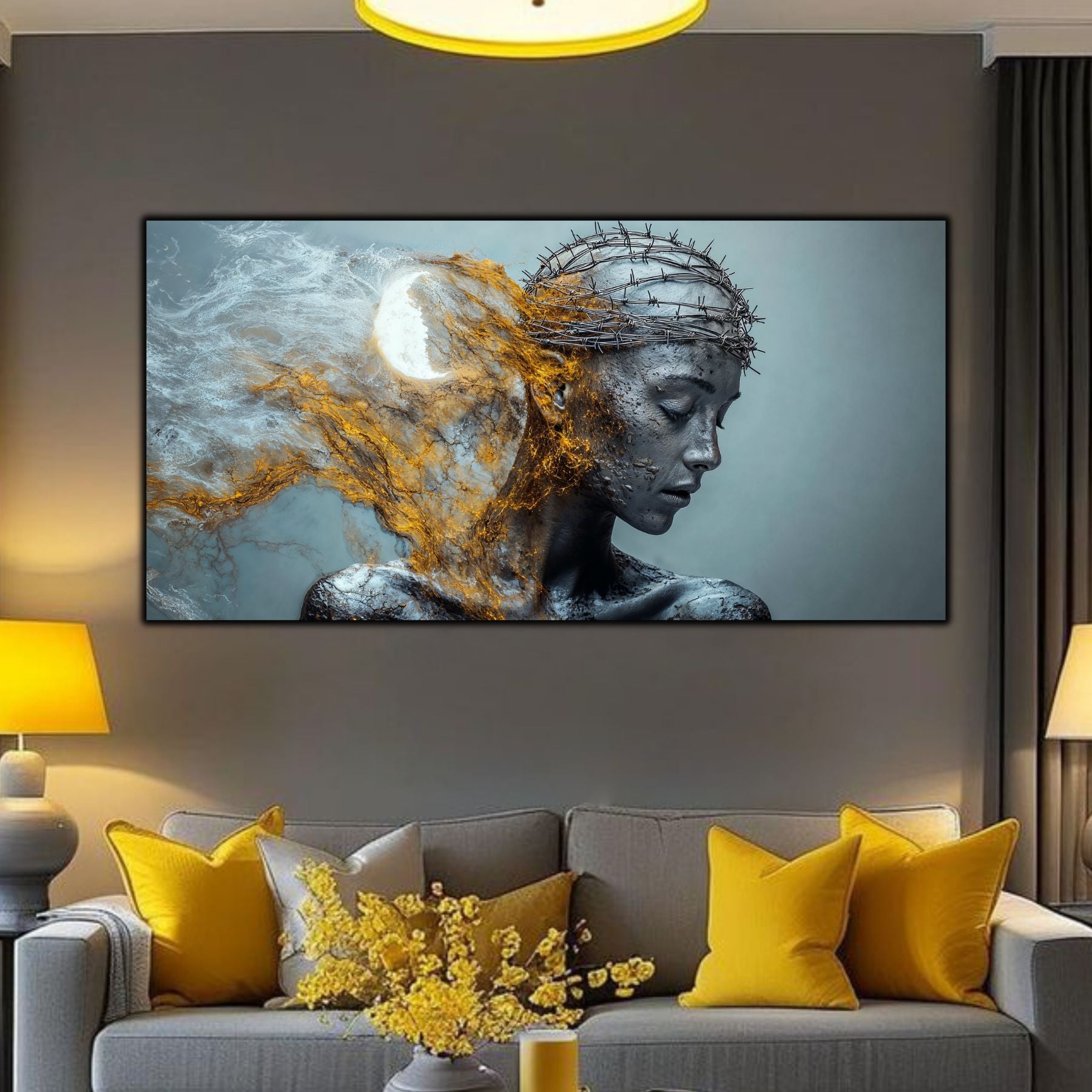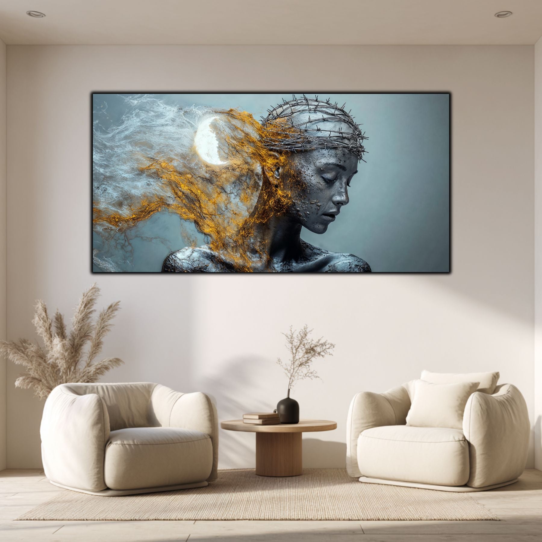 Imaginile prezentate sunt randari digitale realizate pentru a evidentia frumusetea tablourilor. Ele nu respecta proportiile reale in raport cu spatiul, fiind doar o interpretare artistica a modului in care acestea ar putea fi integrate intr-un decor. Va invit sa le „probati” mental pe peretii casei voastre si sa descoperiti cum isi gasesc locul in realitate.