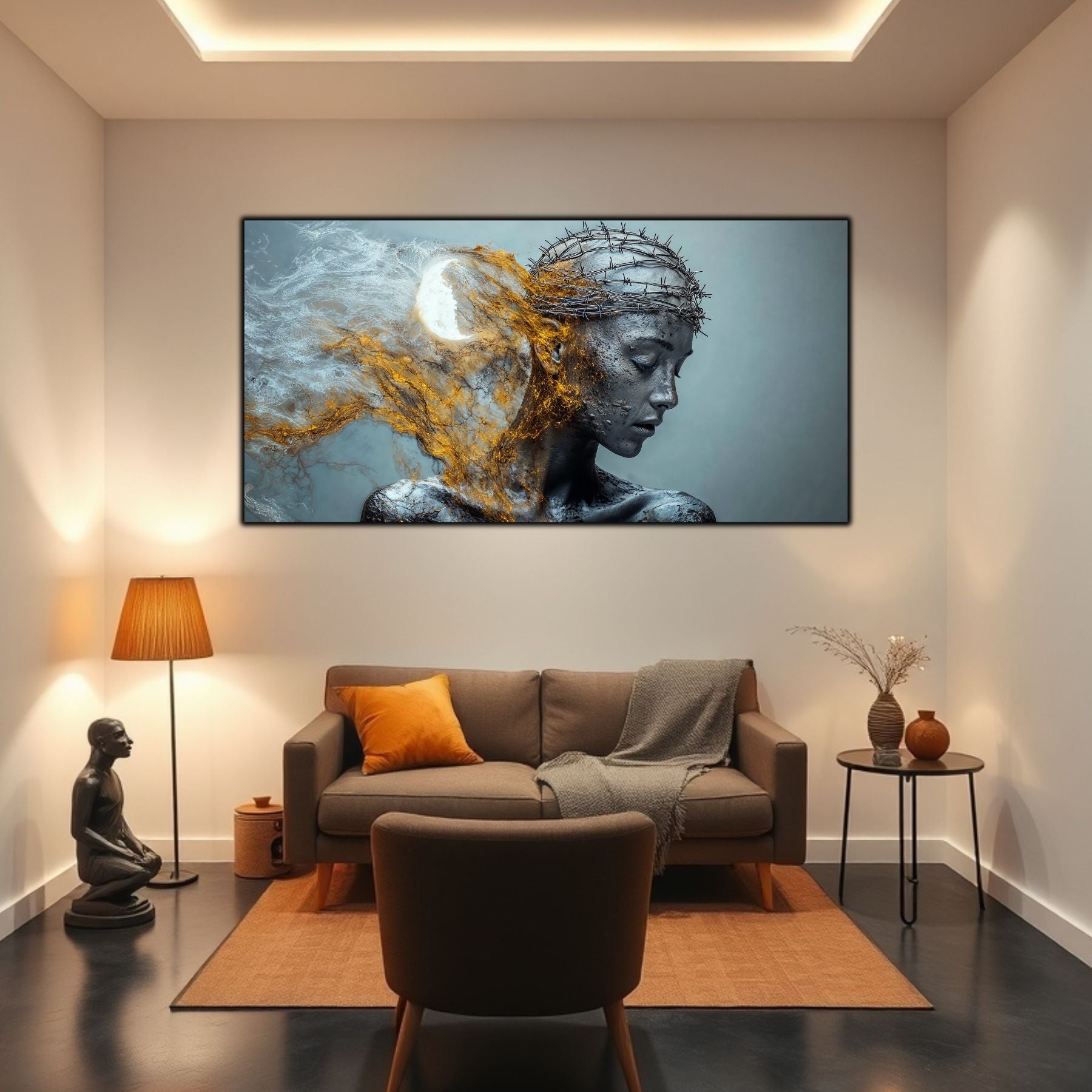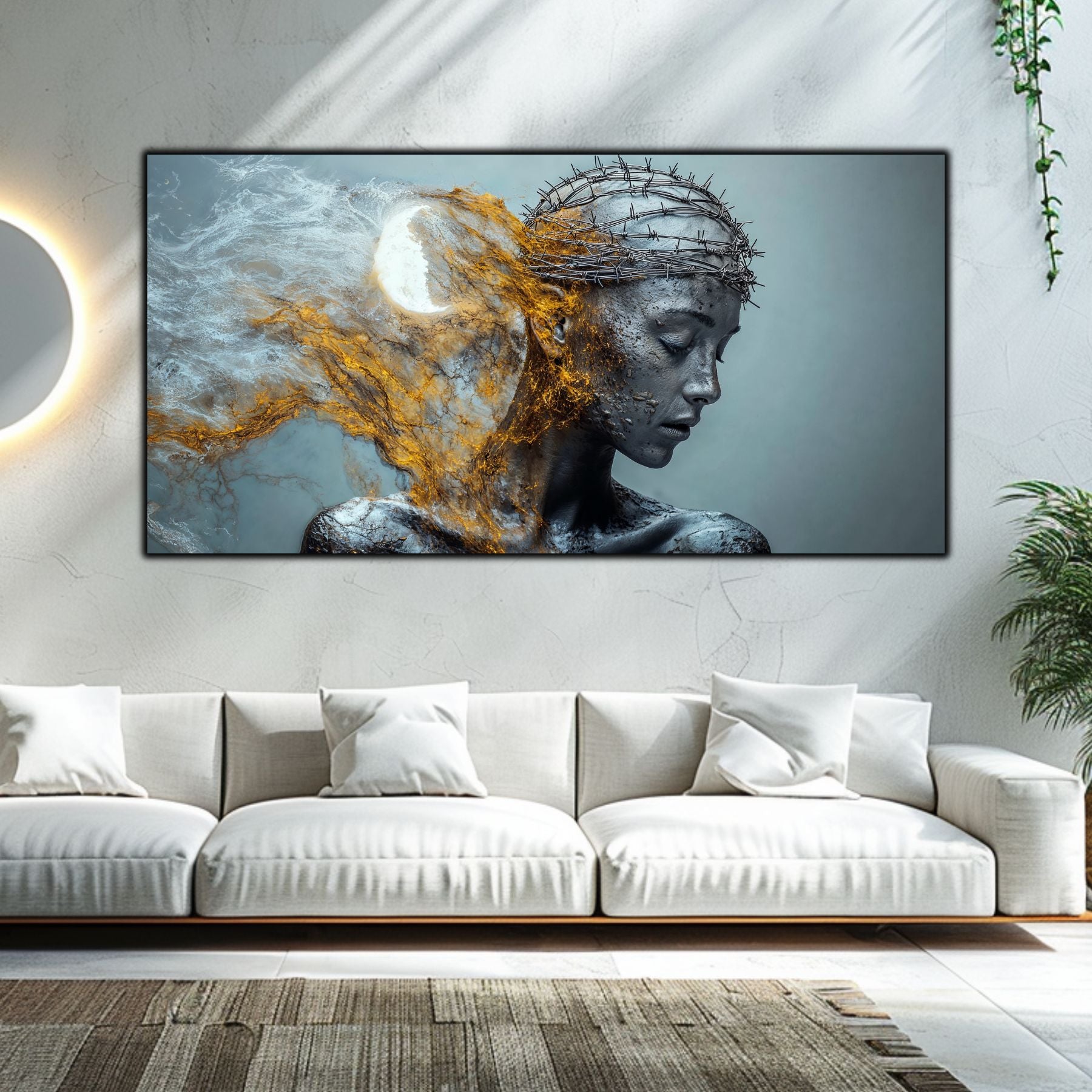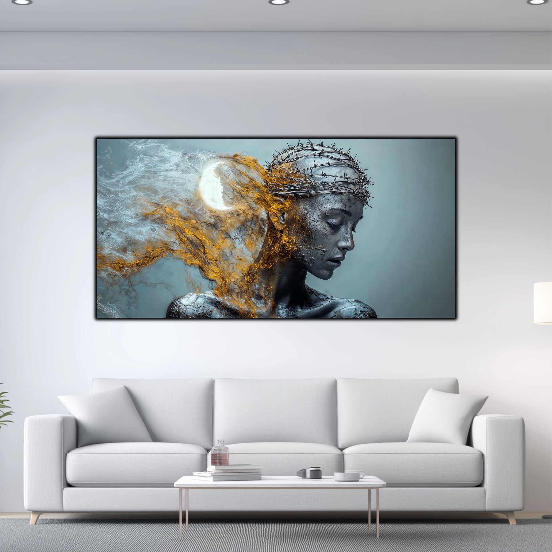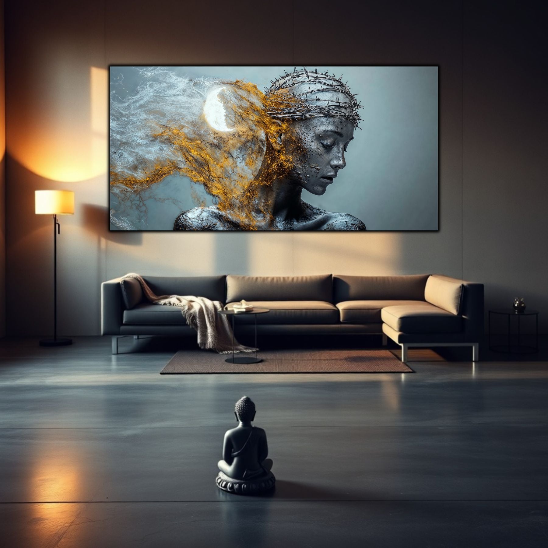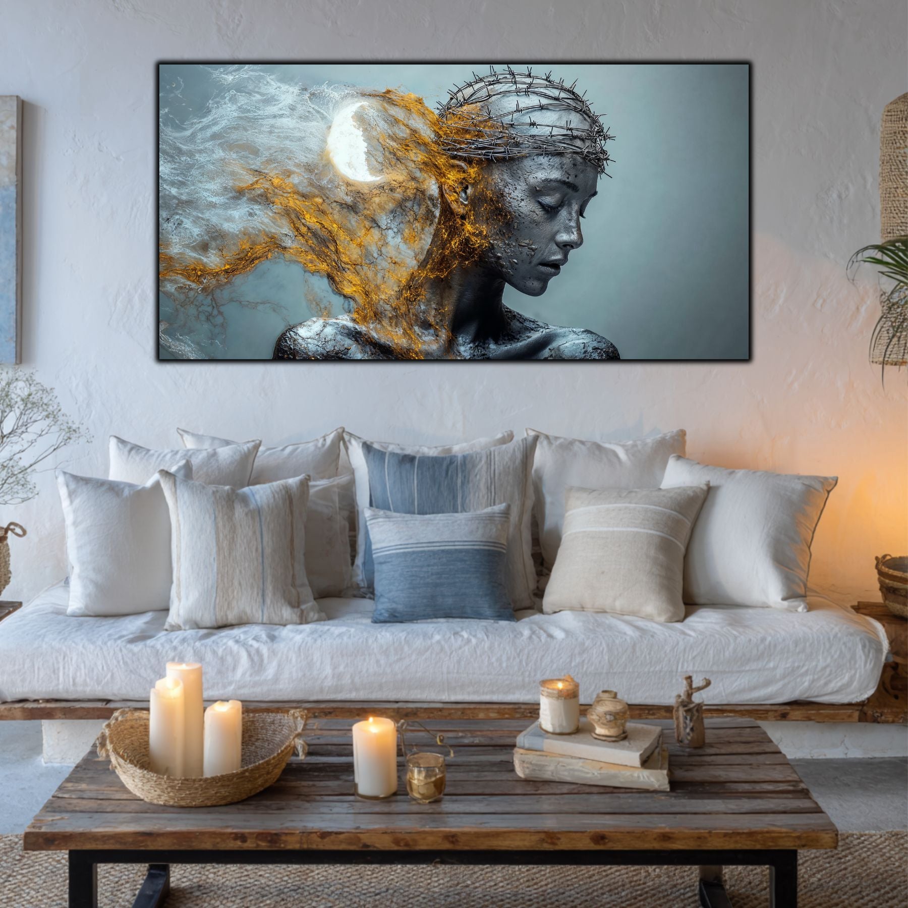 Imaginile prezentate sunt randari digitale realizate pentru a evidentia frumusetea tablourilor. Ele nu respecta proportiile reale in raport cu spatiul, fiind doar o interpretare artistica a modului in care acestea ar putea fi integrate intr-un decor. Va invit sa le „probati” mental pe peretii casei voastre si sa descoperiti cum isi gasesc locul in realitate.