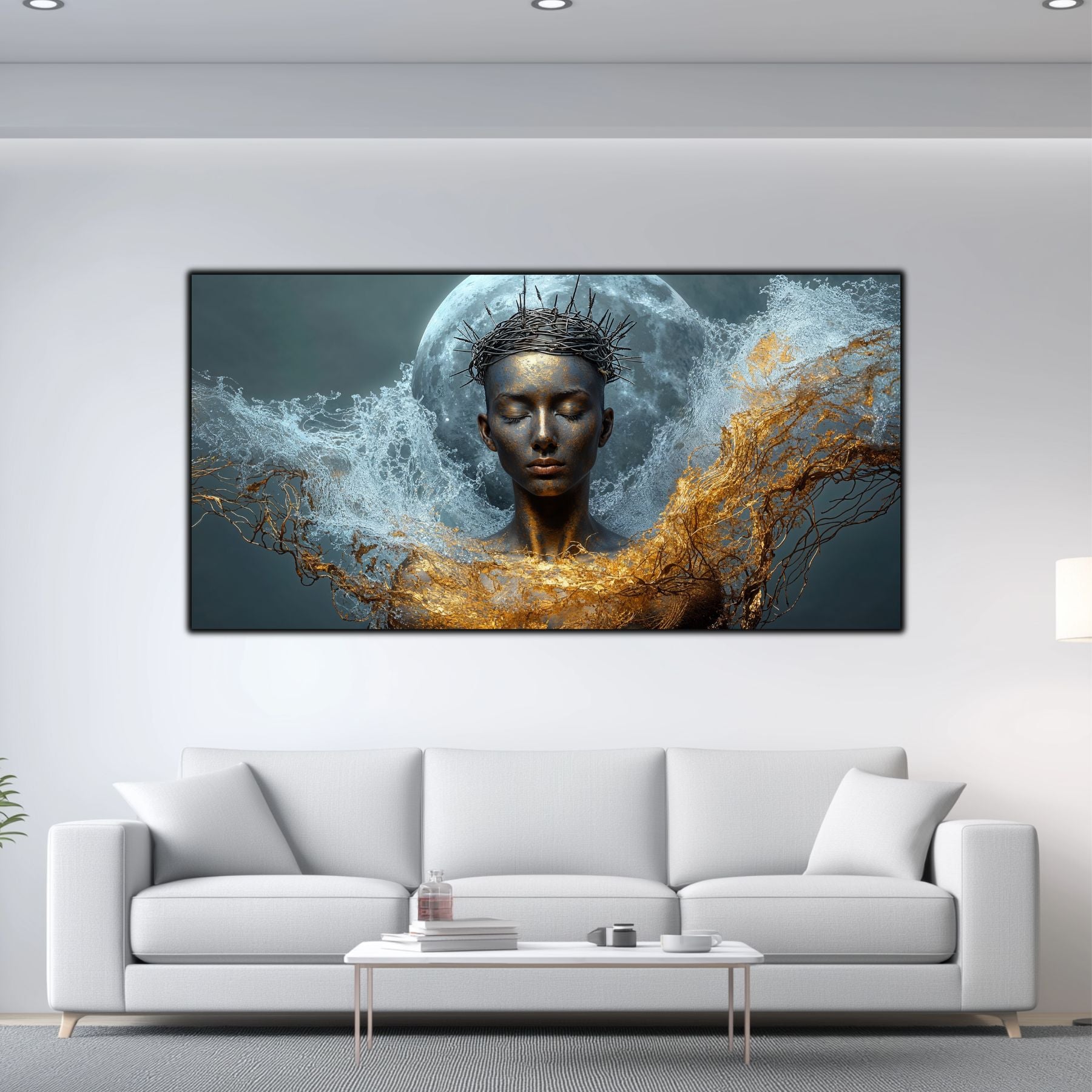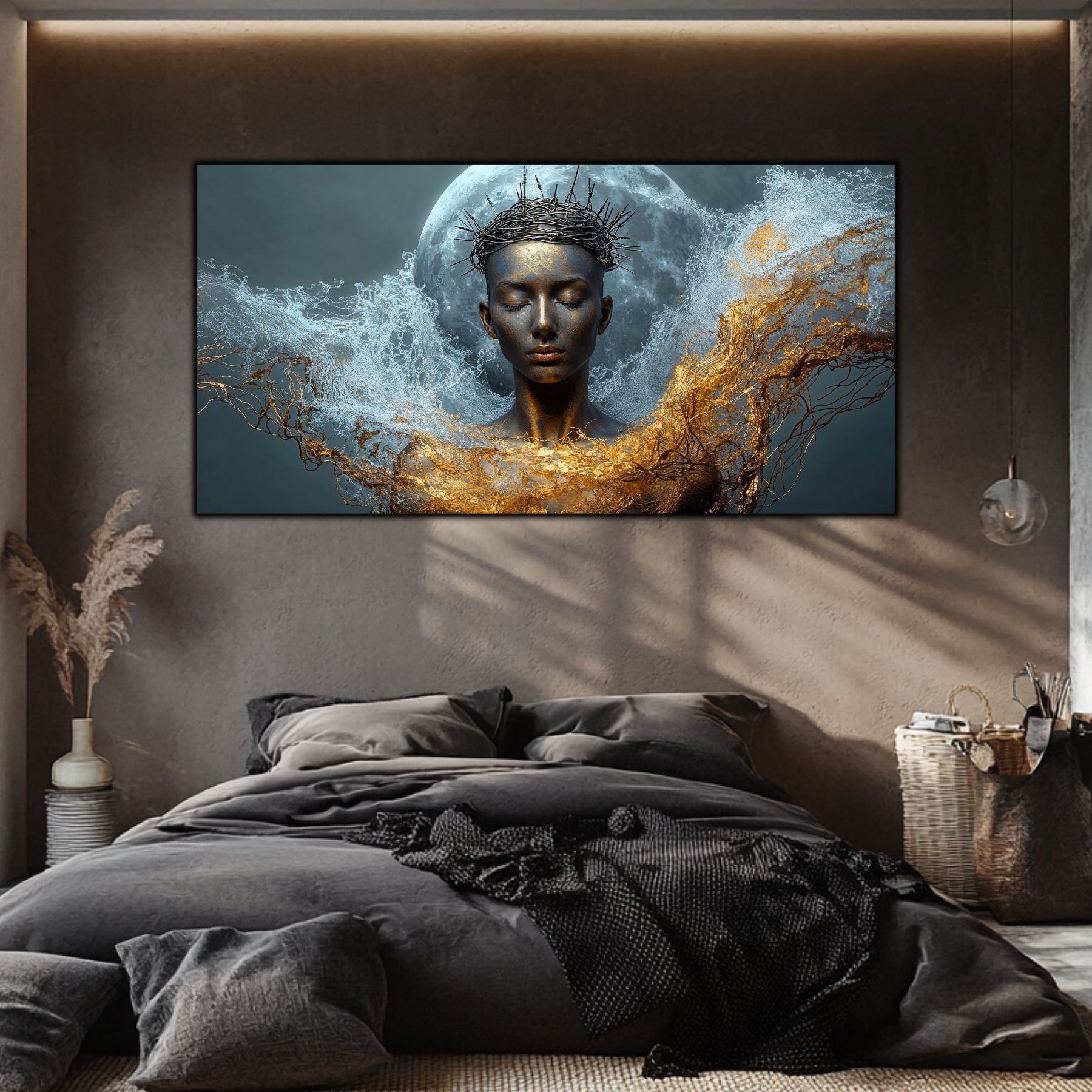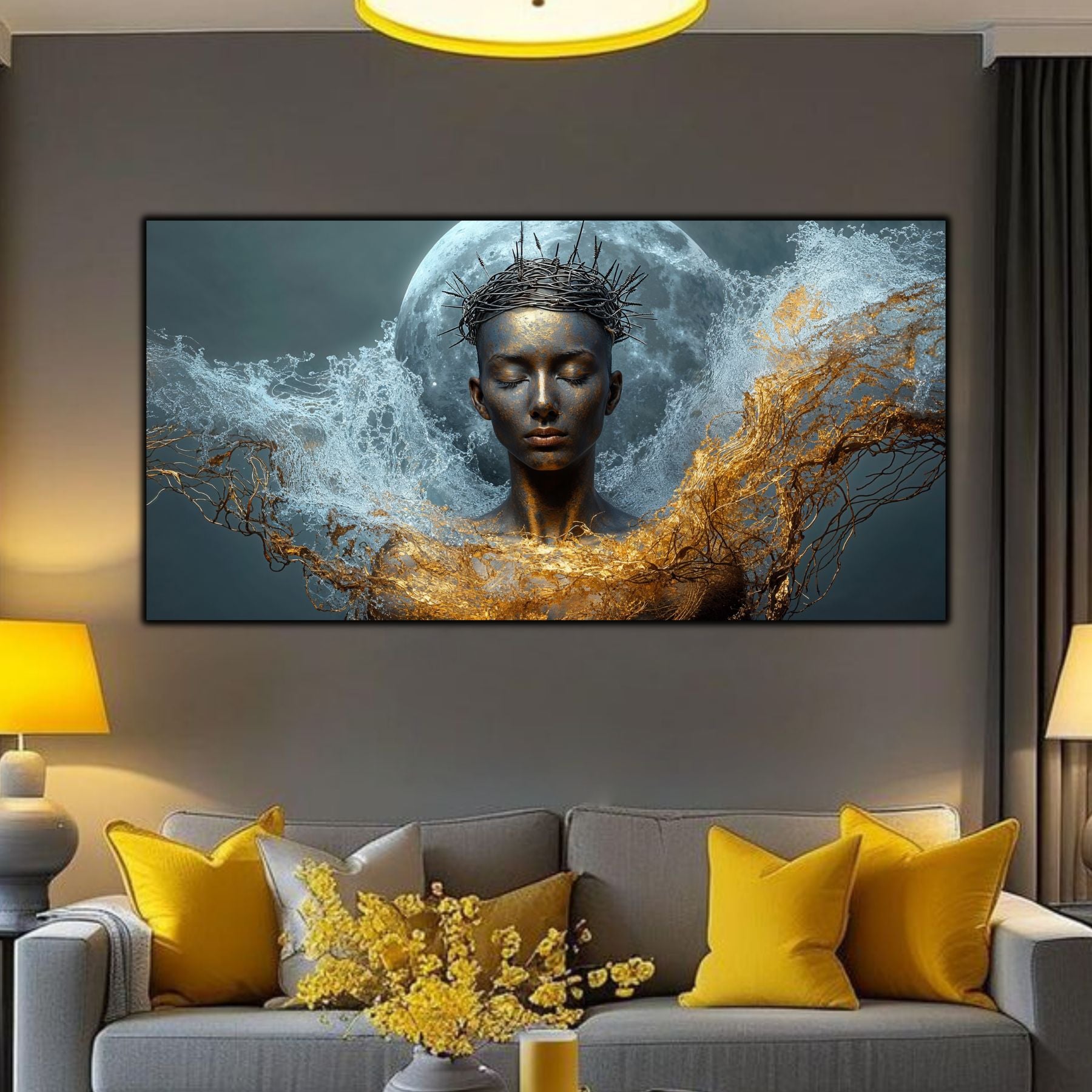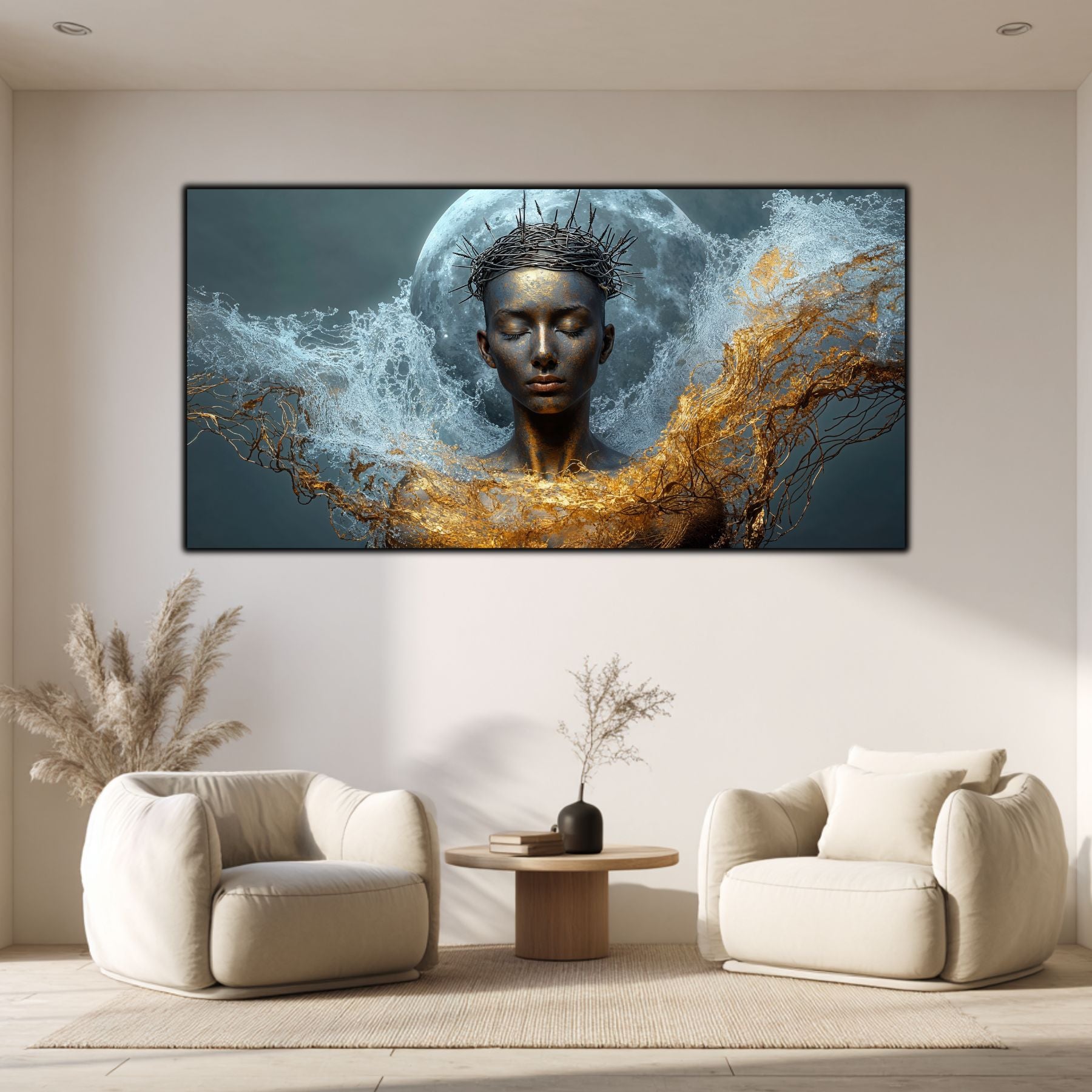 Imaginile prezentate sunt randari digitale realizate pentru a evidentia frumusetea tablourilor. Ele nu respecta proportiile reale in raport cu spatiul, fiind doar o interpretare artistica a modului in care acestea ar putea fi integrate intr-un decor. Va invit sa le „probati” mental pe peretii casei voastre si sa descoperiti cum isi gasesc locul in realitate.