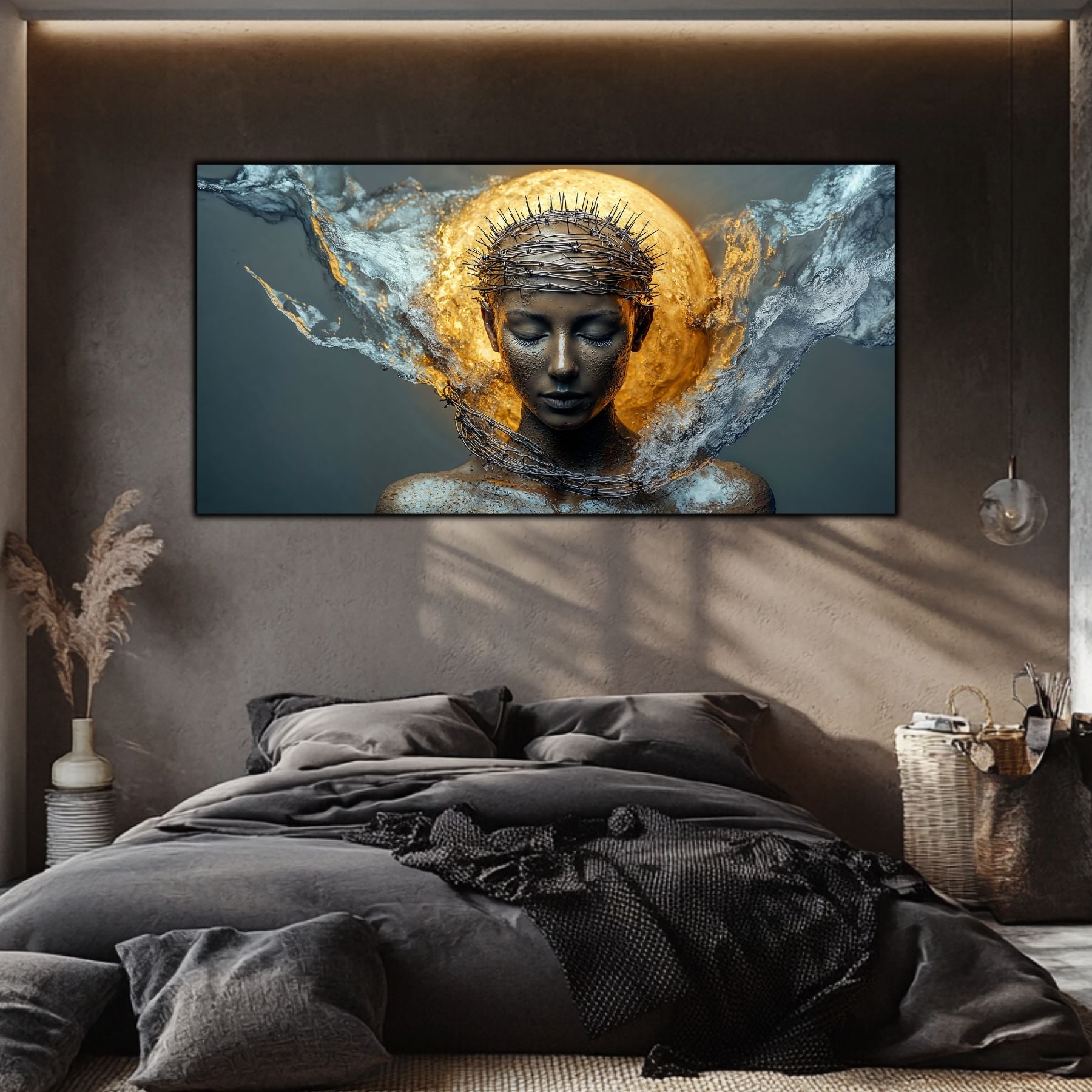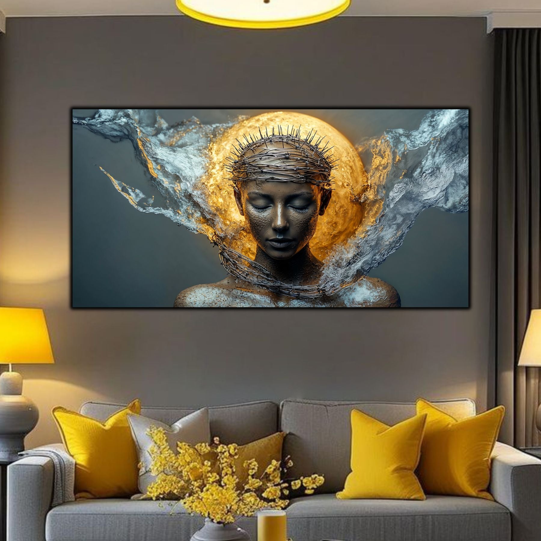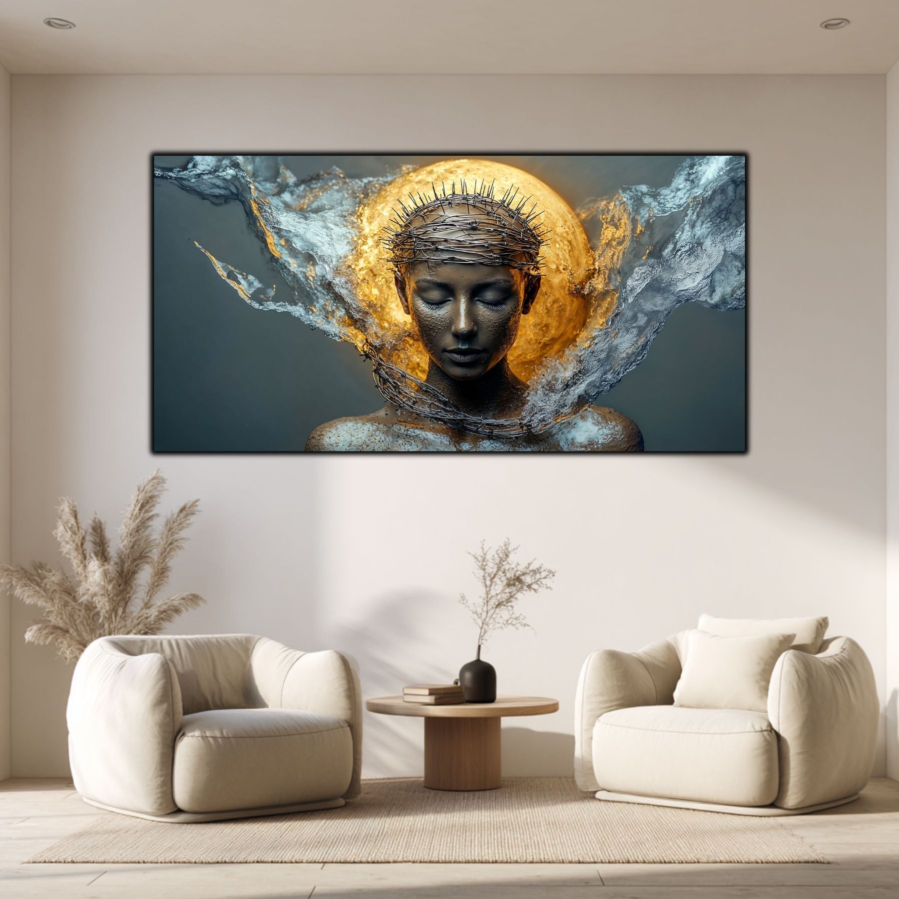 Imaginile prezentate sunt randari digitale realizate pentru a evidentia frumusetea tablourilor. Ele nu respecta proportiile reale in raport cu spatiul, fiind doar o interpretare artistica a modului in care acestea ar putea fi integrate intr-un decor. Va invit sa le „probati” mental pe peretii casei voastre si sa descoperiti cum isi gasesc locul in realitate.