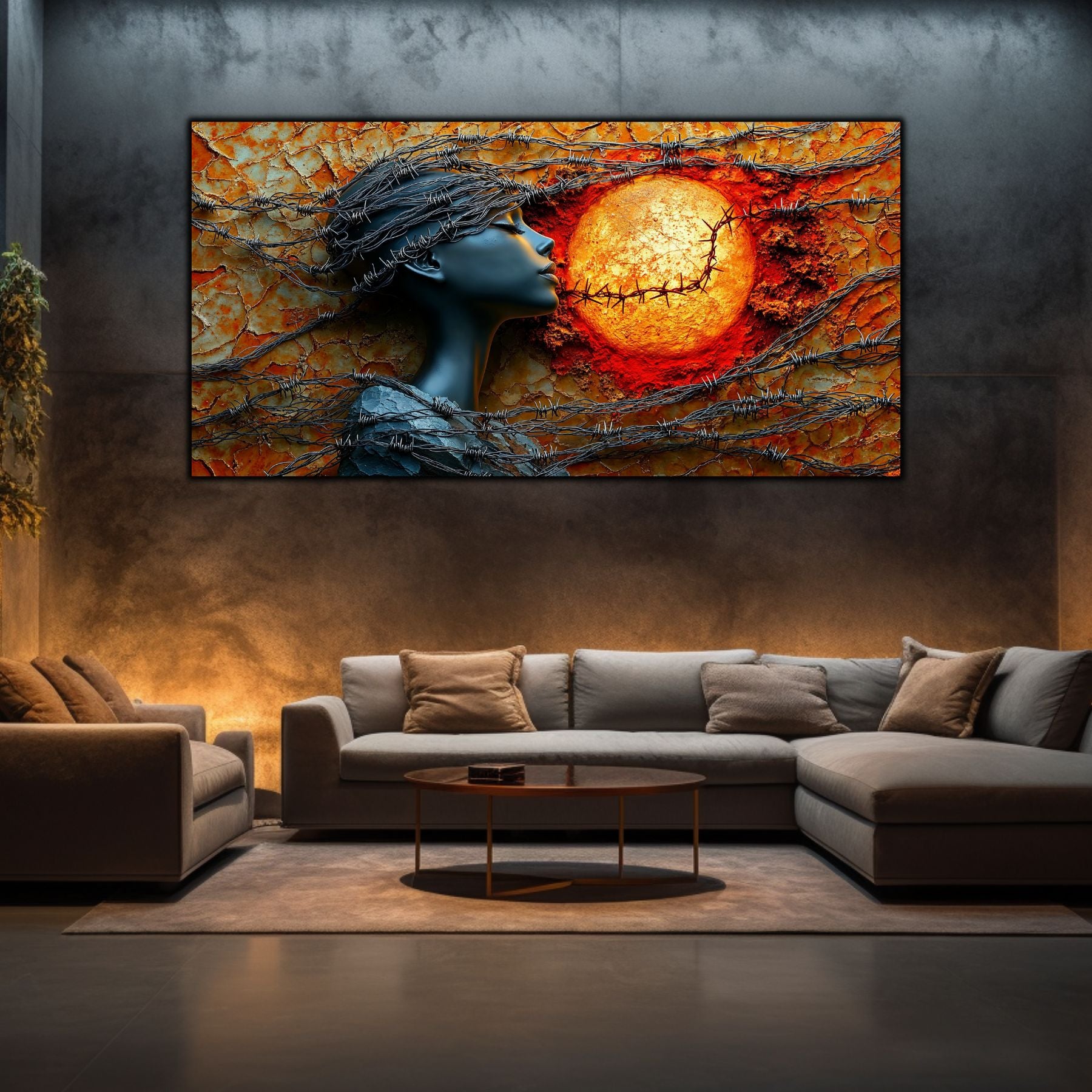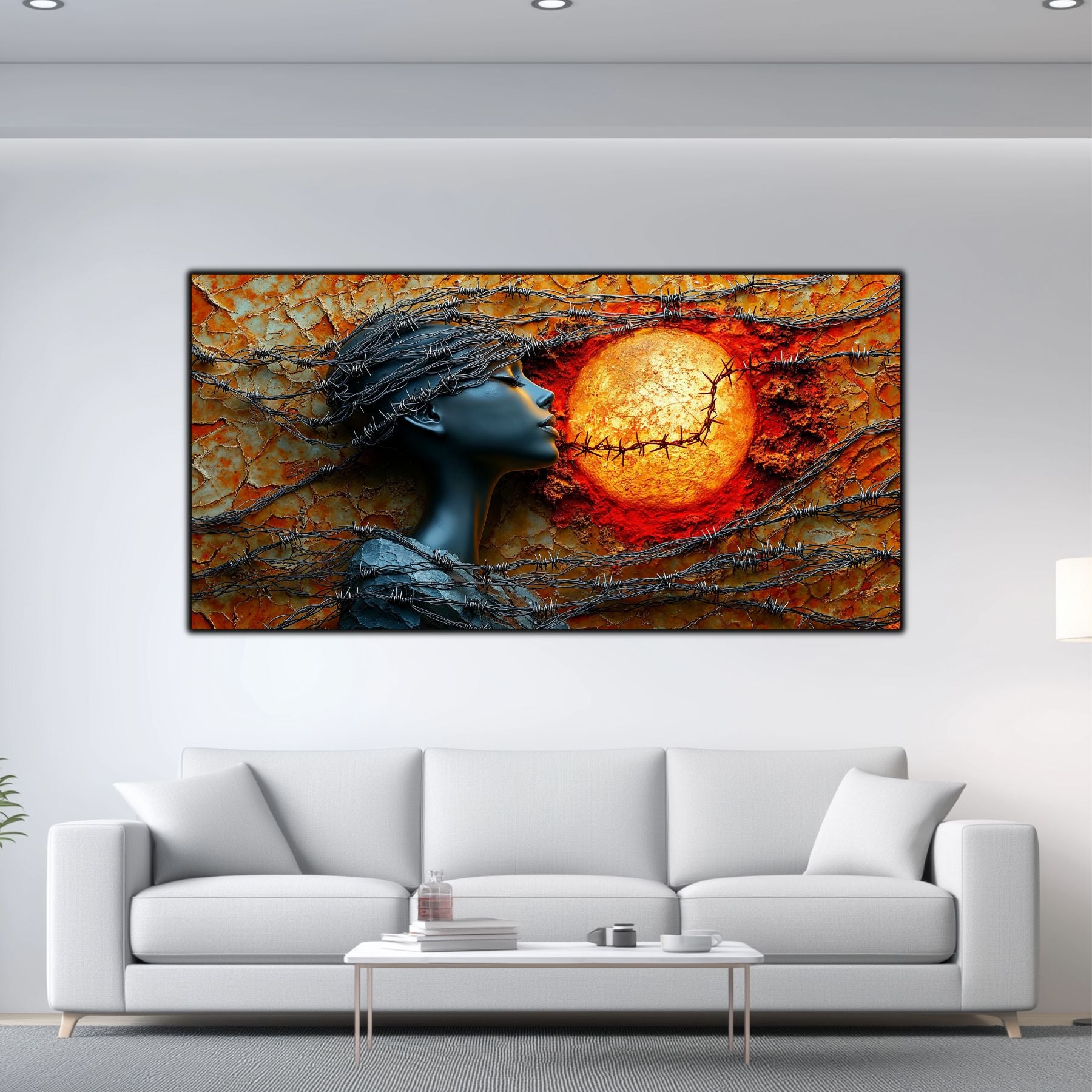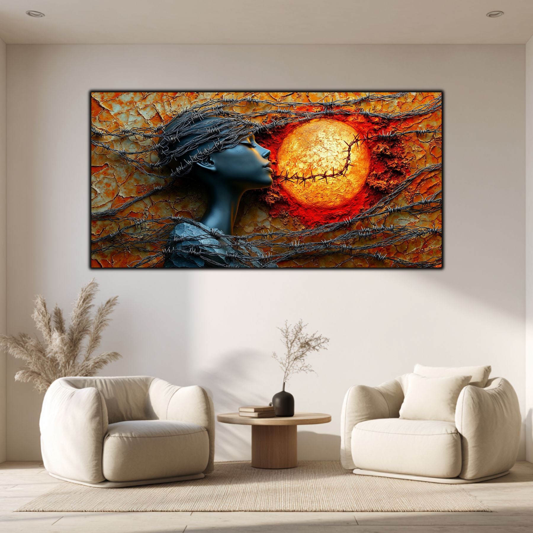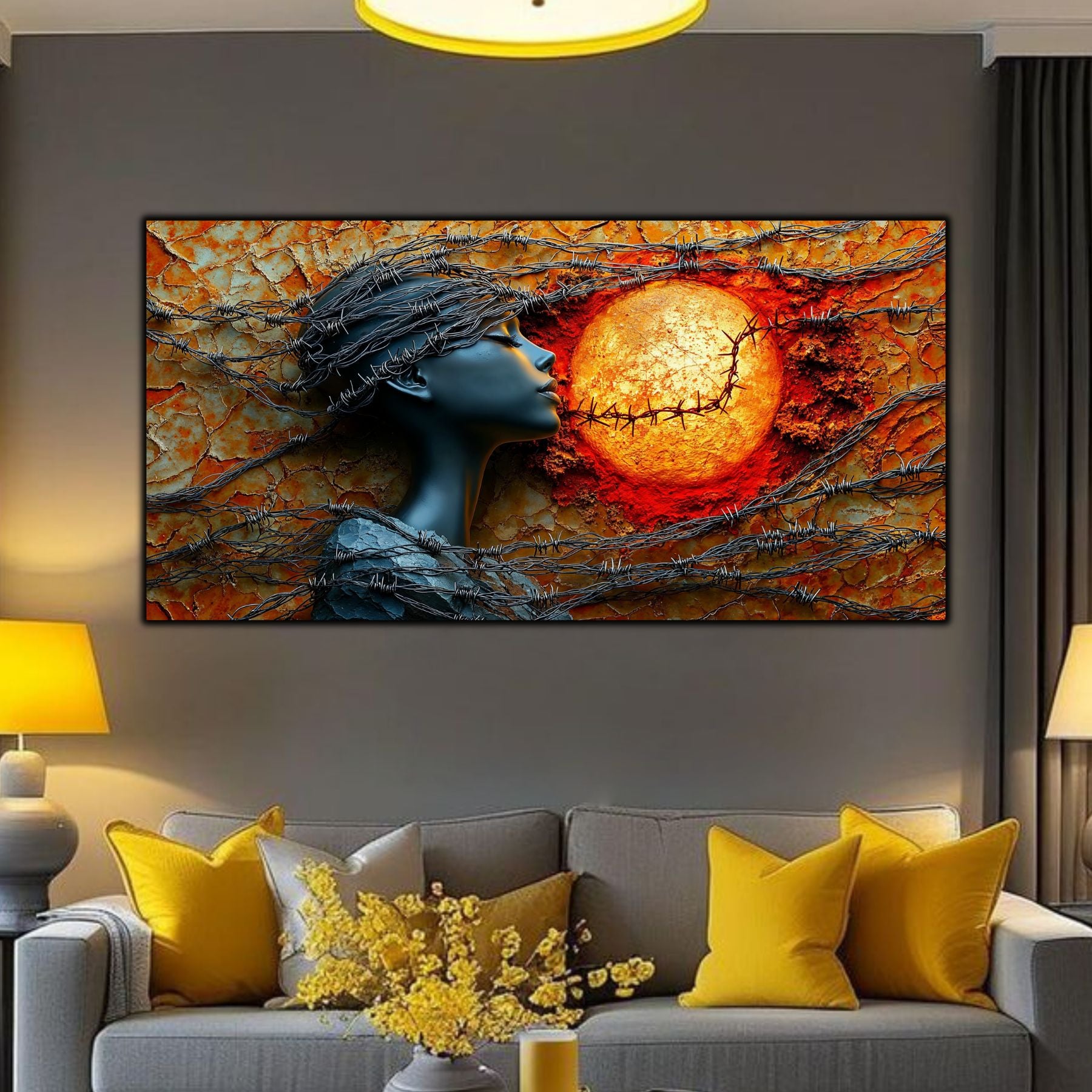Imaginile prezentate sunt randari digitale realizate pentru a evidentia frumusetea tablourilor. Ele nu respecta proportiile reale in raport cu spatiul, fiind doar o interpretare artistica a modului in care acestea ar putea fi integrate intr-un decor. Va invit sa le „probati” mental pe peretii casei voastre si sa descoperiti cum isi gasesc locul in realitate.